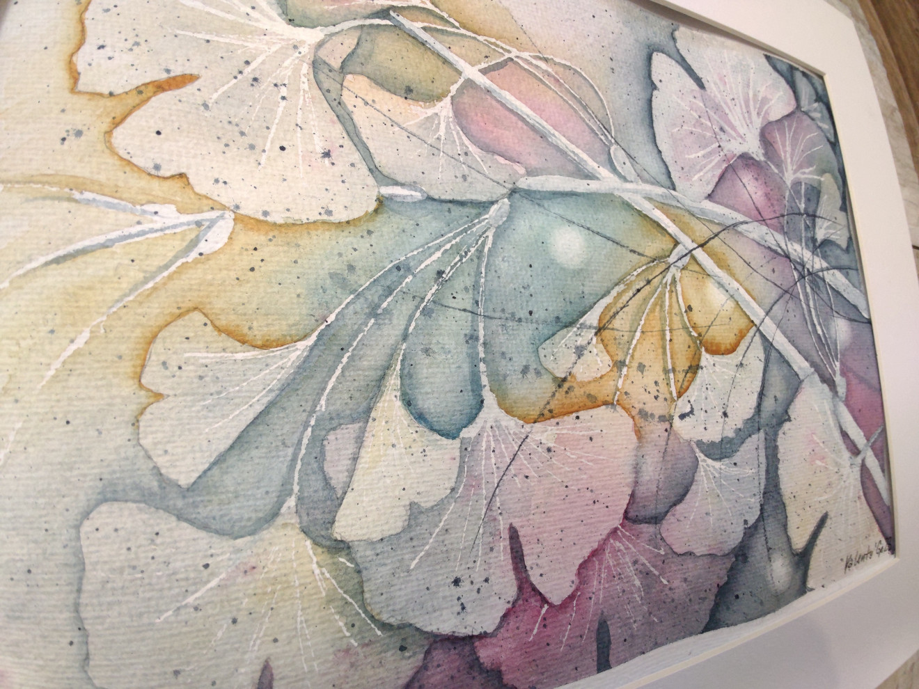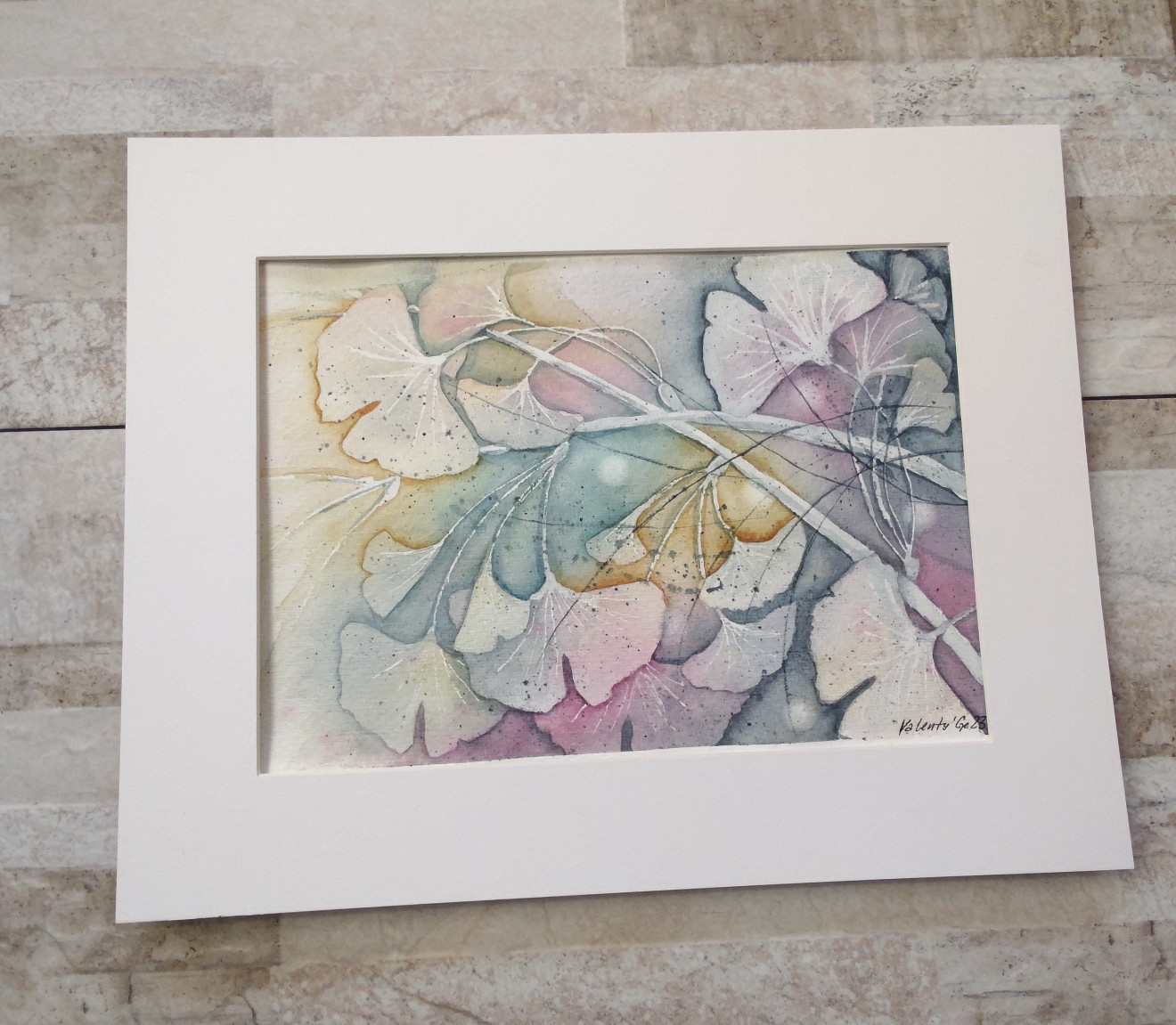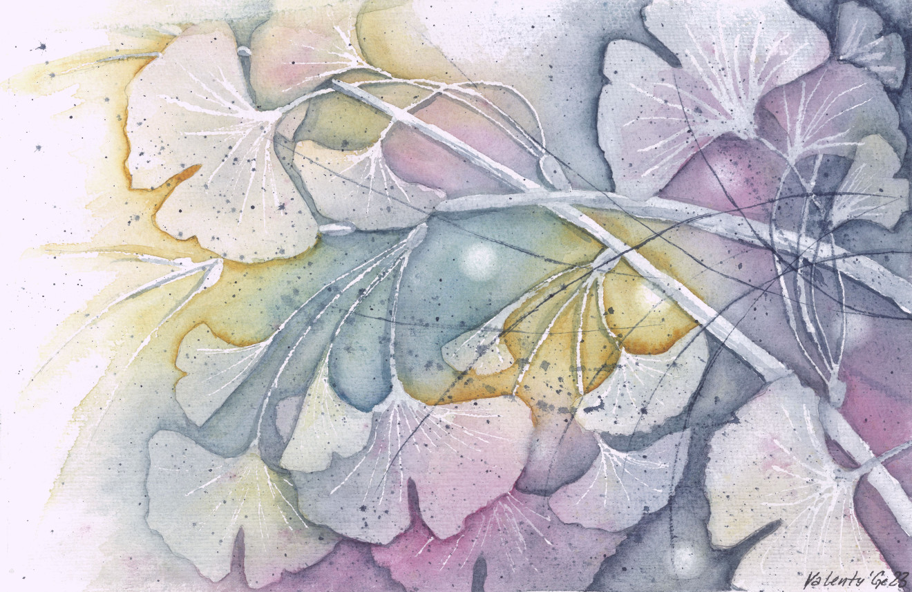 Картина "Гинко Билоба 1", 20х30 см. Използвана техника "негативно рисуване" с акварел върху специална хартия. Истинска наслада бе за мен рисуването на тези нежни ефирни листенца. А техниката "негативно рисуване" си бе предизвикателство и откриване на нов свят от възможности. * Цената е без рамка и паспарту.