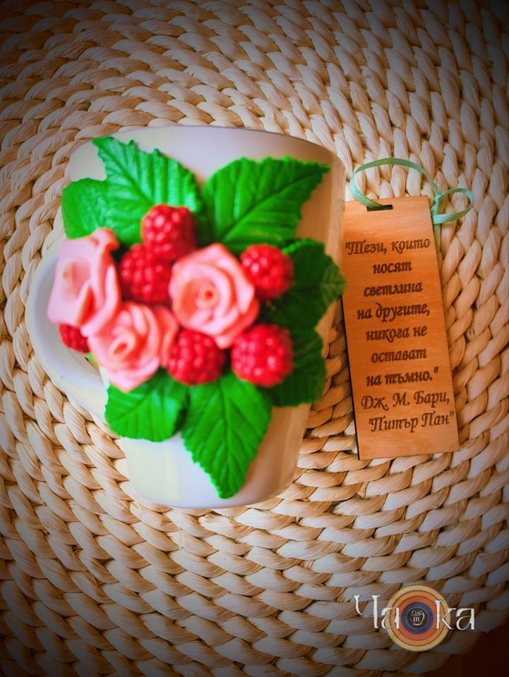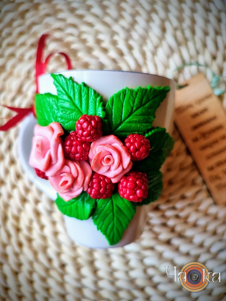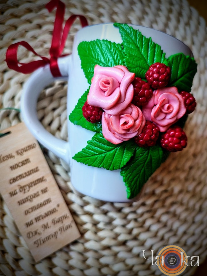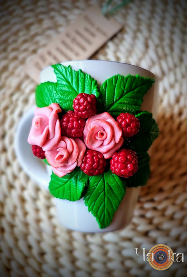 Керамична чаша, ръчно декорирана с рози и малини, изработени от полимерна глина. Времето за изработка е ориентировъчно и допълнително ще бъде уточнено.