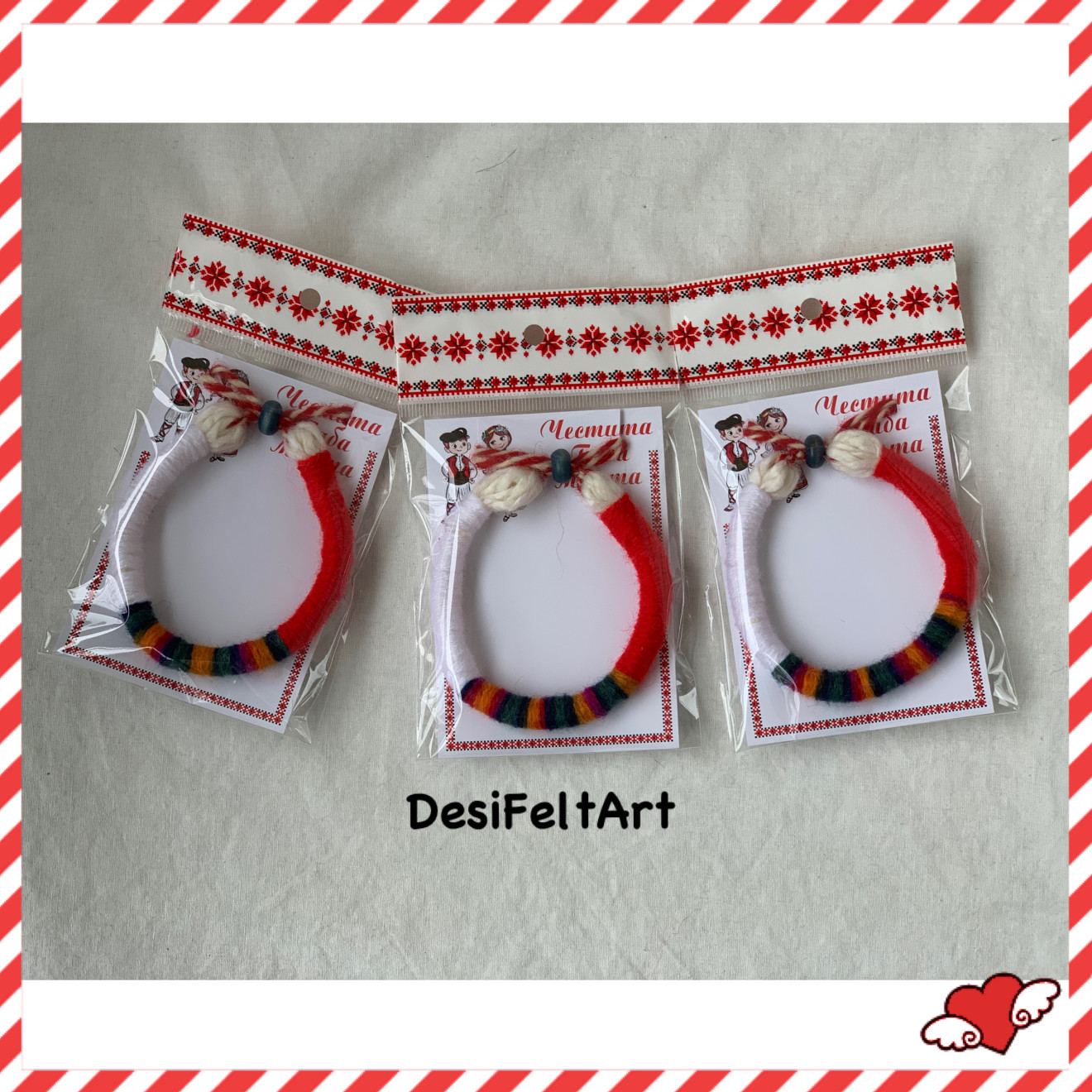 Ръчно изработени мартеници от прежда и дървено мънисто.