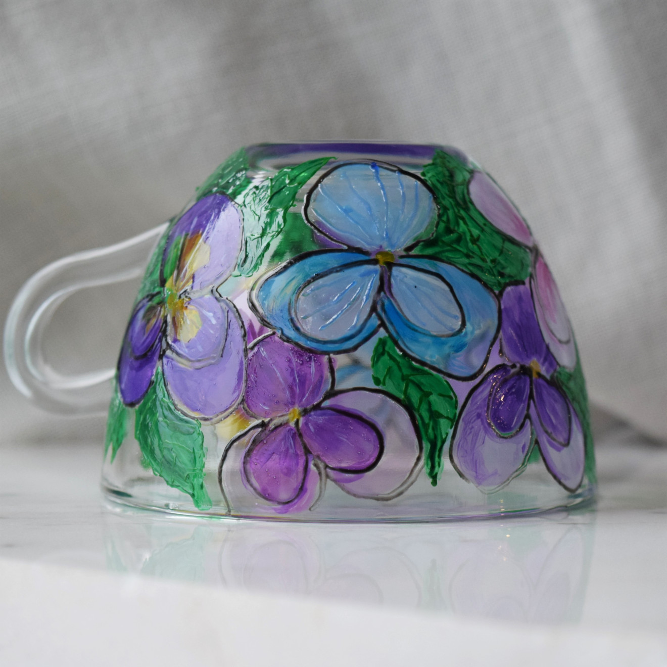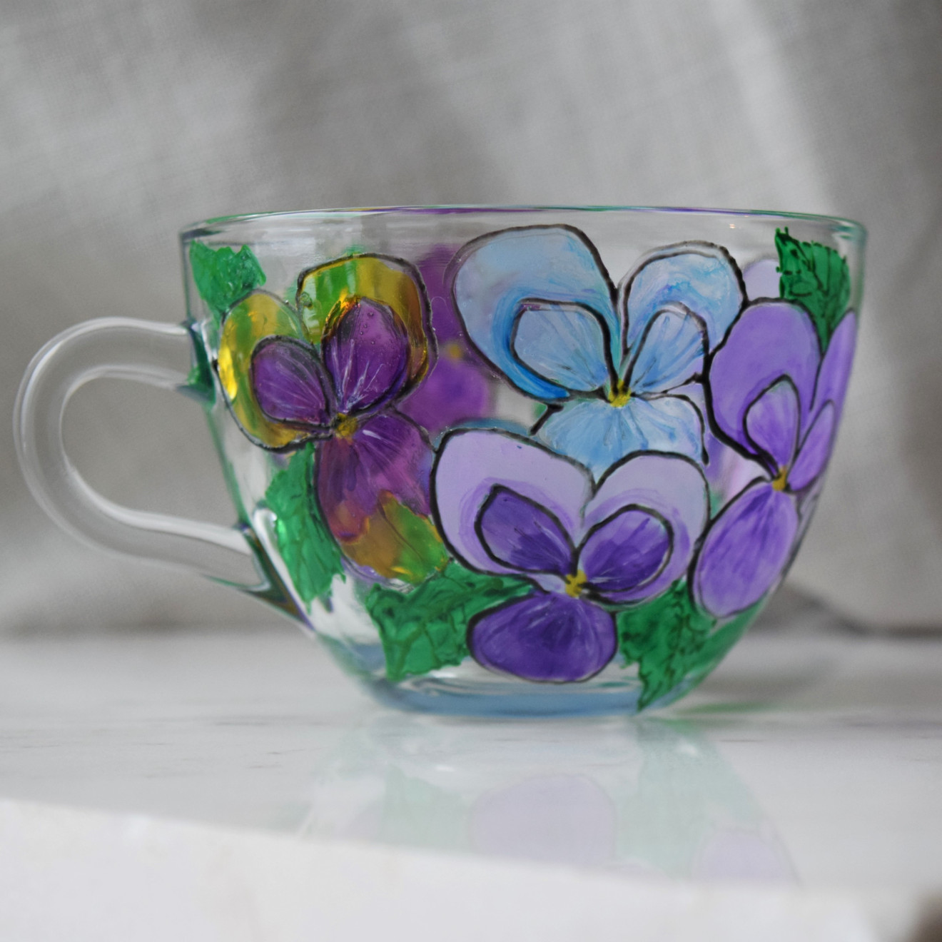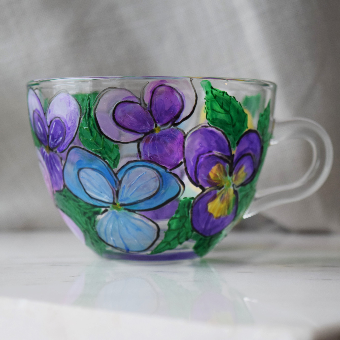 Ръчно рисувана чаша за топли напитки " Теменужки " . Чаша носеща красотата на цветята и пролетта .Страхотна за лична употреба или за подарък . Подарък ,който всеки път ще носи радост и наслада, когато се използва. Размери на чашата : височина 7см , широчина 9см. Използвам бои за стъкло , които гарантират дълготрайност на рисунката , препоръчва се миене на ръка .Може да се напише име или друг надпис по ваше желание . Време за изработка 2-3дни