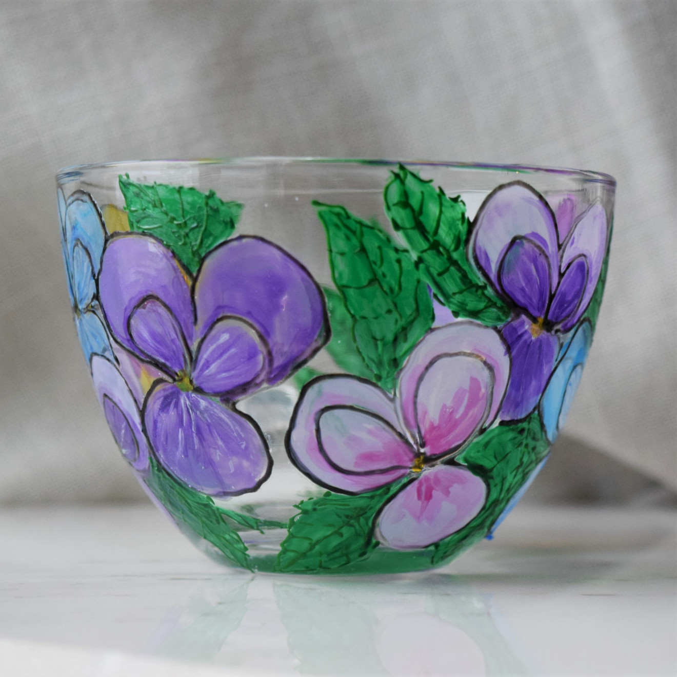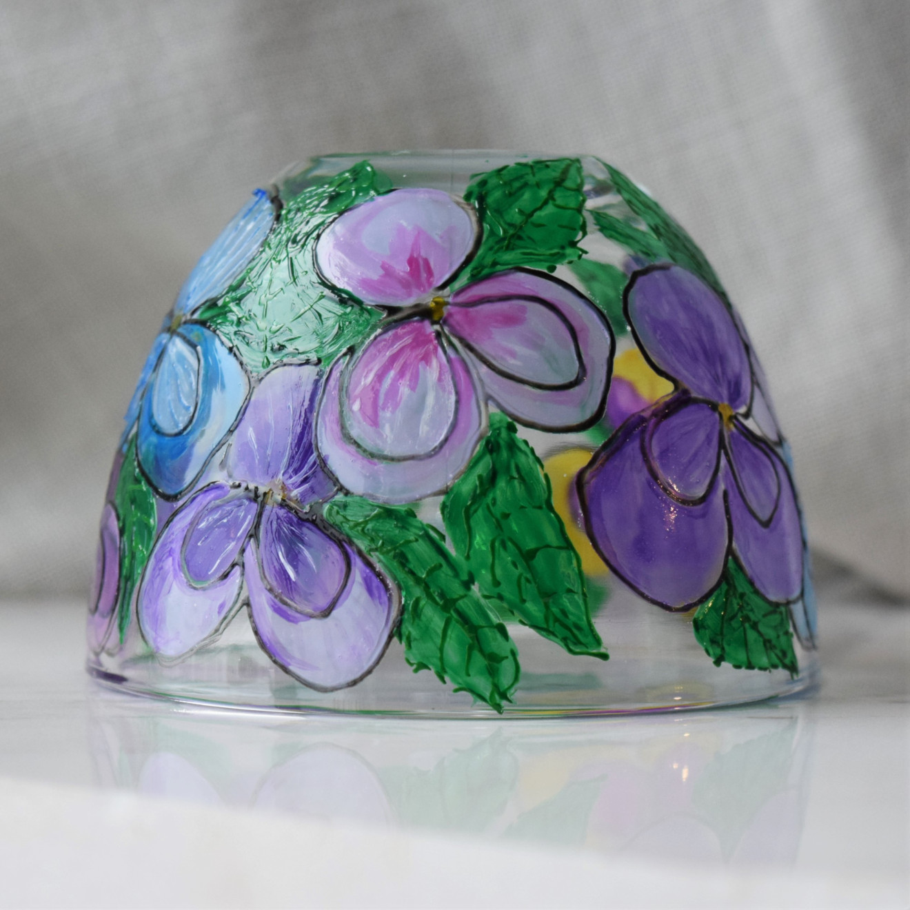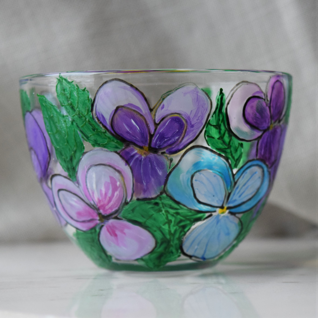 Ръчно рисувана чаша за топли напитки " Теменужки " . Чаша носеща красотата на цветята и пролетта .Страхотна за лична употреба или за подарък . Подарък ,който всеки път ще носи радост и наслада, когато се използва. Размери на чашата : височина 7см , широчина 9см. Използвам бои за стъкло , които гарантират дълготрайност на рисунката , препоръчва се миене на ръка .Може да се напише име или друг надпис по ваше желание . Време за изработка 2-3дни
