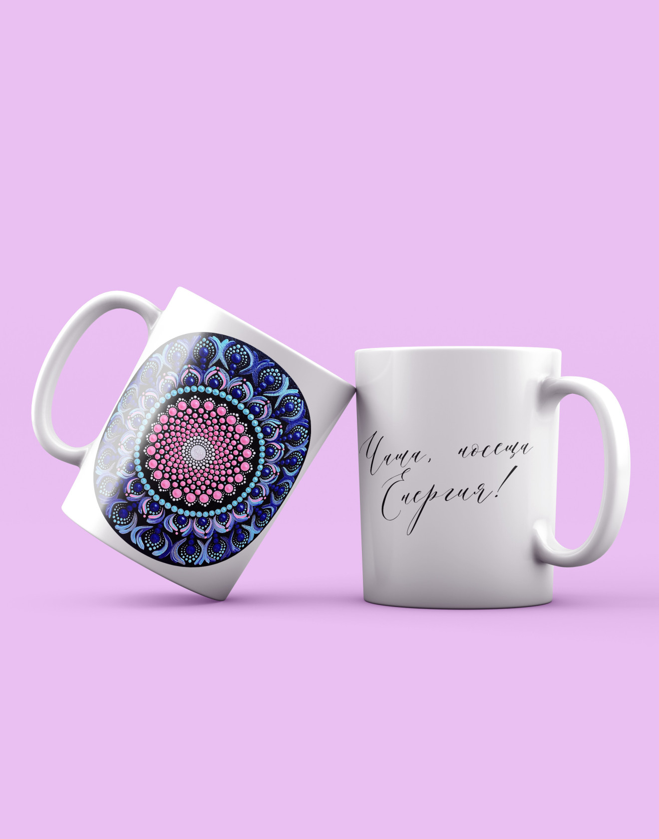 Тъй като не мога да нарисувам картините си на малко пространство като чаша, а на канче изобщо не се рисува, реших да създам серията принт на мои авторски картини. Всяка носи символика с която ще ви запозная тук. ? Розовият цвят символизира любовта, но онази, висшата, Божетсвената, кармичната. Тази, която заслужаваме да ни се даде. Розовото ще ви избави от стреса и ще ви донесе любов. Може да отключи талантите ви.Вярата в чудесата и вълшебствата- това е розовото. ? Синият цвят в мандалата е духовността. В зависимост от нюансите си, той може да въздейства по различен начин. Може да е както жертвоготовността, така и връзката с Божетсвеното. Свързва се с интуицията, с края и възраждането. В тъмните си тонове, той носи сила и воля и засилва издръжливостта ви. Действа добре на нервната система. Ако сте егоцентрик, тъмносиньото не трябва да е преобладаващ в мандалата ви. В светлите си нюанси е символ на живота и на чистотата. Засилва умението ви да се справяте с трудностите сами. ? Бяло…мир, сняг, чистота и свобода. В мандалата ще ви помогне да премахнете препятствията, но и ще ви покаже, че сте си самодостатъчни. Ще ви донесе вяра в собствените сили. Означава, че вие сте готови за ново начало и го започвате. Обновява енергията ви и оздравява организма. Бялото изчиства ума ви и ви подготвя за духовно развитие. Това е цвета на магията и на тайните учения. Изображенията са със запазени авторски права ! За по-голяма бройка мога да направя отстъпка ! Работя с ЕКОНТ ! Мога да издам фактура ! За чашката: Височина: 9 см Диаметър: 8 см Вместимост: 330 мл