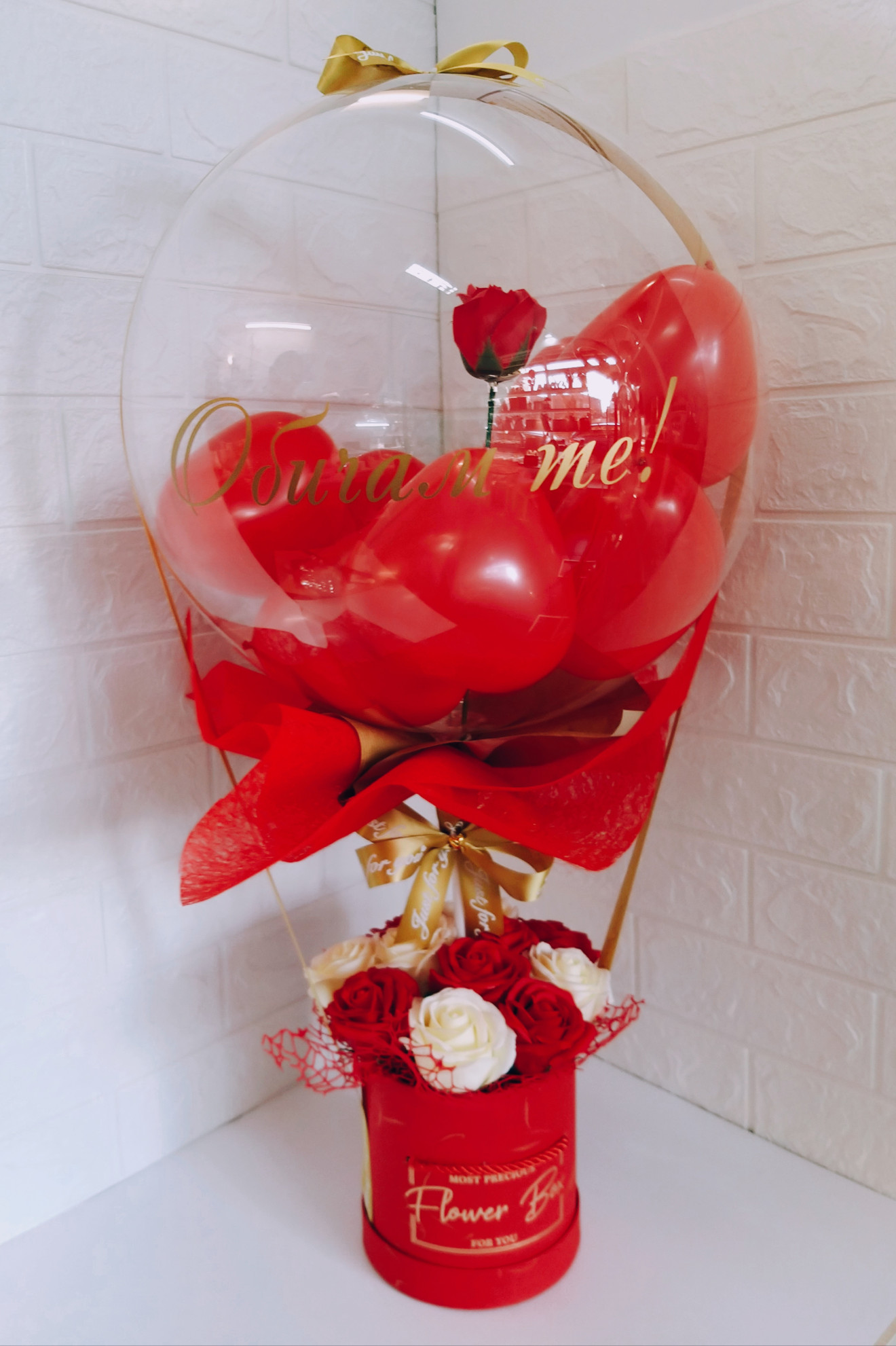 Ефектен подарък за вашата любима! Голям балон пълен с малки балони сърца и надпис "Обичам те ", поднесен в кутия пълна с ароматни сапунени рози.