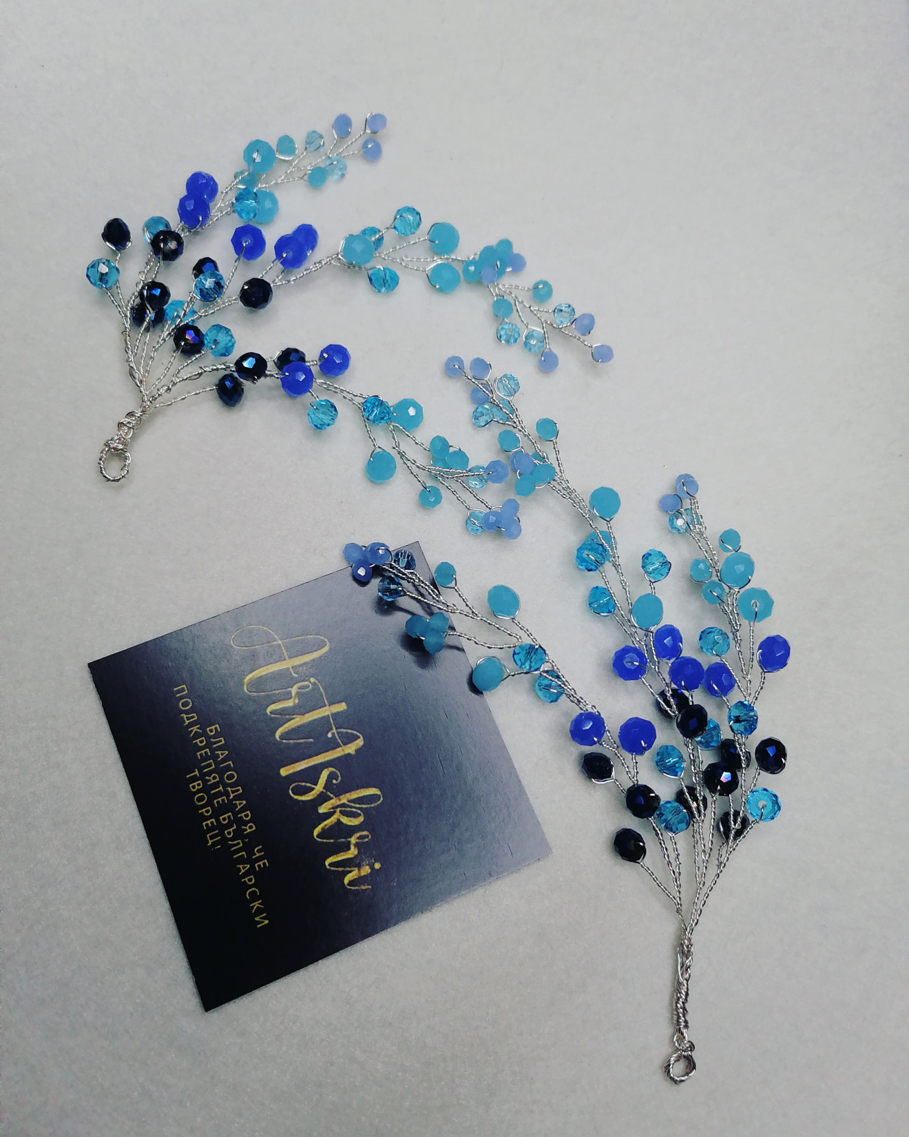 Изработени от тел с лаково покритие, която не позволява окисляване и стъклени кристали в няколко нюанса синьо. Подходящи за различни празнични поводи, сцена, фотосесия и др. Могат да се изработят и в други цветове. Посочената цена е за брой.