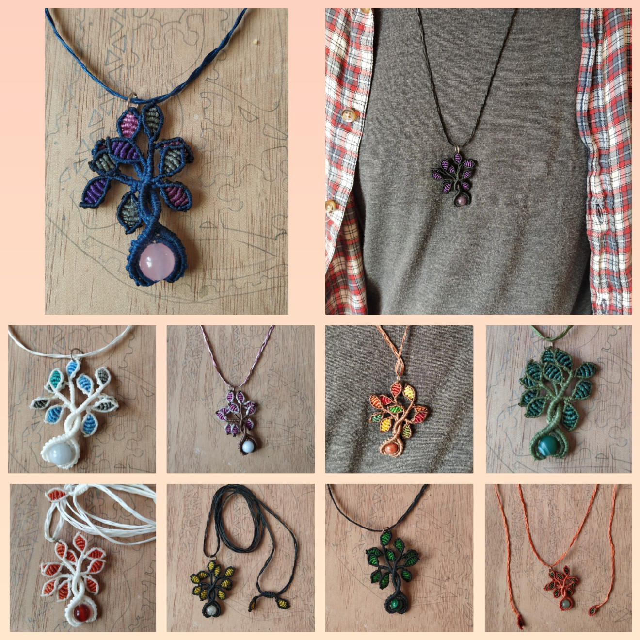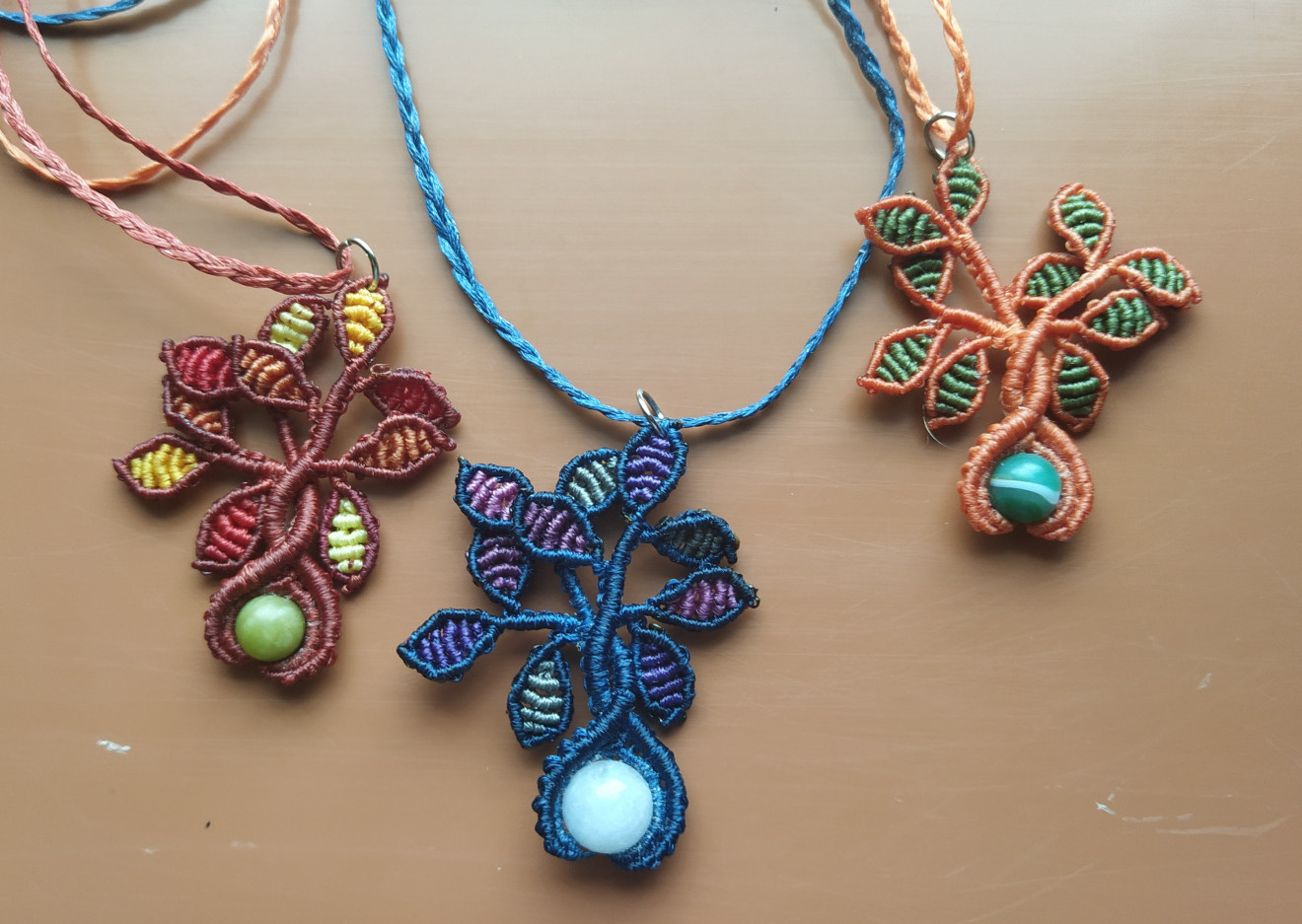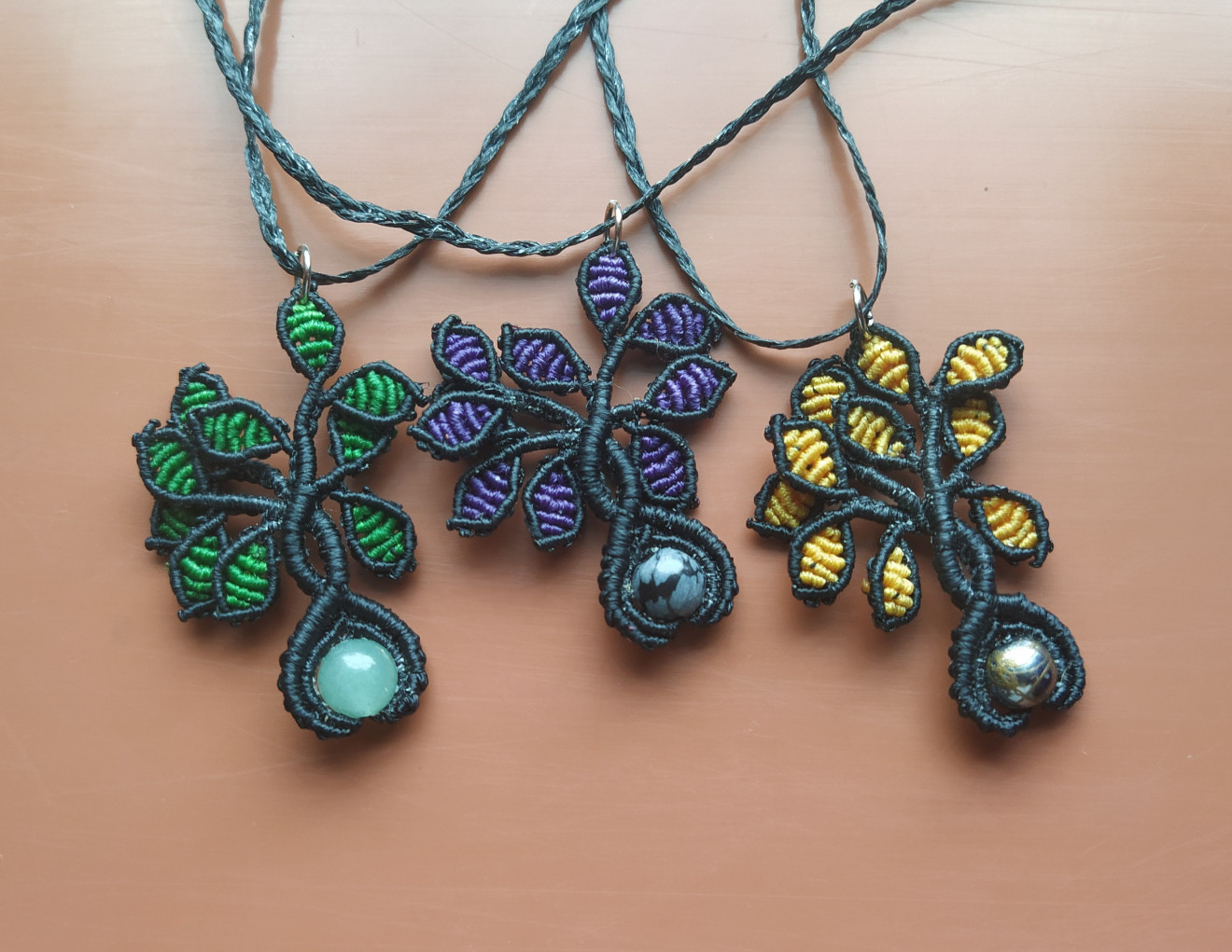 Дръвчетата са изработени от восъчни конци, мънисто от естествен камък и техниката макраме. Верижката е плетена също от восъчни конци, дължината и е над метър, за да може да се промуши през главата и да се стегне и носи на желаната от Вас дължина. Дръвчетата могат да се изработят във всякакви цветови комбинации, големината и броя листенца също може да е по желание. Към момента има налични: - оранжево със зелени листенца и камък зелен Ахат; - тъмно синьо с лилави, сиви, розови листенца и камък Аквамарин; - тъмно червено с жълти, червени, оранжеви листенца и камък Жадеит, не е налично, може да се изработи по поръчка; - черно с лилави листенца и камък Обсидиан; - черно с жълти листенца и камък Хематит; - черно със зелени листенца и камък Авантюри; - бяло с оранжеви листенца и мънисто с преливащ оранжев цвят; - кафяво с розови листенца и камък Аквамарин; Също може да разгледате останалите ми обяви с комплекти, в които има още колиета дръвчета - пролет, лято, есен, зима, бонбонено, лилаво, червено, бяло с червено. Могат да се поръчат отделно. За допълнителна информация или въпроси, моля, не се колебайте да се свържете с мен.