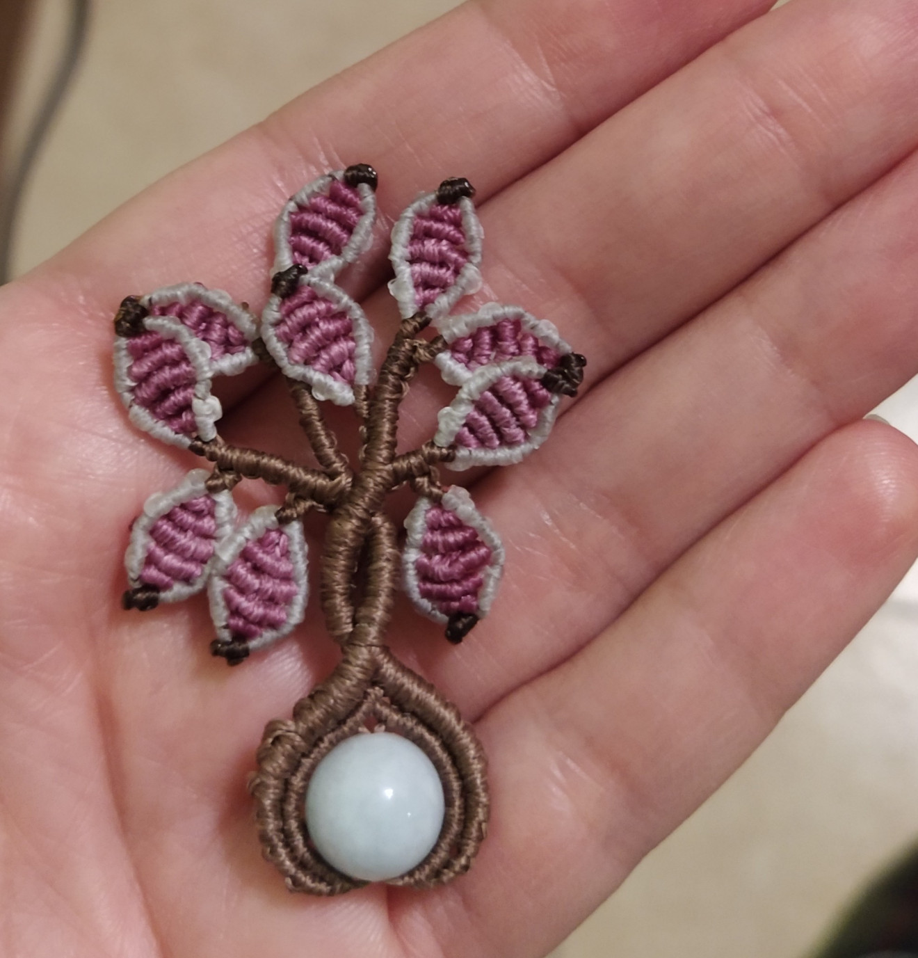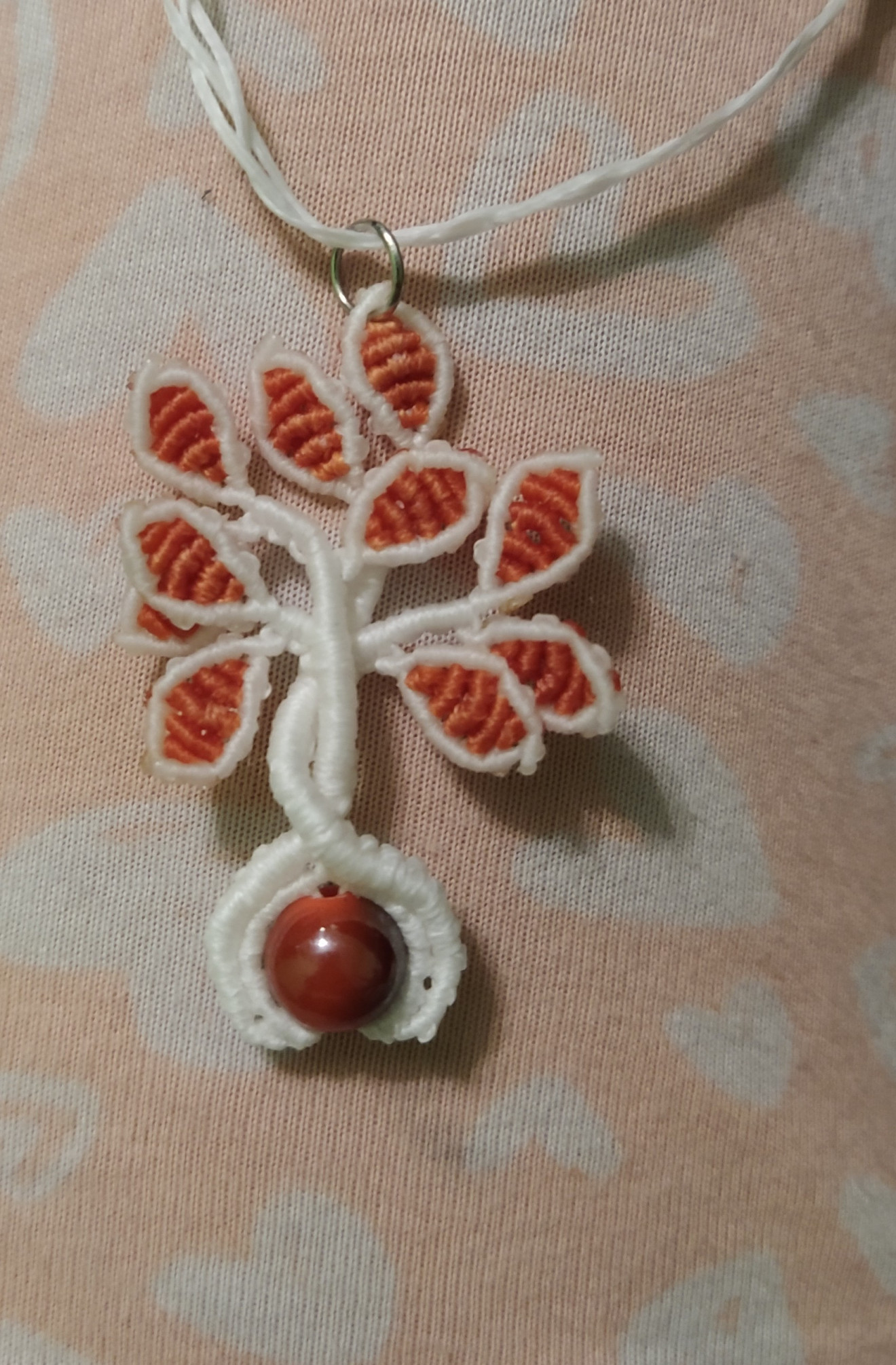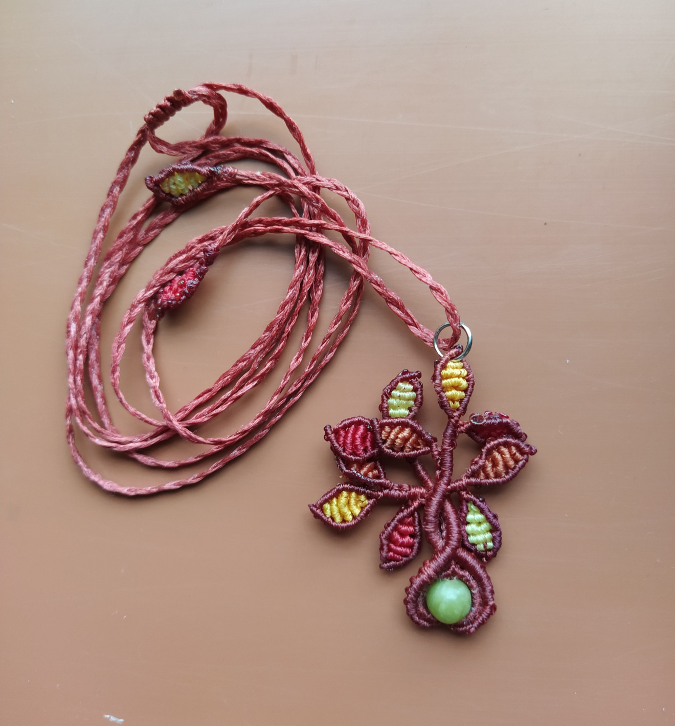 Дръвчетата са изработени от восъчни конци, мънисто от естествен камък и техниката макраме. Верижката е плетена също от восъчни конци, дължината и е над метър, за да може да се промуши през главата и да се стегне и носи на желаната от Вас дължина. Дръвчетата могат да се изработят във всякакви цветови комбинации, големината и броя листенца също може да е по желание. Към момента има налични: - оранжево със зелени листенца и камък зелен Ахат; - тъмно синьо с лилави, сиви, розови листенца и камък Аквамарин; - тъмно червено с жълти, червени, оранжеви листенца и камък Жадеит, не е налично, може да се изработи по поръчка; - черно с лилави листенца и камък Обсидиан; - черно с жълти листенца и камък Хематит; - черно със зелени листенца и камък Авантюри; - бяло с оранжеви листенца и мънисто с преливащ оранжев цвят; - кафяво с розови листенца и камък Аквамарин; Също може да разгледате останалите ми обяви с комплекти, в които има още колиета дръвчета - пролет, лято, есен, зима, бонбонено, лилаво, червено, бяло с червено. Могат да се поръчат отделно. За допълнителна информация или въпроси, моля, не се колебайте да се свържете с мен.