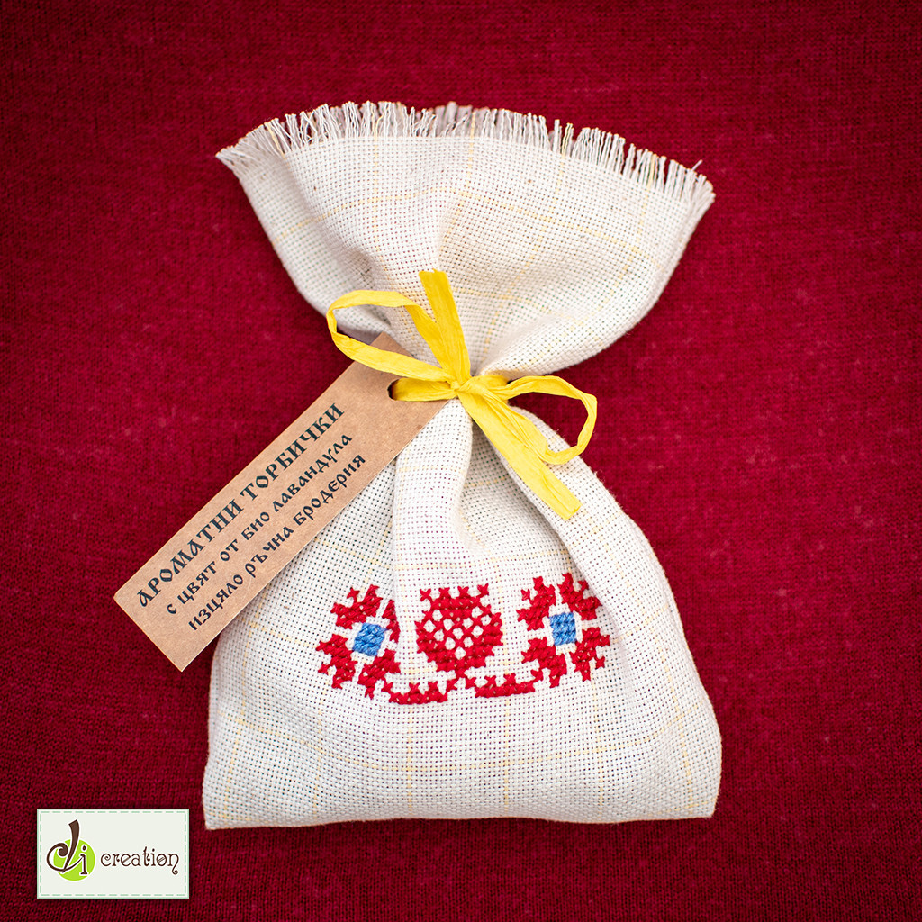 Ароматна торбичка с цвят от био лавандула. Изцяло ръчна бродерия. Мотив от мъжка риза от с. Обретеник, Русенско.