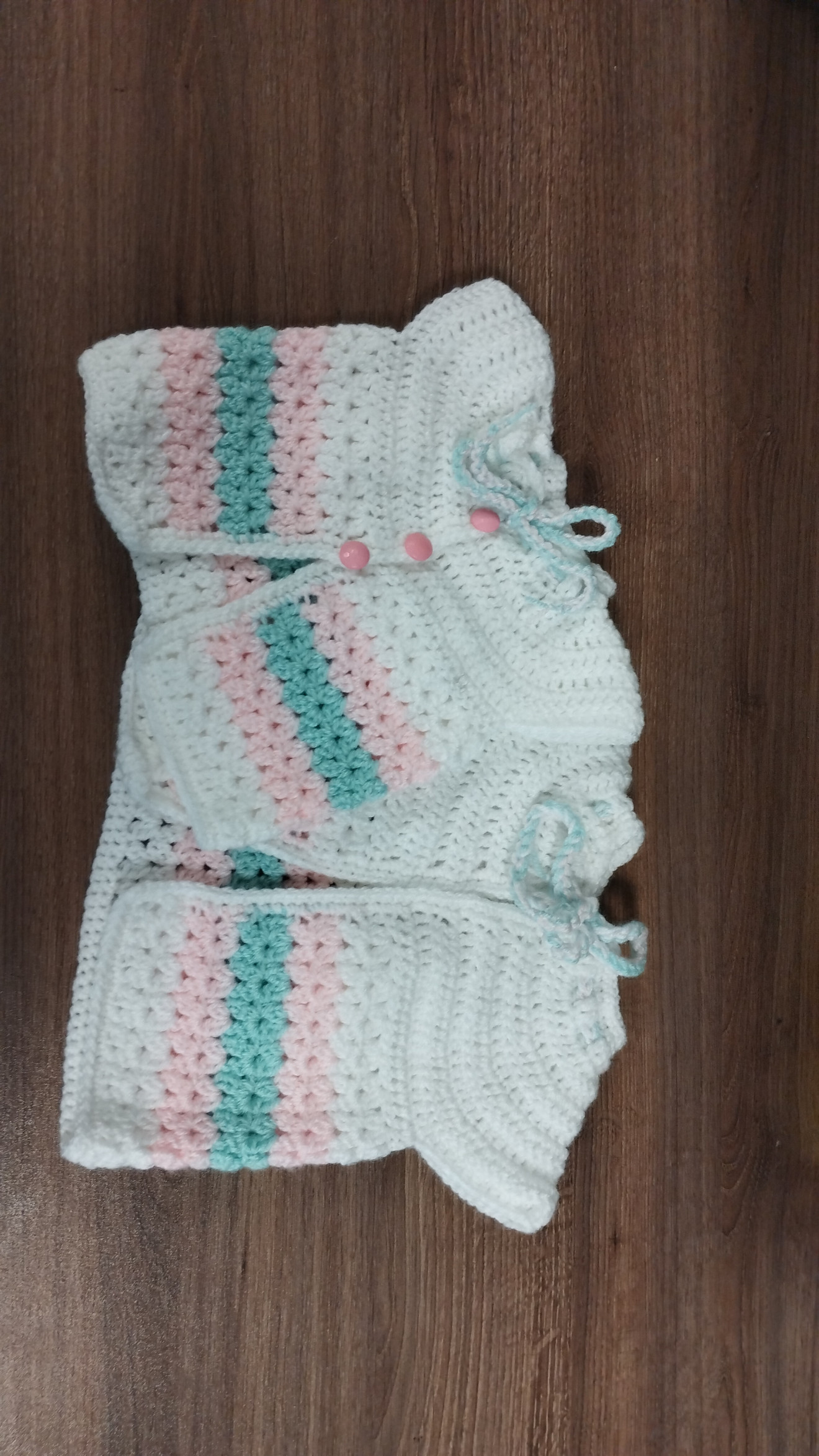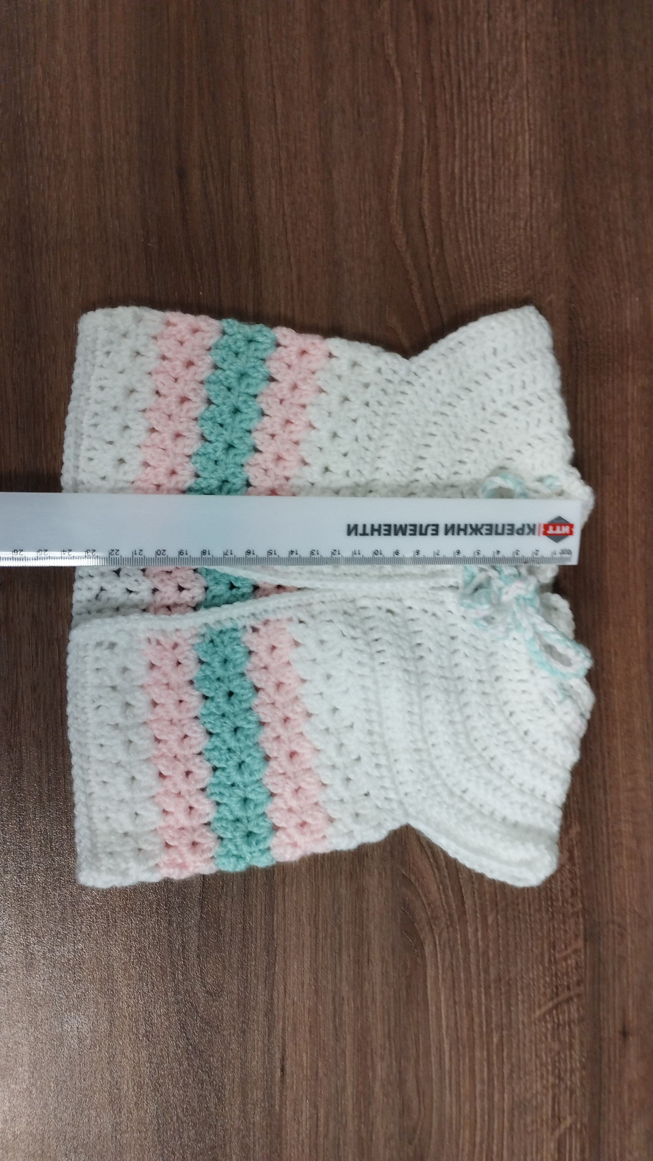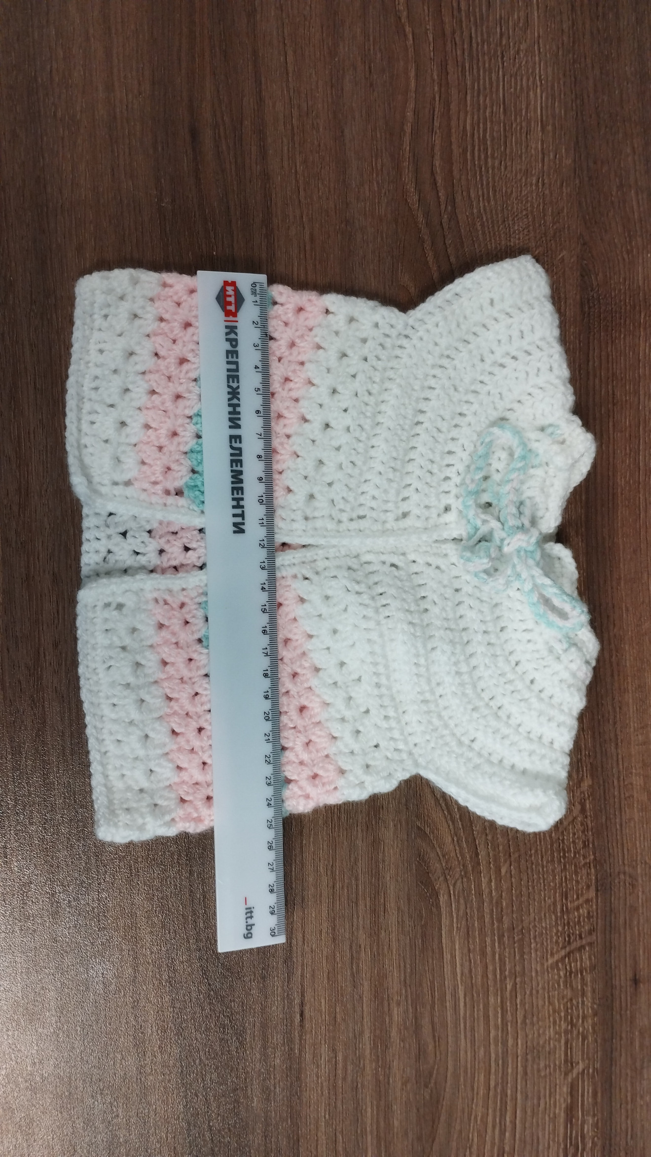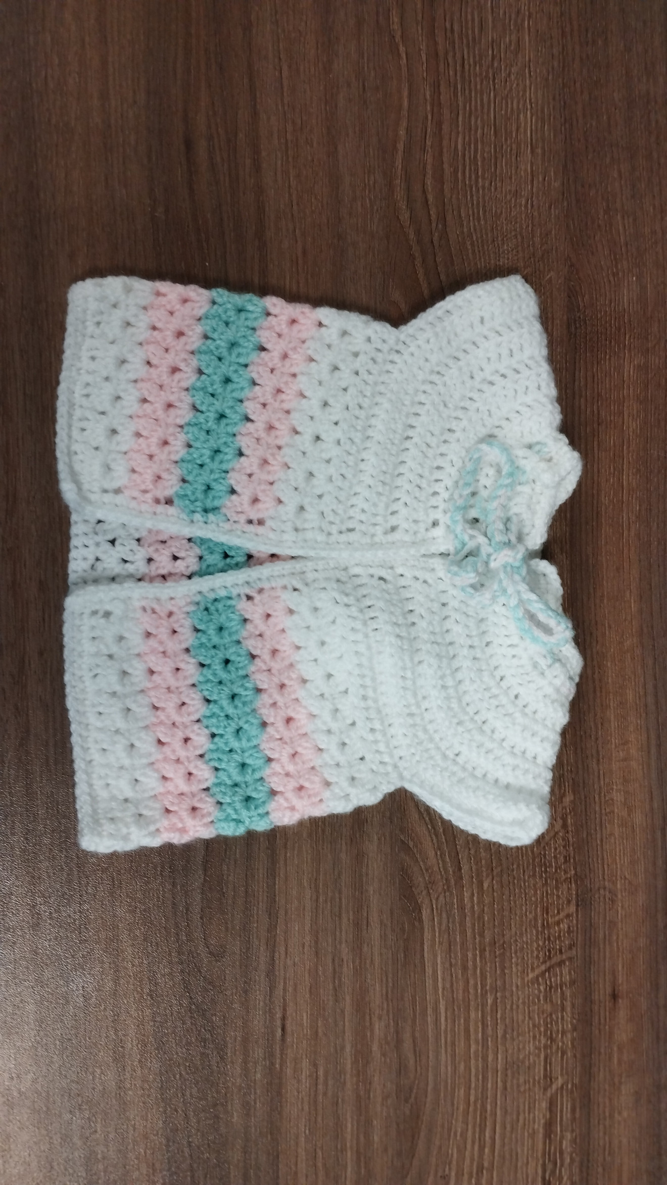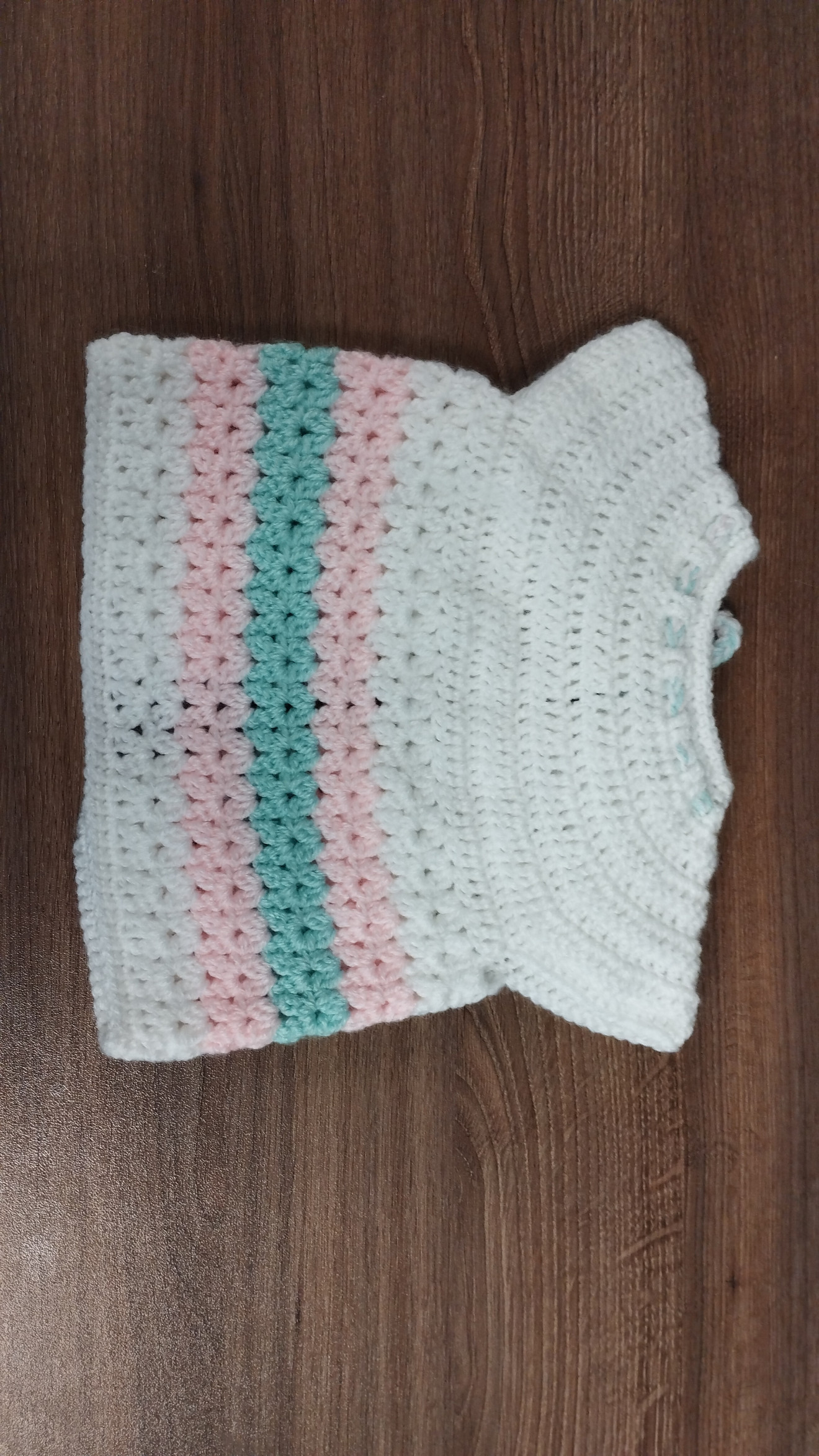Детско плетено елече, от бебешка акрилна прежда. Може да се изплете в три различни размера от 0 до 3 месеца, от 3 до 6 и от 6 до 12 месеца. Може да се направи и различна цветова комбинация според предпочитанията.