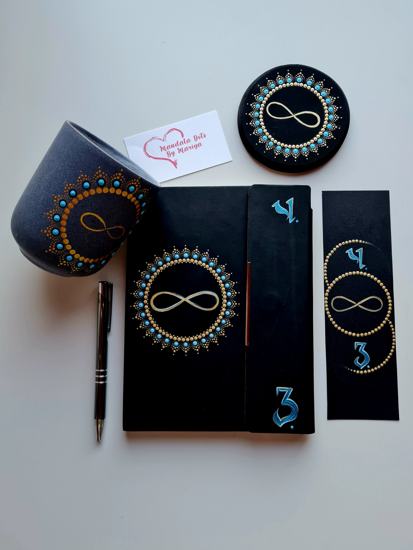 Подаръчен комплект със символа на безкрайността включващ чаша 300мл, тефтер А5 стандарт-192стр-корица от еко кожа-редове, подложка дърво с диаметър 10см, книгоразделител с послание от Вас. Изцяло рисувани на ръка !!! Книгоразделителят е комплимент от мен и не е включен в цената ! Чашката е рисувана с НЕ токсични бои за керамика и може да се ползва ежедневно, да се поставя в миялна машина и микровълнова. Подложката има защитен лак и може да се почиства с мокър парцал. Изпращам с Еконт, мога да издам фактура. Опакован и готов за подаряване с информация за ползване и магията на цветовете в Мандала.