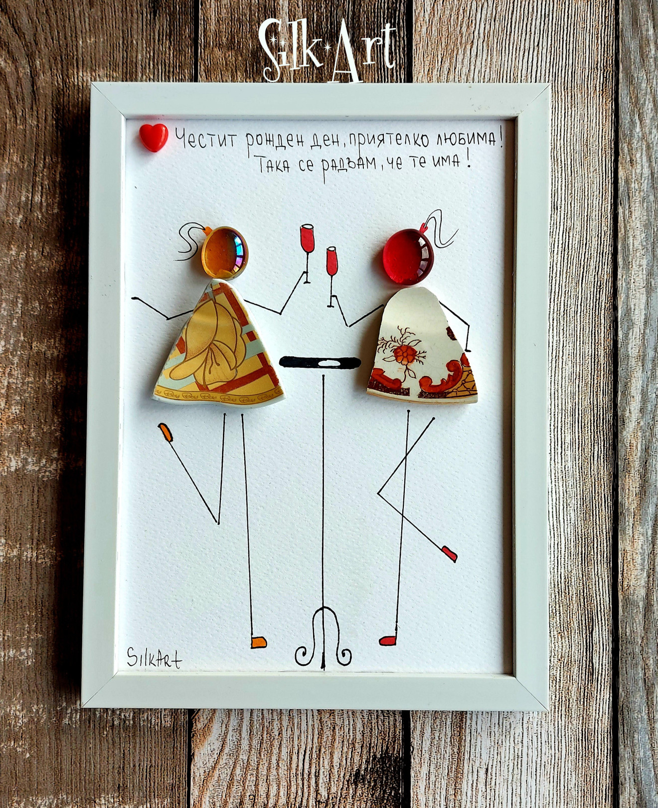 Пано "Приятелки" е с размер 23/17 см. Декорация с парченца керамика.