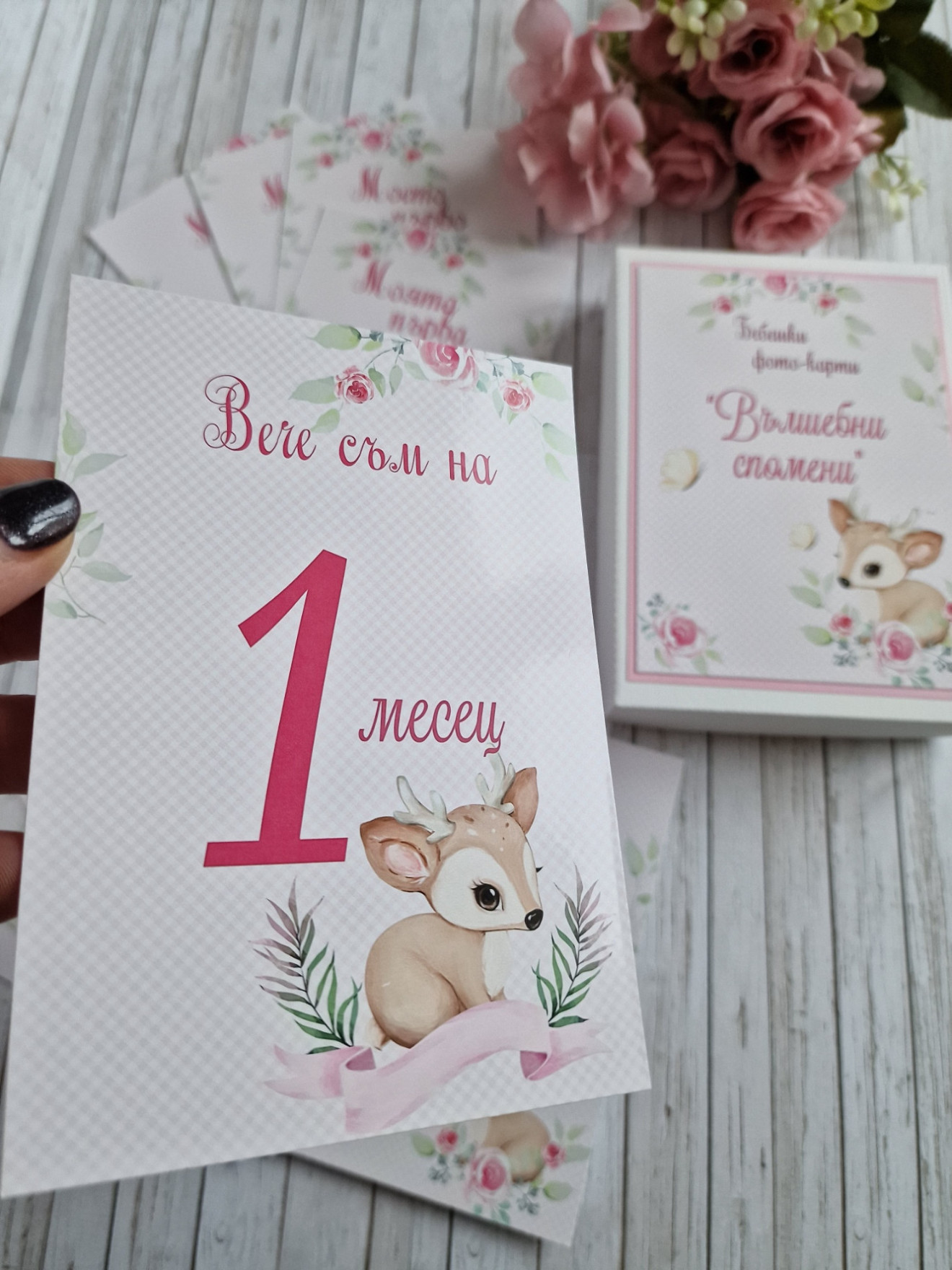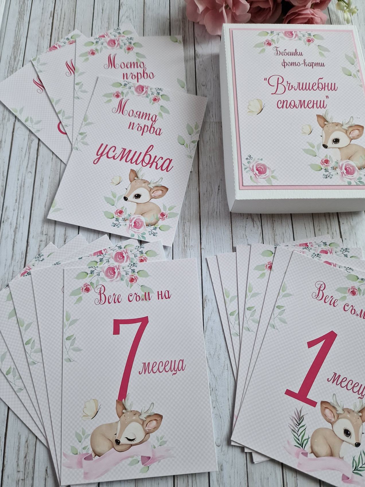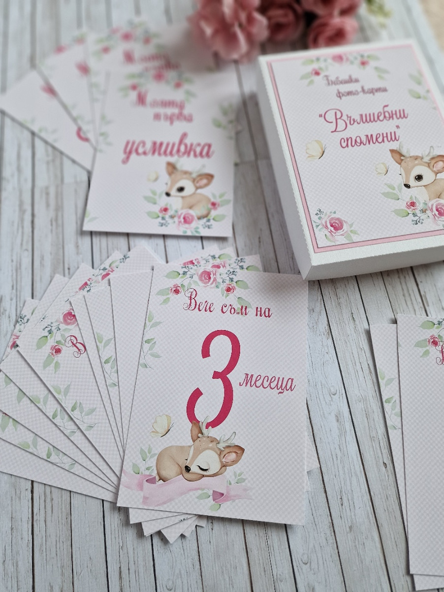 Фото карти, отбелязващи всяка месечинка през първата годинка на вашето бебче. ?В началото на всеки нов месец или при друго специално постижение, използвайте съответната карта. ?Комплектът се изработва както за момичета, така и за момчета. ?Съдържа 16 карти с размер 10 х 15 см, отпечатани пълноцветно върху луксозна хартия. ?Карти в кутия за всеки месец от първата годинка, както и карти първа усмивка, първо зъбче, първи стъпки, първа Коледа ?С възможност за добавяне и на допълнителни карти при желание #craftytreasuresstudio #ръчноизработенподарък #рожденден #погача #новородено #фотокарти #бебешки #подарък #снимки #месеци #фото