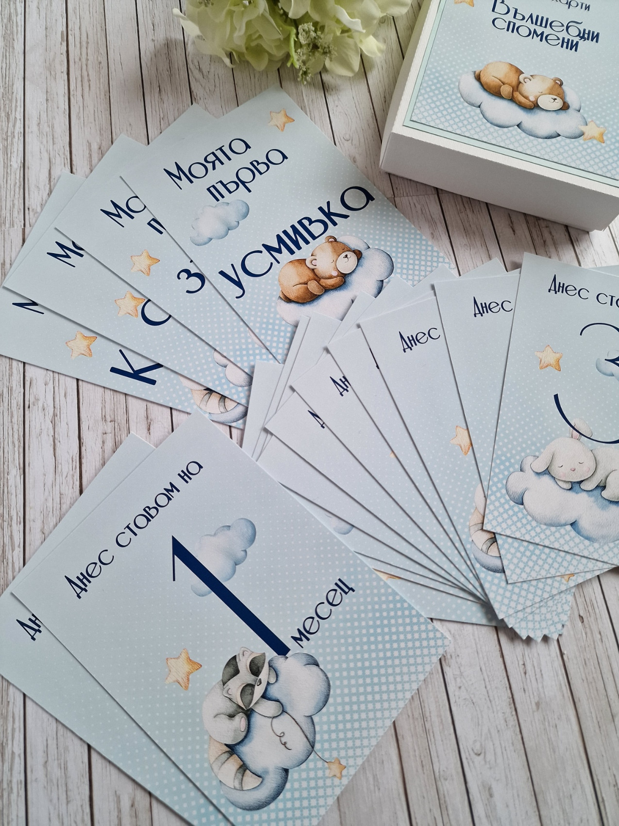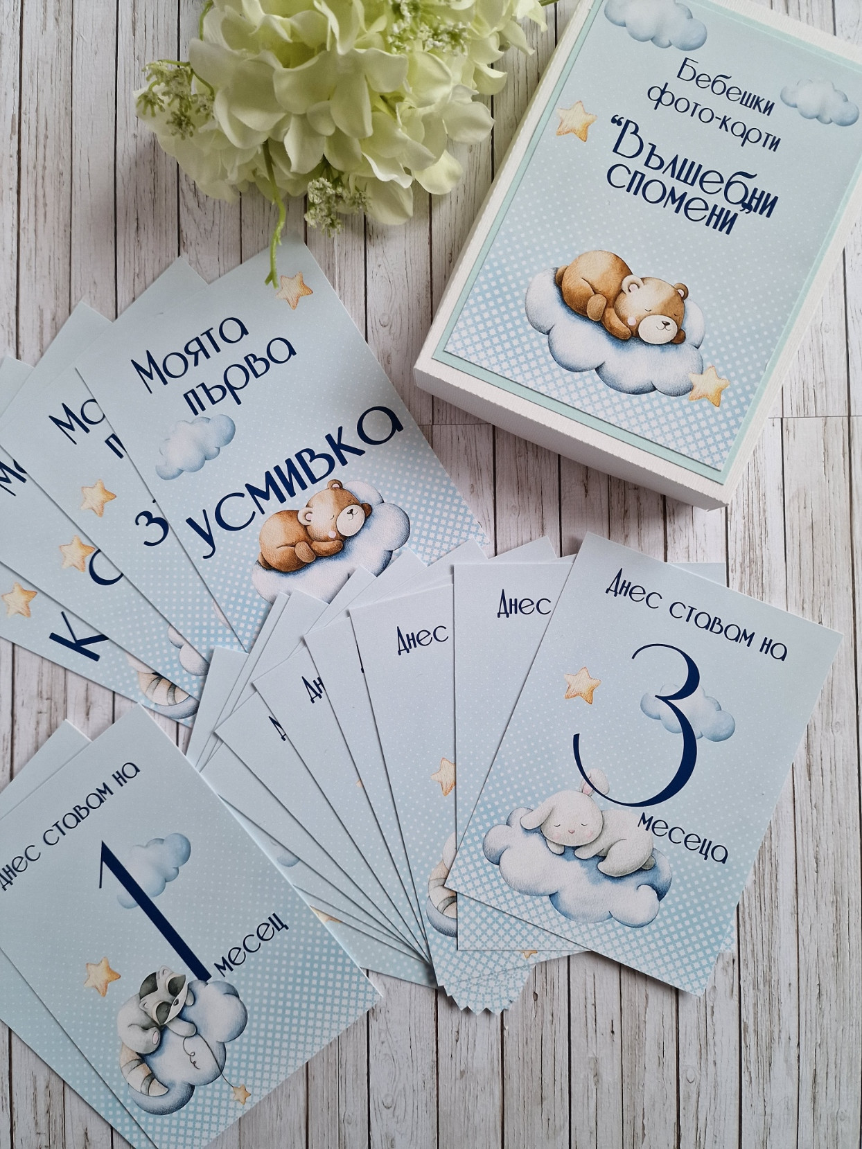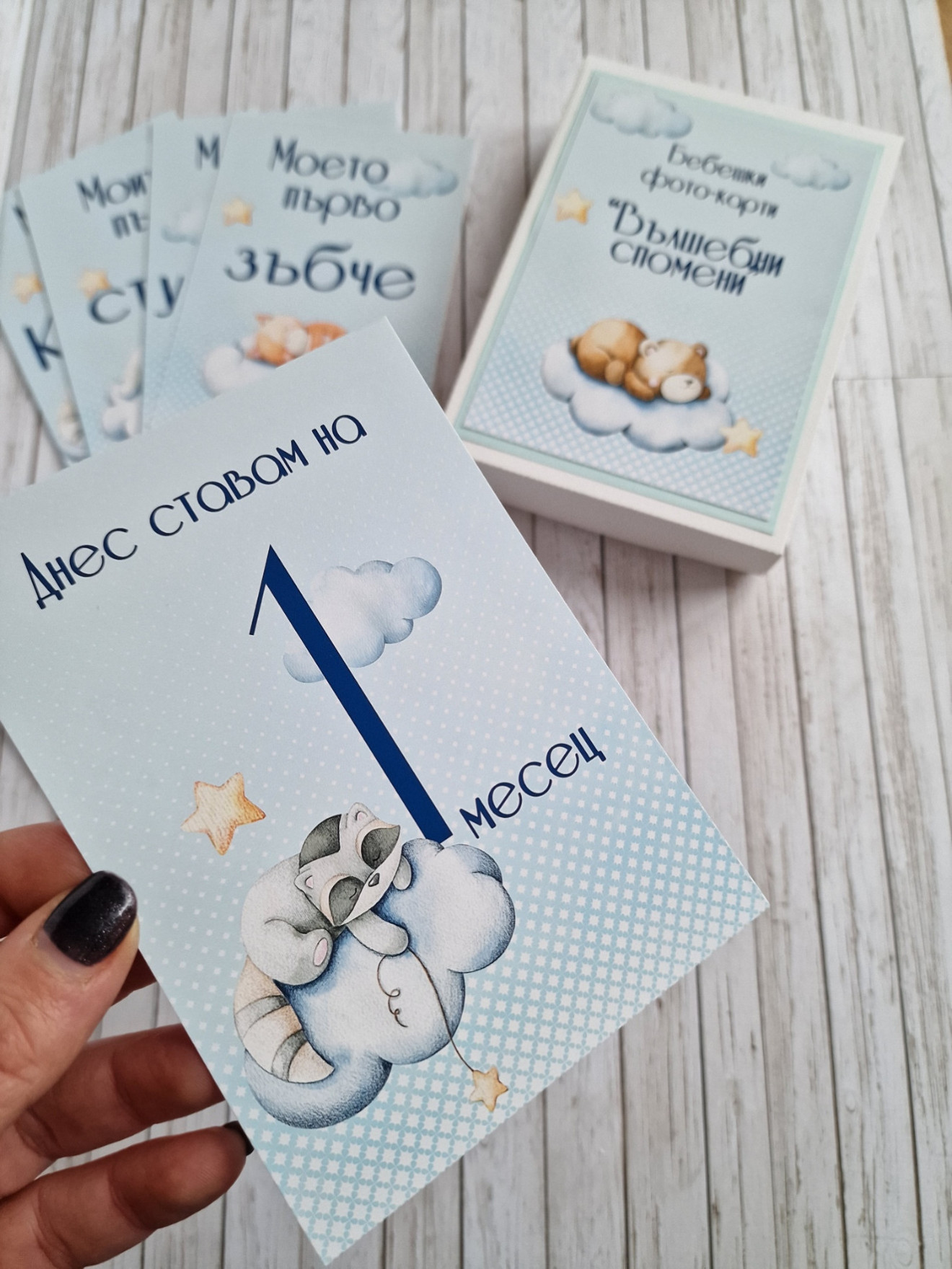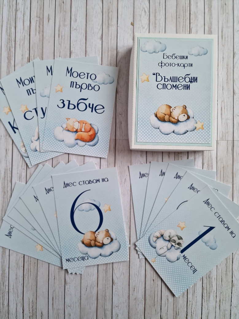 Фото карти, отбелязващи всяка месечинка през първата годинка на вашето бебче. -В началото на всеки нов месец или при друго специално постижение, използвайте съответната карта. -Комплектът се изработва както за момичета, така и за момчета. -Съдържа 16 карти с размер 10 х 15 см, отпечатани пълноцветно върху луксозна хартия. -Карти в кутия за всеки месец от първата годинка, както и карти първа усмивка, първо зъбче, първи стъпки, първа Коледа -С възможност за добавяне и на допълнителни карти при желание #craftytreasuresstudio #ръчноизработенподарък #рожденден #погача #новородено #фотокарти #бебешки #подарък #снимки #месеци #фото