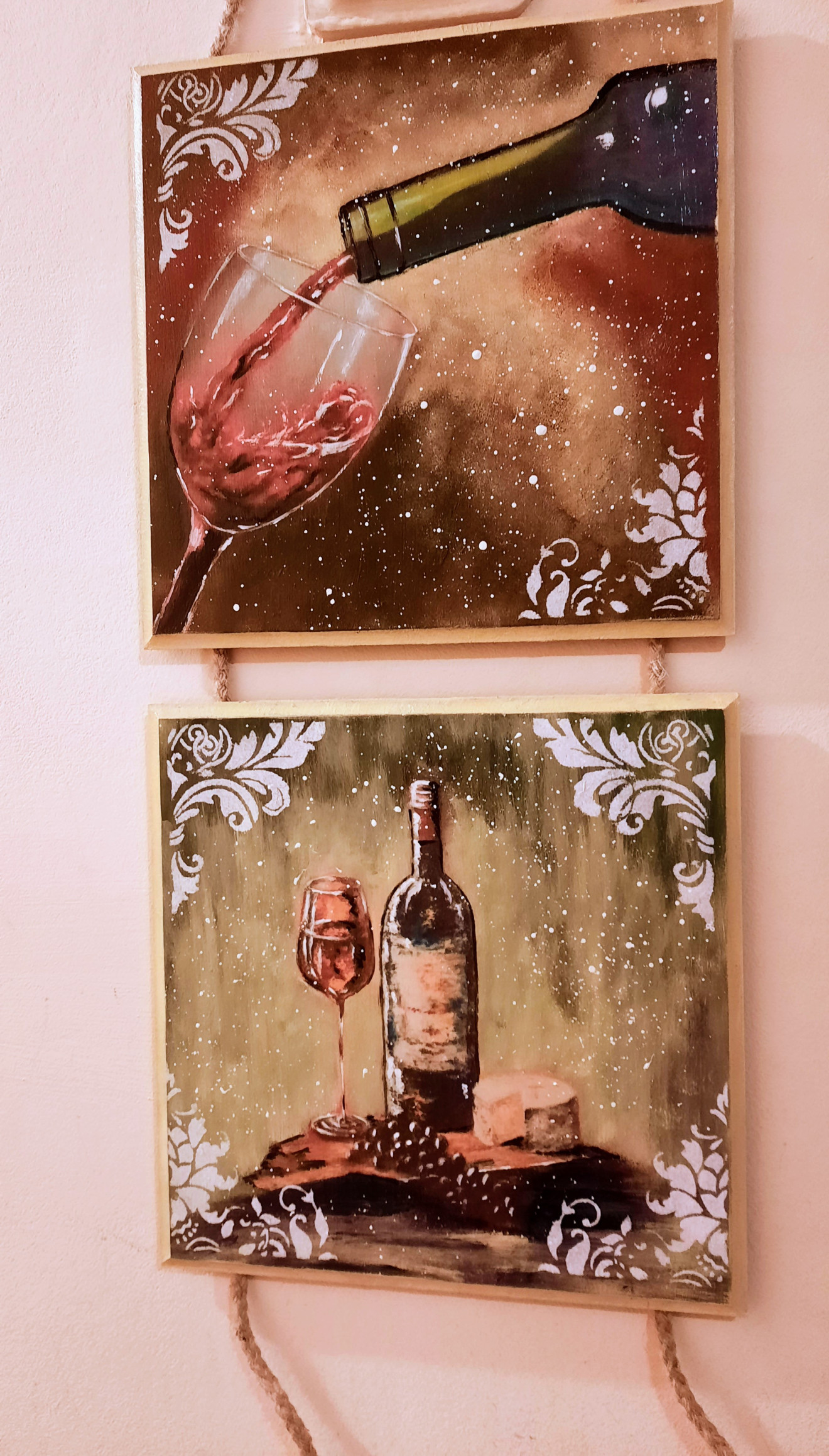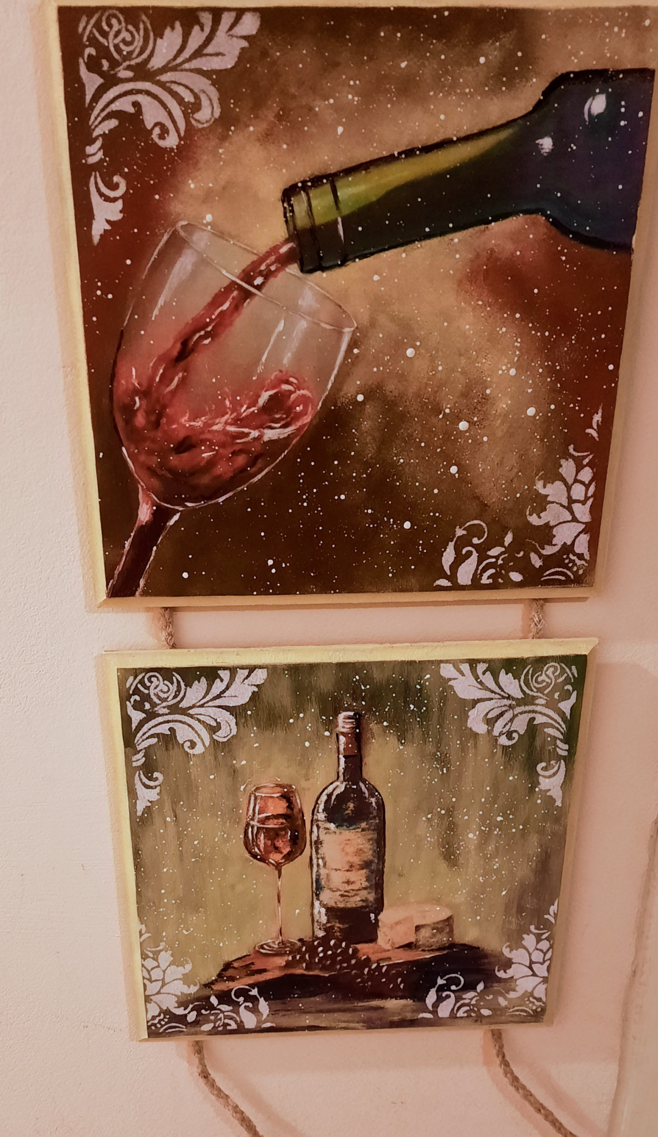 Пано за стена от две части. Използвани материали акрилни бои и лак за завършек. Всяка част е с размери 20/20 см.