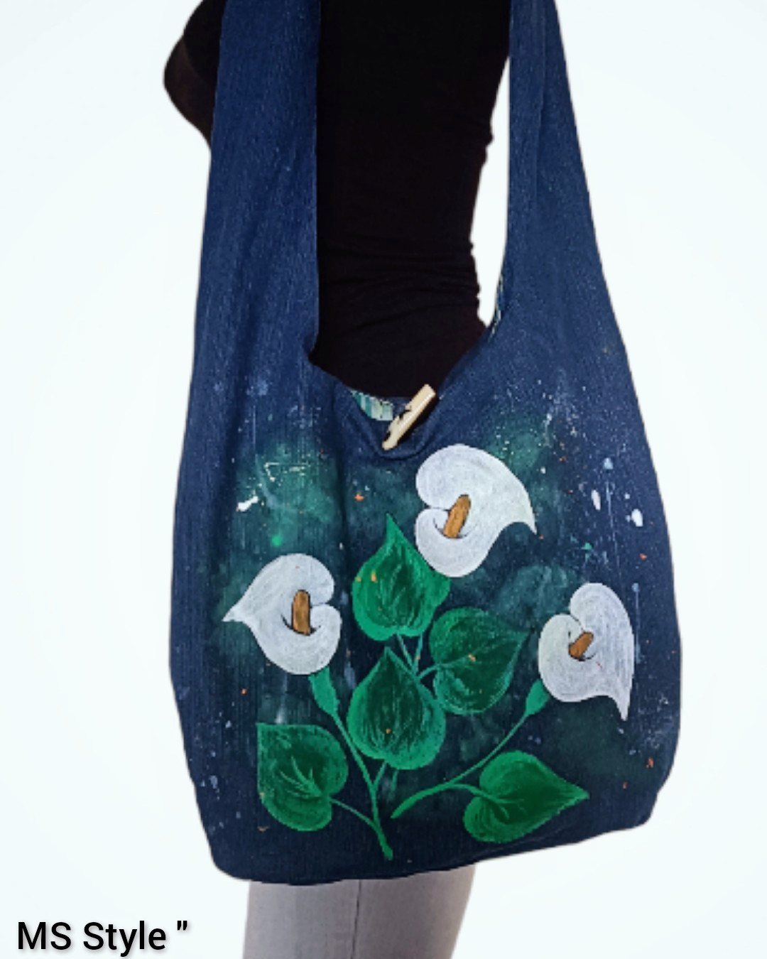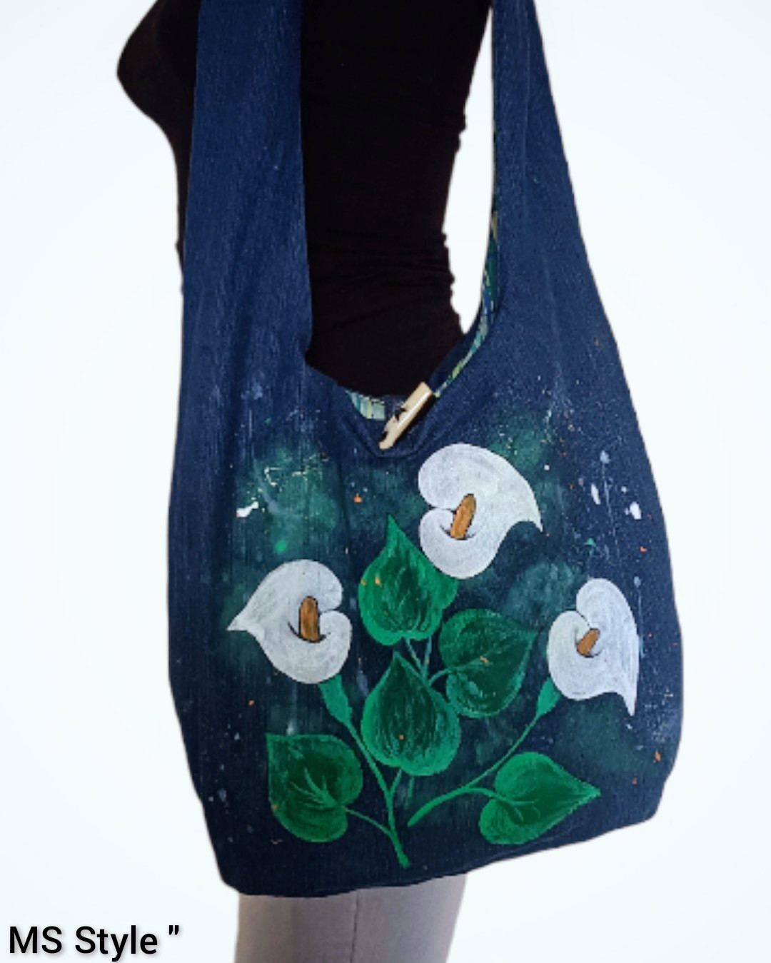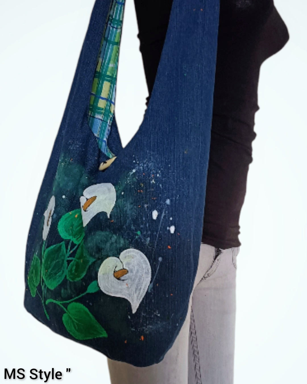 #Дамска #чанта с #калии " Чантата е #ръчно #рисувана с #текстилни #бои, без употреба на шаблони, #ръчно #изработена от #деним, с #едно #отделение, закопчава се с #копче, с #дълга #дръжка за носене на рамо, цветна #подплата и #вътрешен #джоб, размери: ширина 39 см, дълбочина 32 см, дъно 27,5 - 7 см, дръжка 85 см, цена 67 лв.