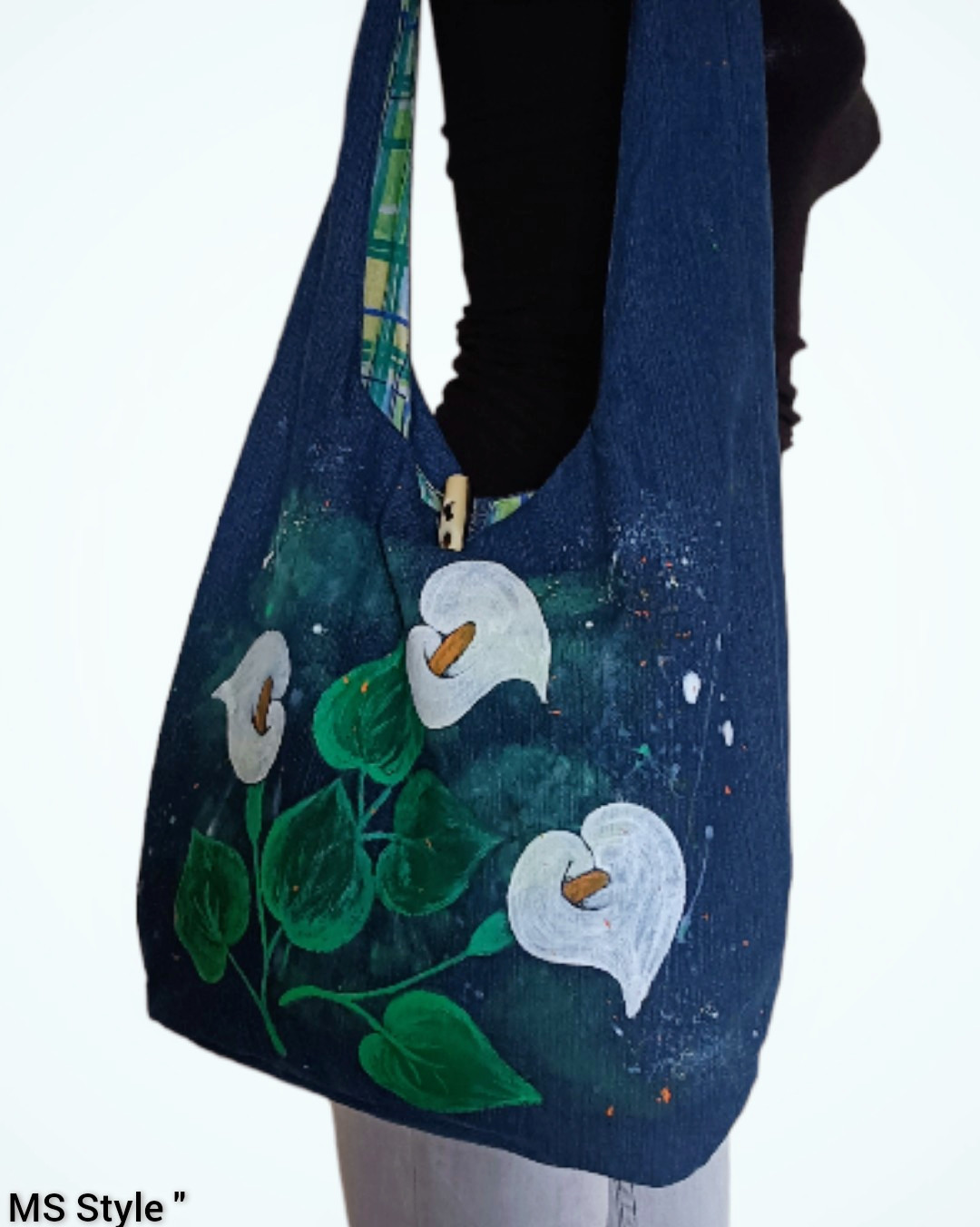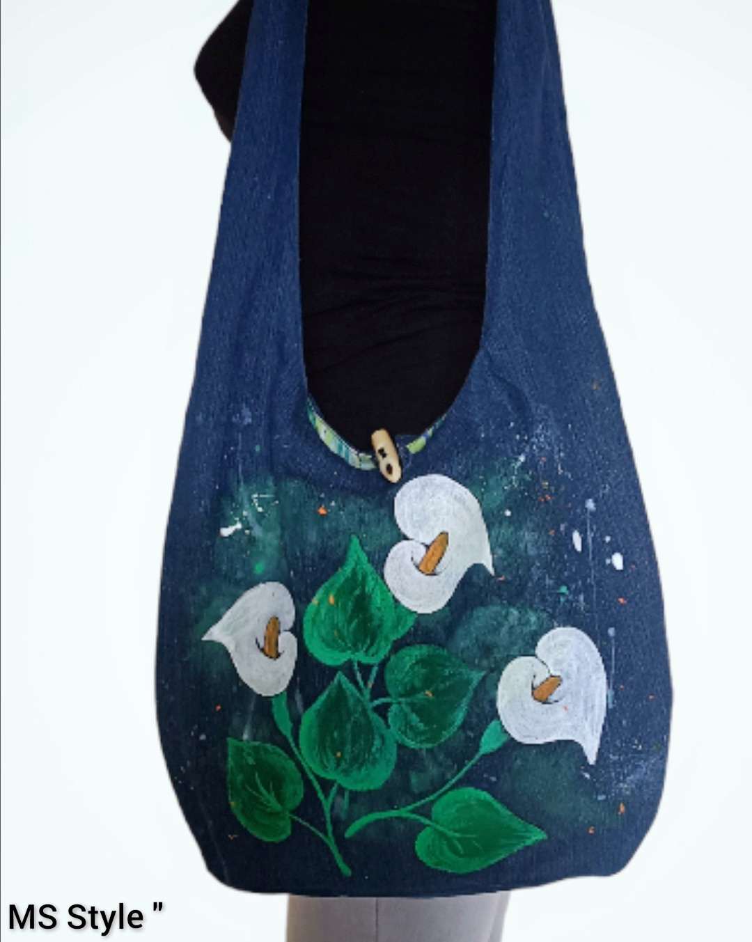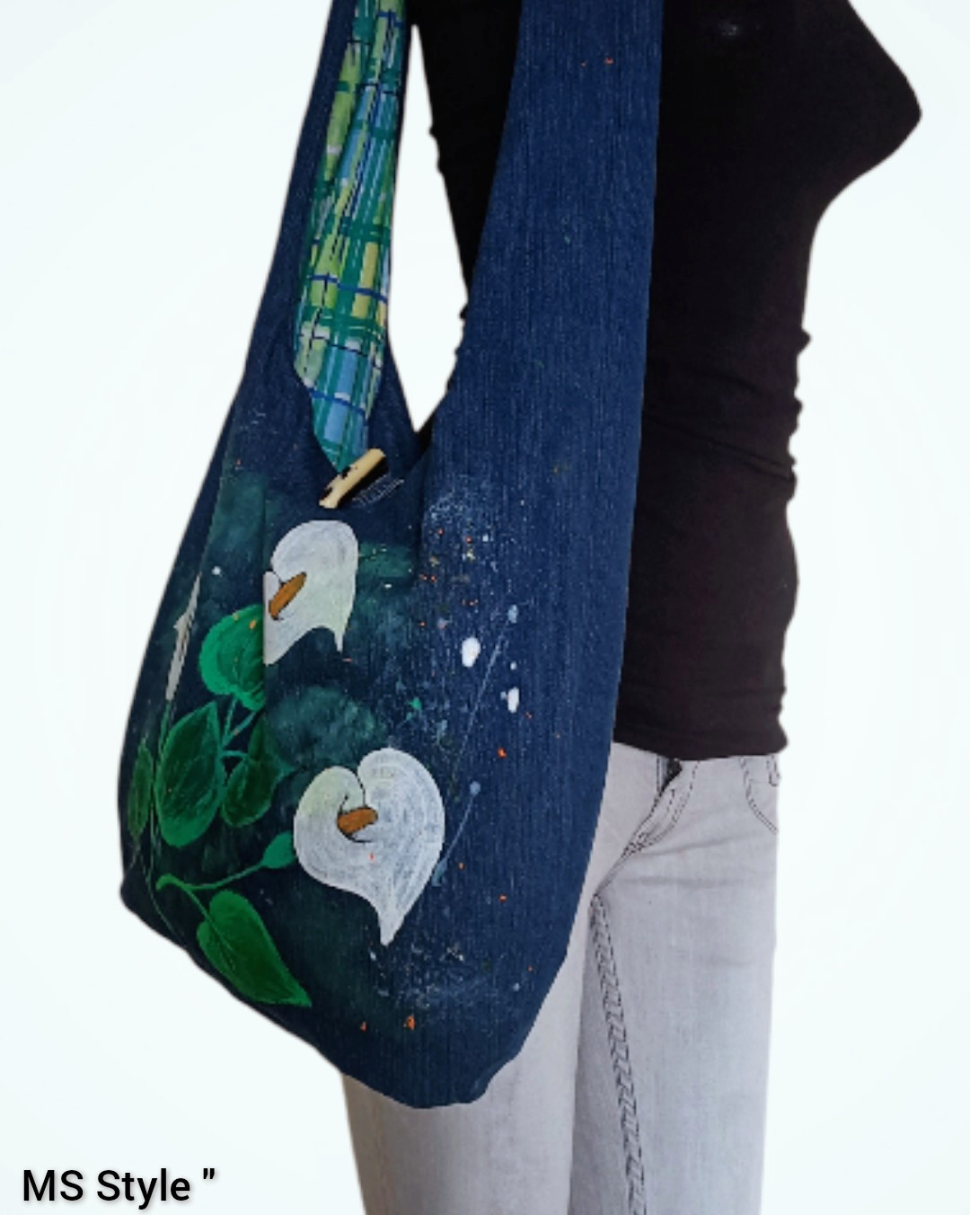 #Дамска #чанта с #калии " Чантата е #ръчно #рисувана с #текстилни #бои, без употреба на шаблони, #ръчно #изработена от #деним, с #едно #отделение, закопчава се с #копче, с #дълга #дръжка за носене на рамо, цветна #подплата и #вътрешен #джоб, размери: ширина 39 см, дълбочина 32 см, дъно 27,5 - 7 см, дръжка 85 см, цена 67 лв.