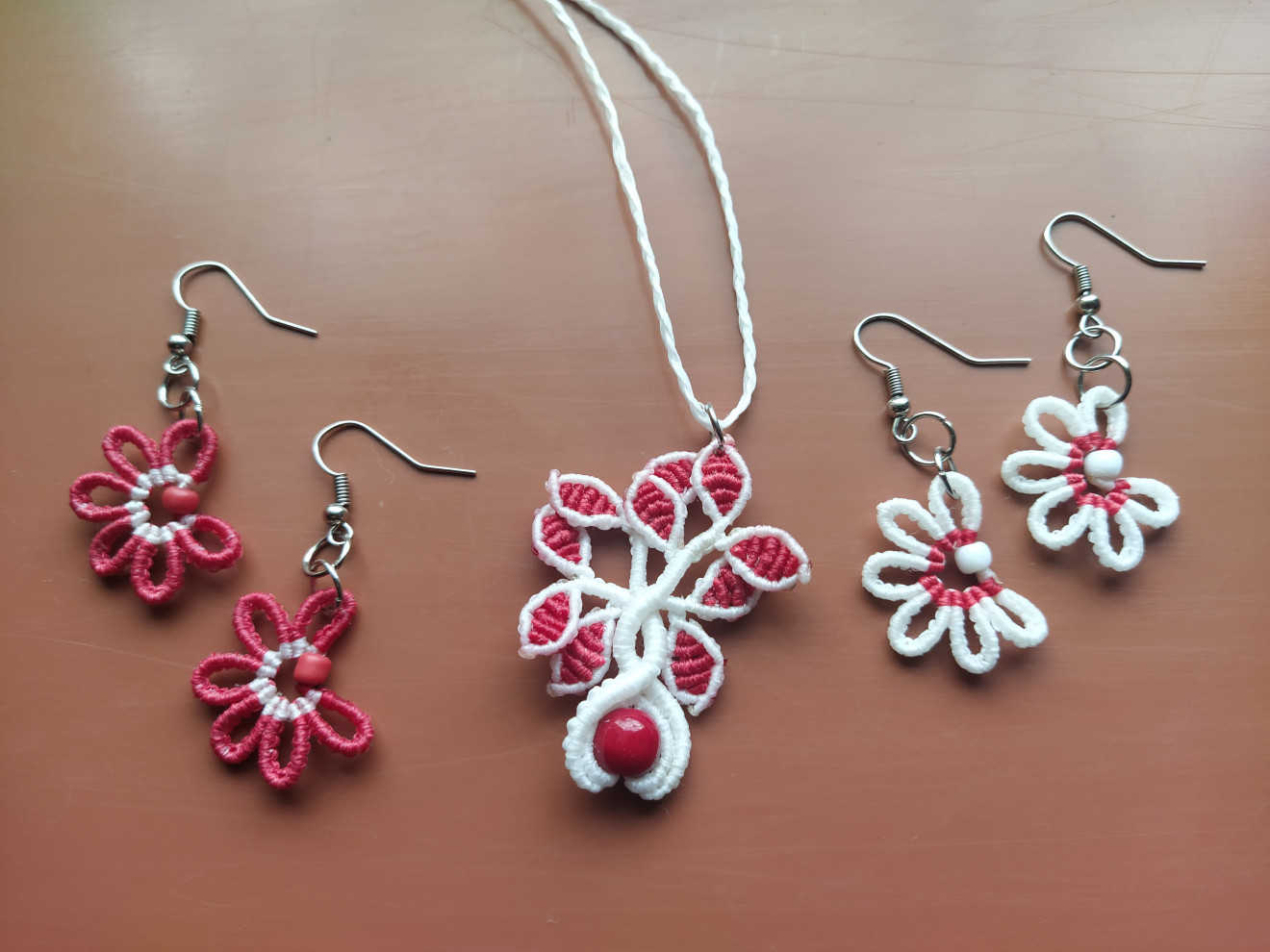 Бижутата са изработени изцяло от восъчни конци и техниката макраме. Във висулката дръвче е вплетено мънисто Червен корал, в обеците - дървено. Комплекта съдържа: - колие с висулка дръвче 5см./4см., плетена верижка с регулируема дължина. Промушва се през главата и се пристяга до желаното ниво за носене (по врата или под гърдите) - 30,00 лева; - обеци с размери 5см./2см. - 7,00 лева/брой, (комплекта съдържа два чифта); При поръчка на целия комплект - 20% или 30,00 лв. вместо 37,00 лв. Може да се изработят в други цветове. За повече информация или въпроси, моля, не се колебайте да се свържете с мен.