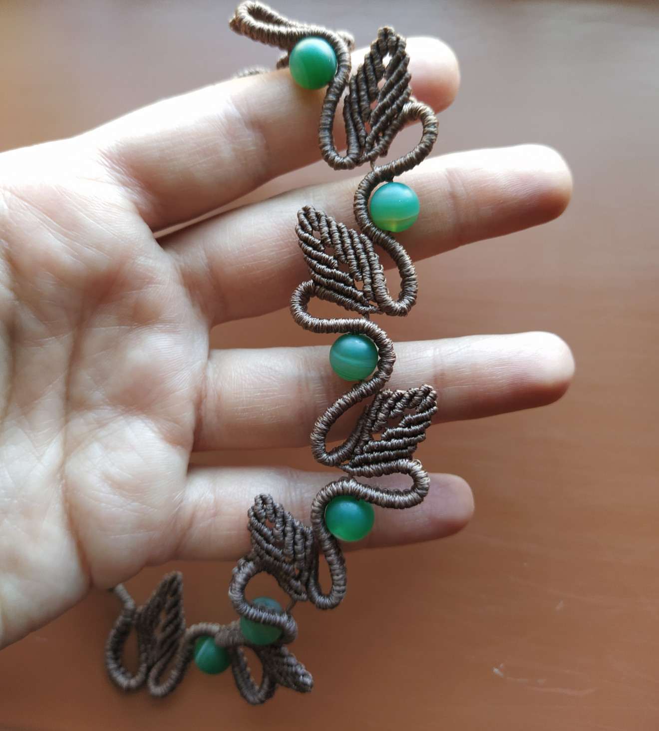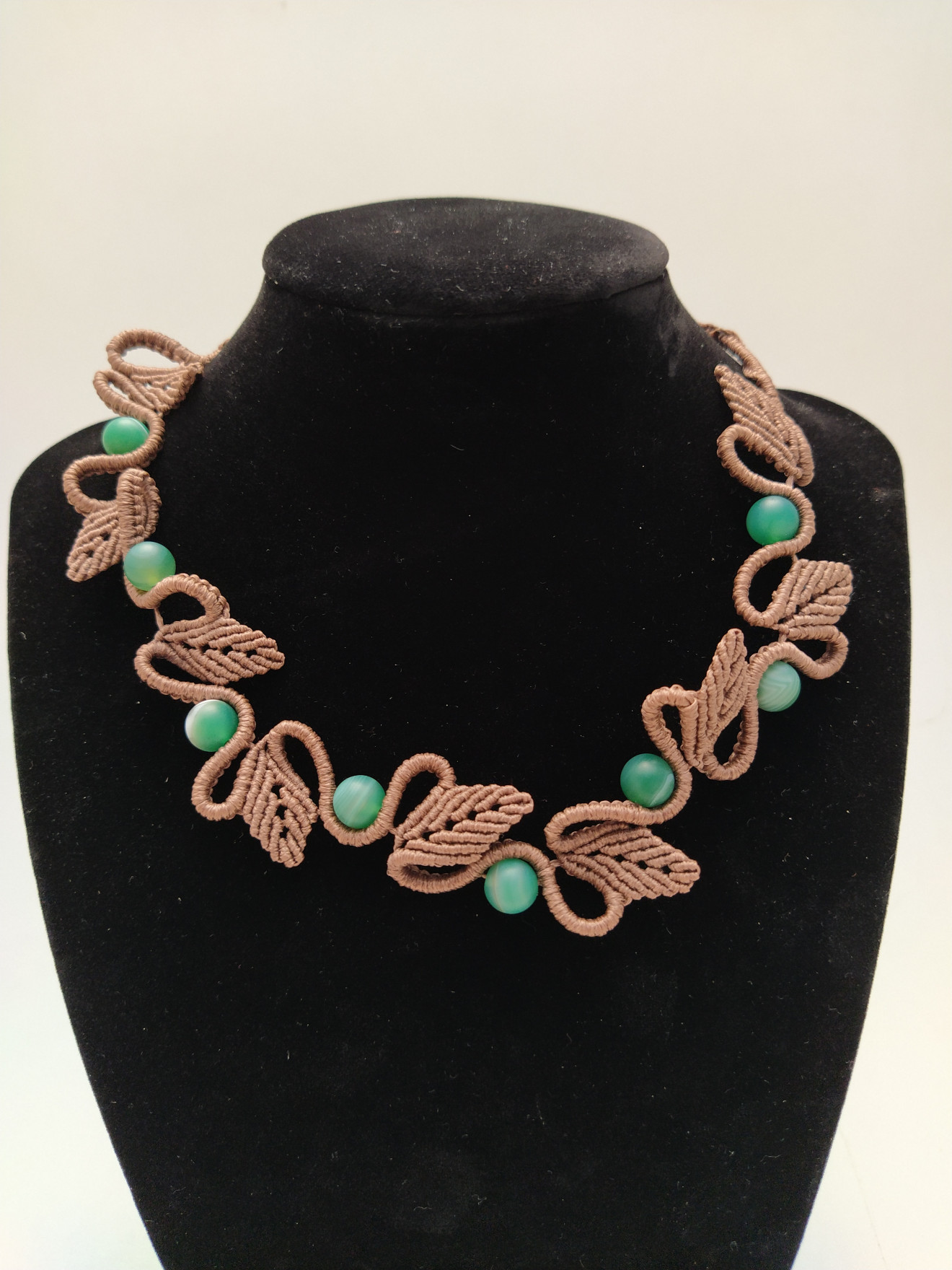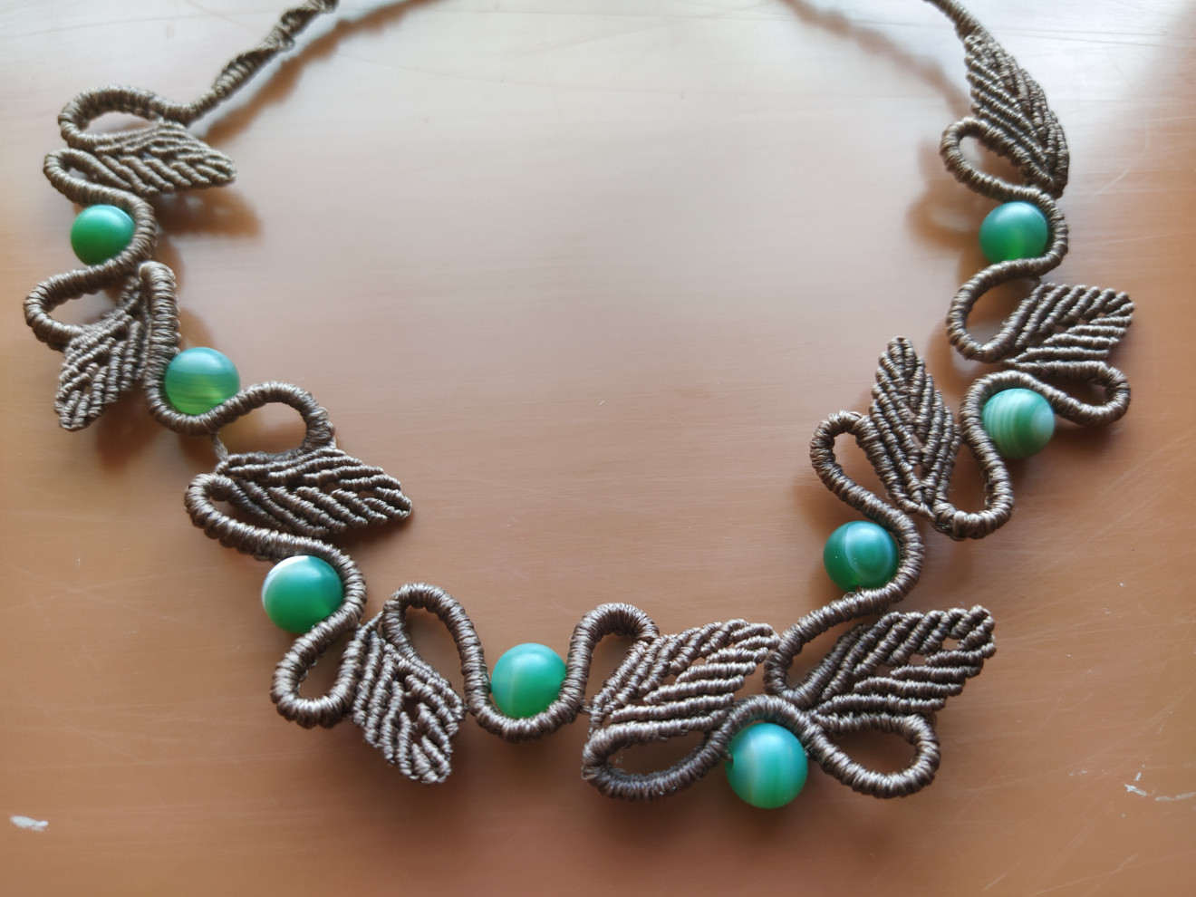 Колието е тип чокър, изработено чрез техниката макраме с восъчно конци и мъниста естествен камък Ахат. Дължината е 38 см., а ширината е 3 см. Артикула идва при Вас опакован и готов за подаряване. Може да се изработи в други цветове. За повече информация, въпроси, моля, не се колебайте да се свържете с мен.