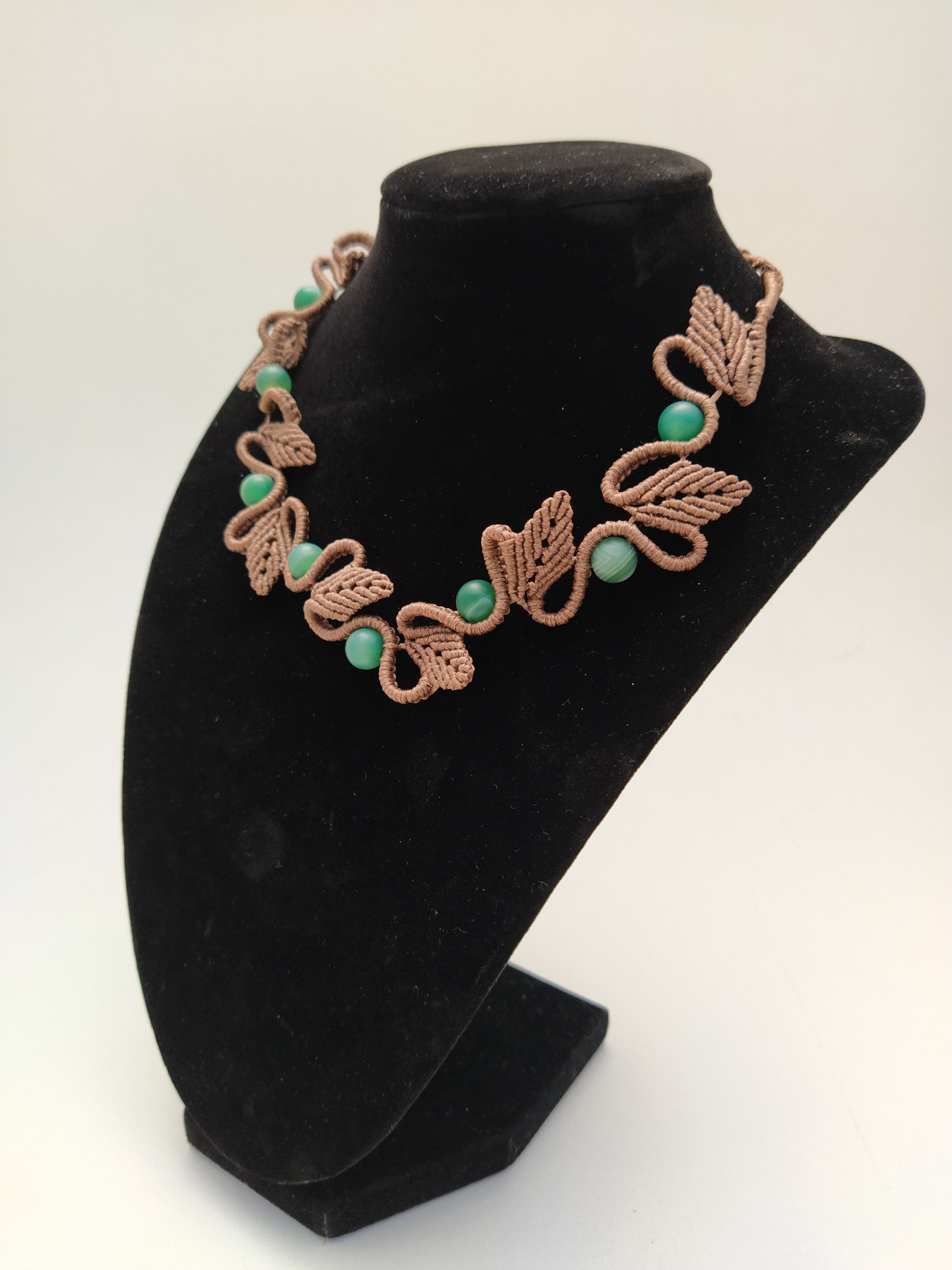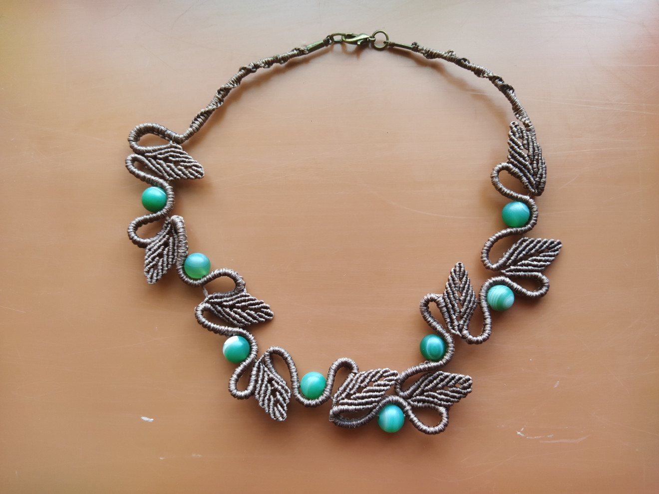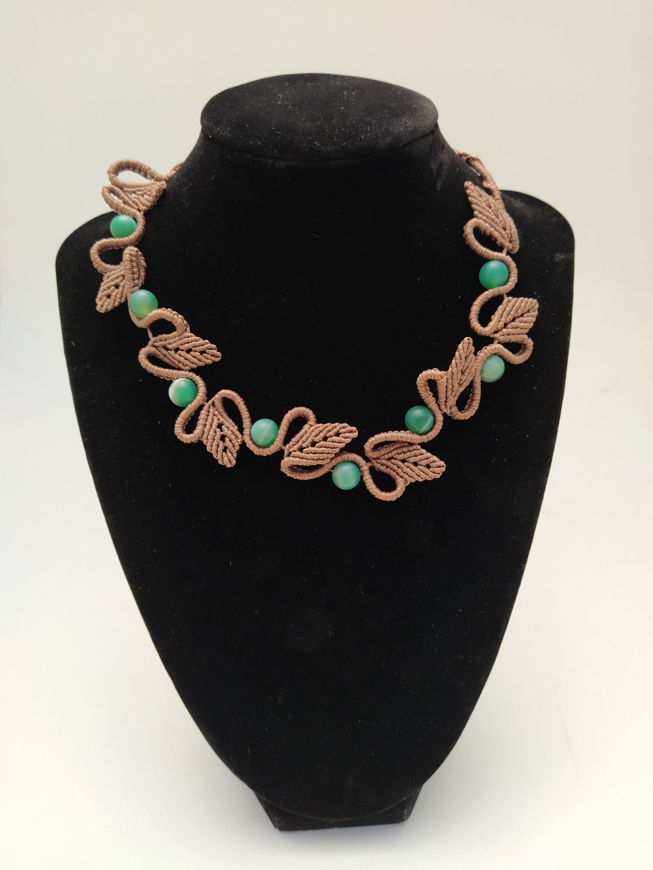 Колието е тип чокър, изработено чрез техниката макраме с восъчно конци и мъниста естествен камък Ахат. Дължината е 38 см., а ширината е 3 см. Артикула идва при Вас опакован и готов за подаряване. Може да се изработи в други цветове. За повече информация, въпроси, моля, не се колебайте да се свържете с мен.