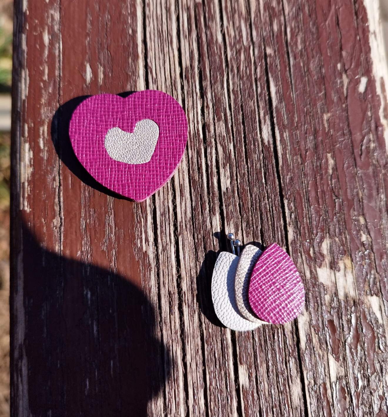 Комплект брошки сърце и малко цвете, изработени от кожени изрезки и медицинска стомана. Тичинките на цветето и иглите за закрепяне на гърба са изработени от неръждаема стомана. От избора на кожата през изрязването на парчетата до сглобяването на всичко, тази ръчно изработена брошка е за сърцето от сърцето. Работя единствено с отпадъчни кожени изрезки, набавени предимно от майстори на кожени чанти, и повечето брошки са единични бройки или само по няколко от брой. Ако имате наум определена цветова комбинация, пишете ми. Ще се радвам да я изработя за вас.