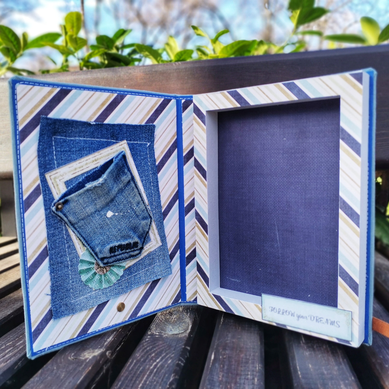 Картичката е подходяща за всеки повод, кориците са шити, облечени в плат, има място за надпис и персонализирано пожелание. Налична!