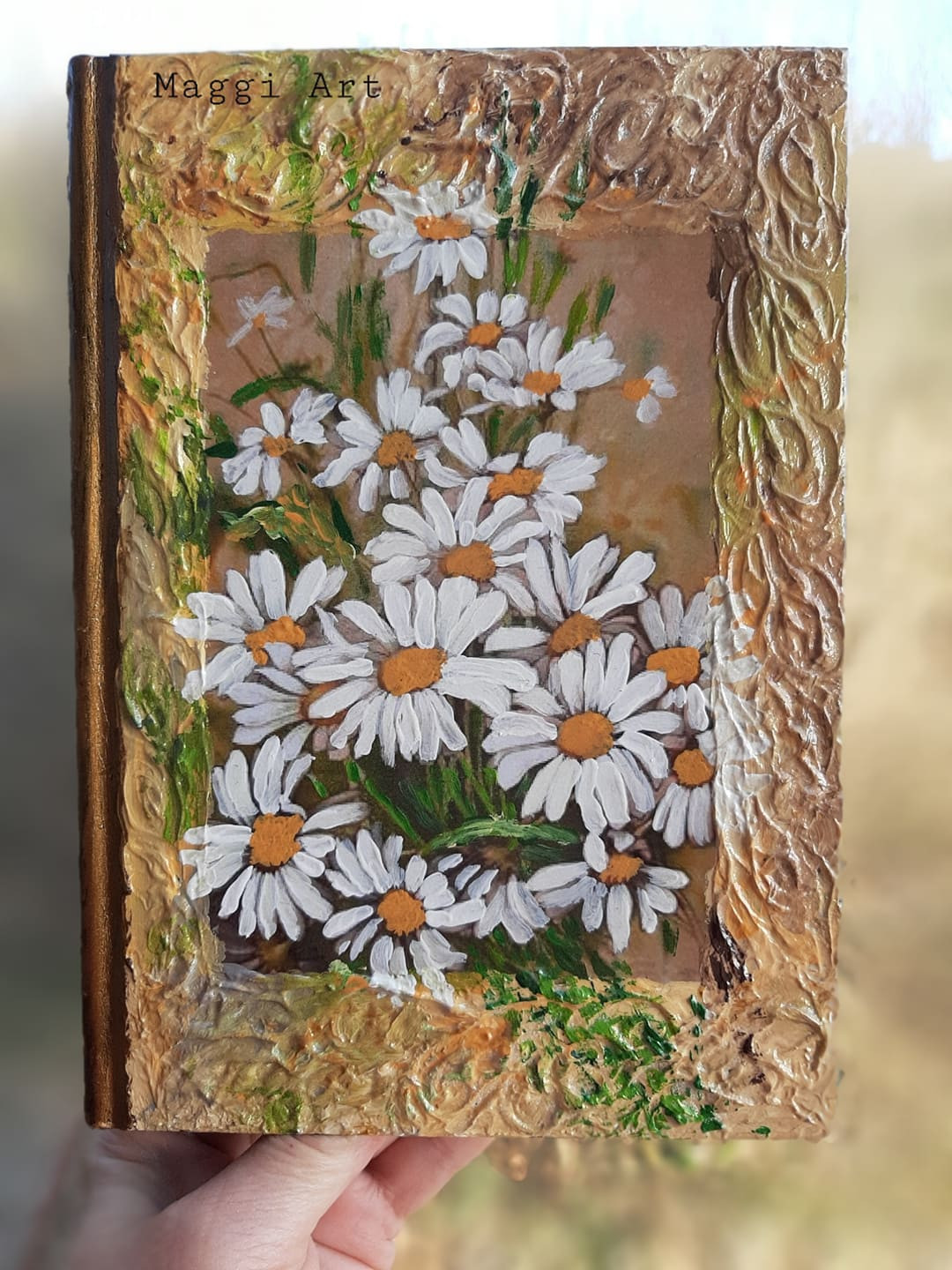 Съвсем скоро е един от най-красивите и пъстри празници-Цветница. По този повод съм направила и поредица от няколко тефтер-дневника с цветя. Цветната феерия ще открие тефтер-дневника"Маргаритки" усмихнатите цветя на Природата. Тефтерът е изработен в стил Винтидж и има 198 луксозни страници за писане. Размер 15/21см.
