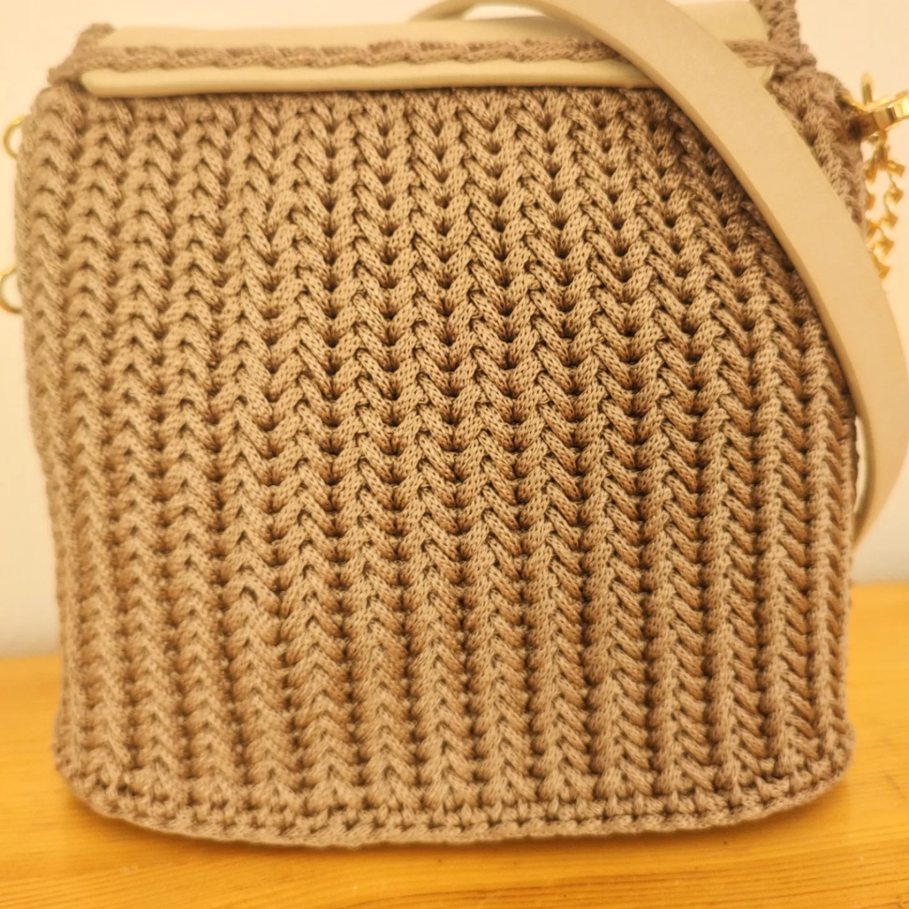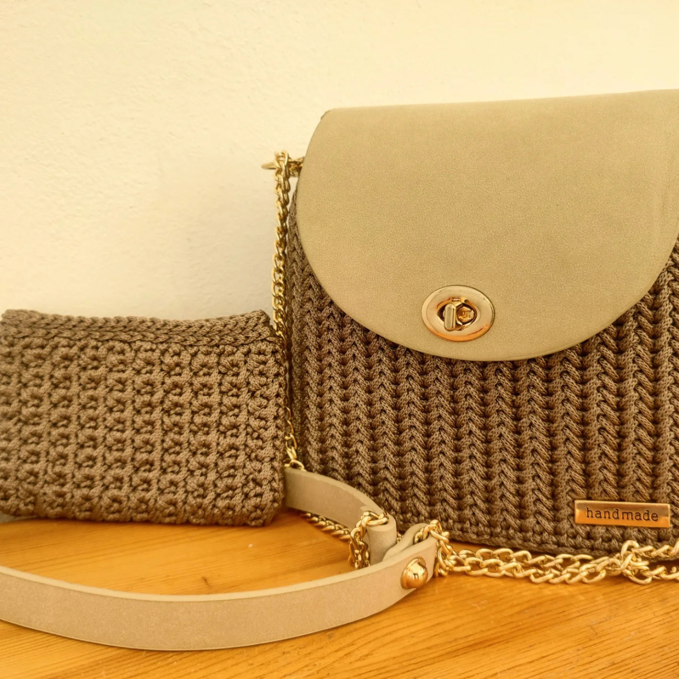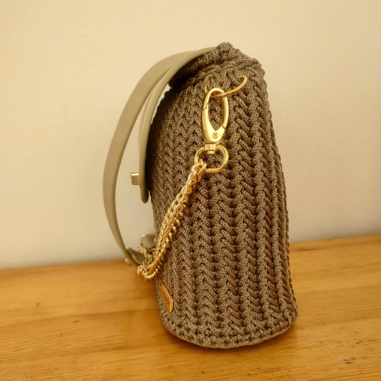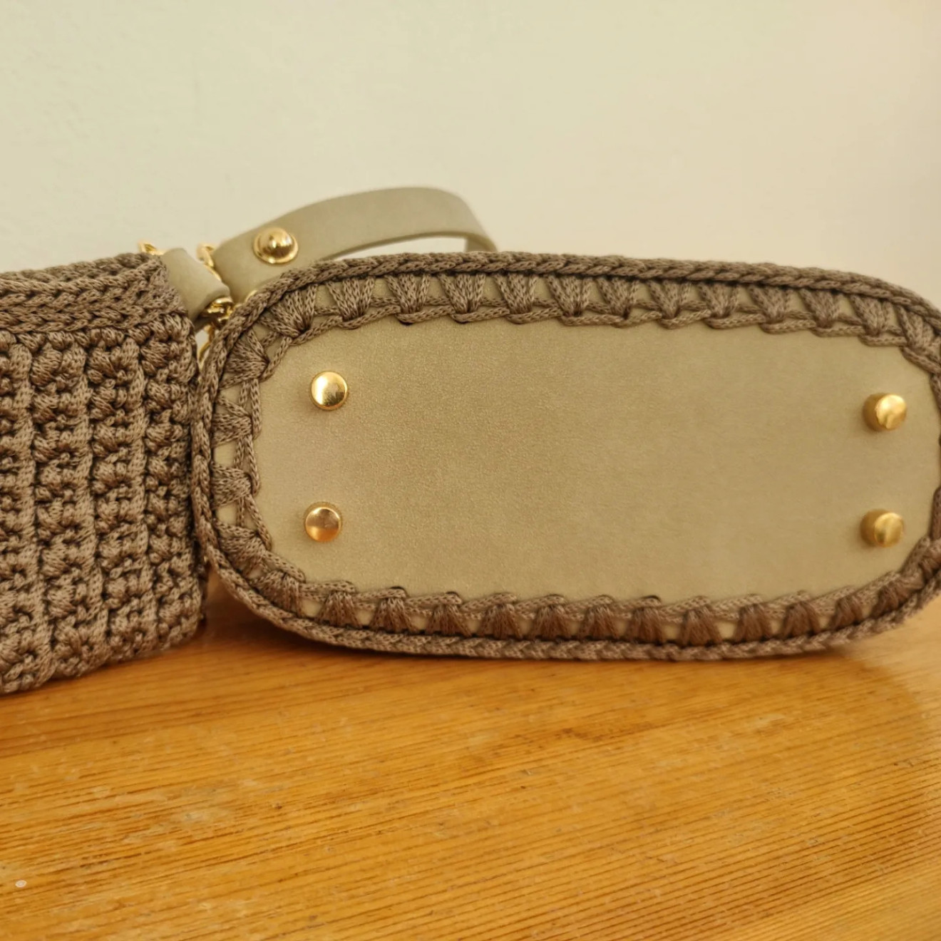 Чантичка за всеки повод , изплетена с полиестерно макраме в бежов цвят, добавка кожен комплект и метални елементи в златисто