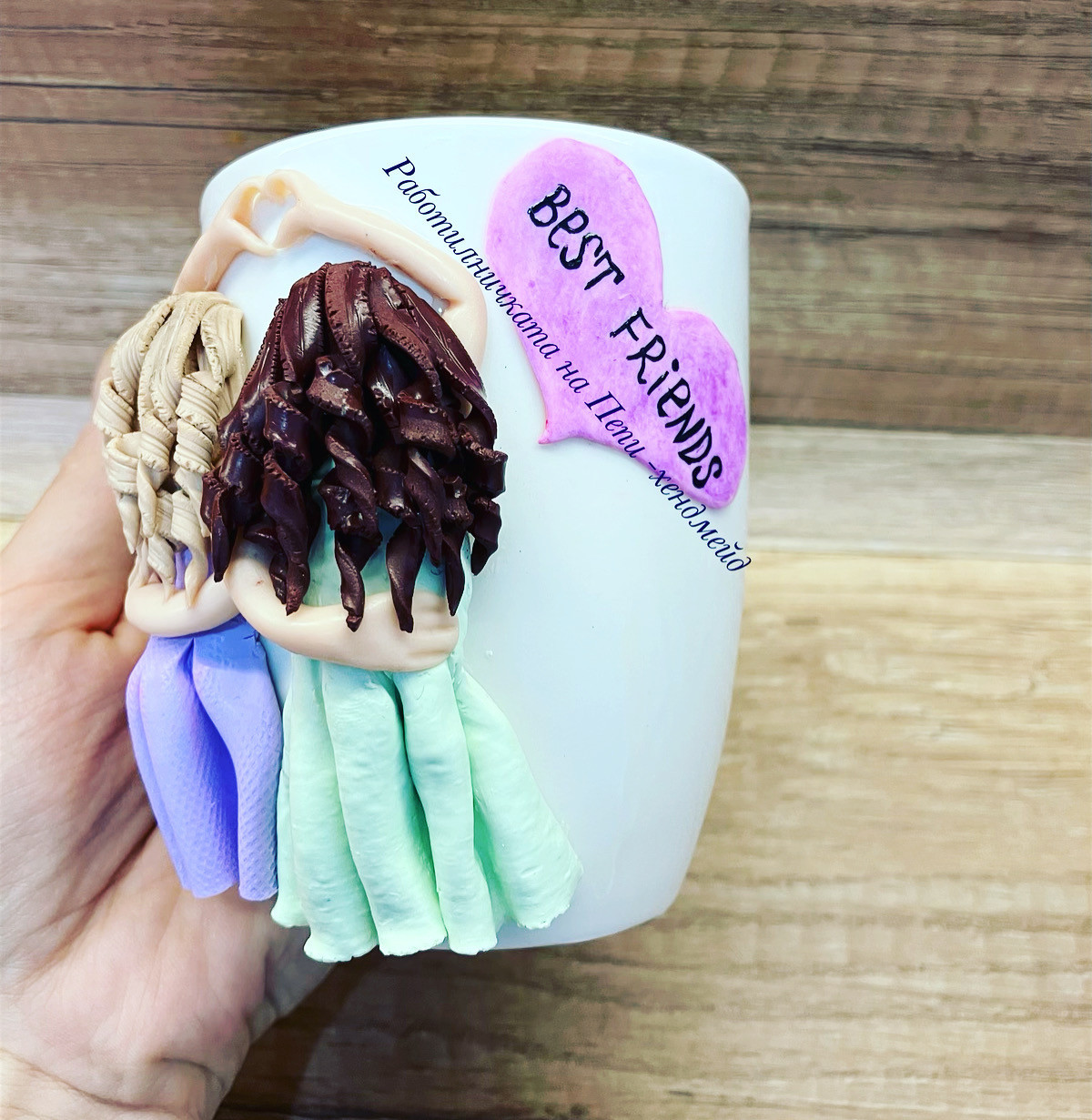 Керамична чаша с декорация от полимерна глина за Приятелки , с възможност за добавяне на кратък надпис . За актуално време на изработка и въпроси може да се свържете с мен и във ФБ страницата ми Работилничката на Пепи-хендмейд