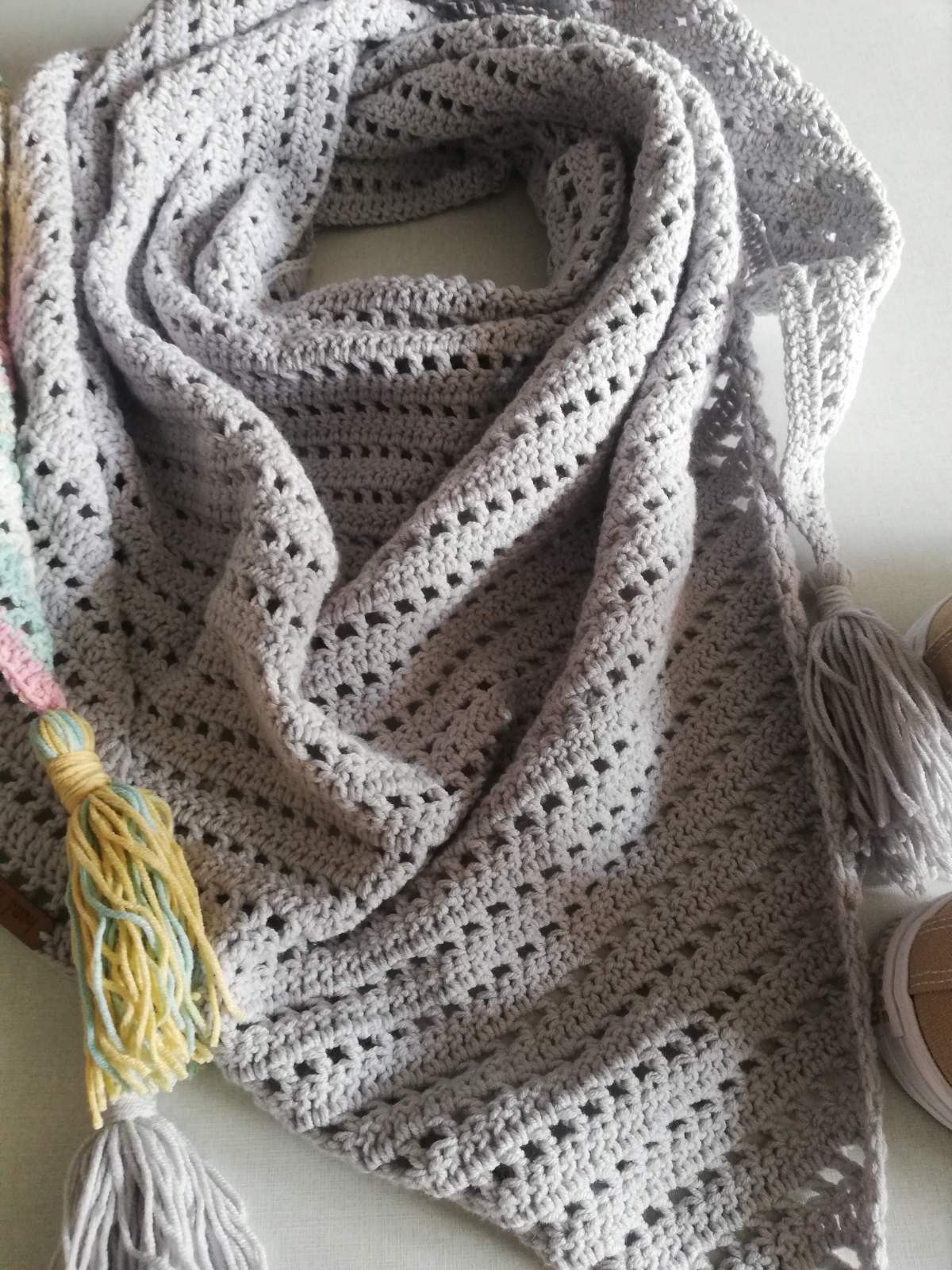 Пролетно- летен триъгълен шал, изплетен от памучна прежда. Шалът може да бъде изработен и в избран от вас цвят. Срок на изработка до 10 работни дни след уточняване на цвета и наличностите.