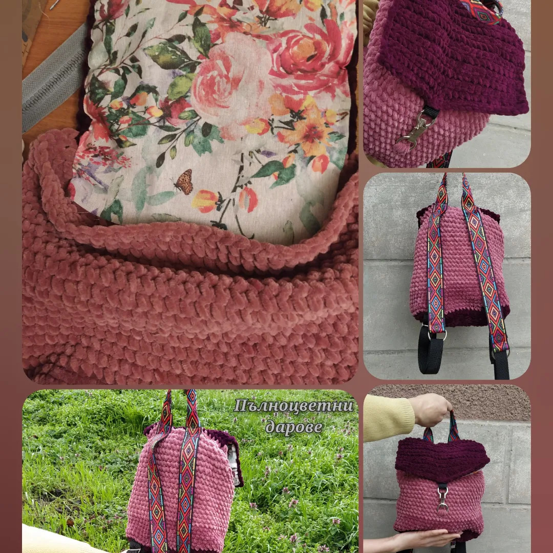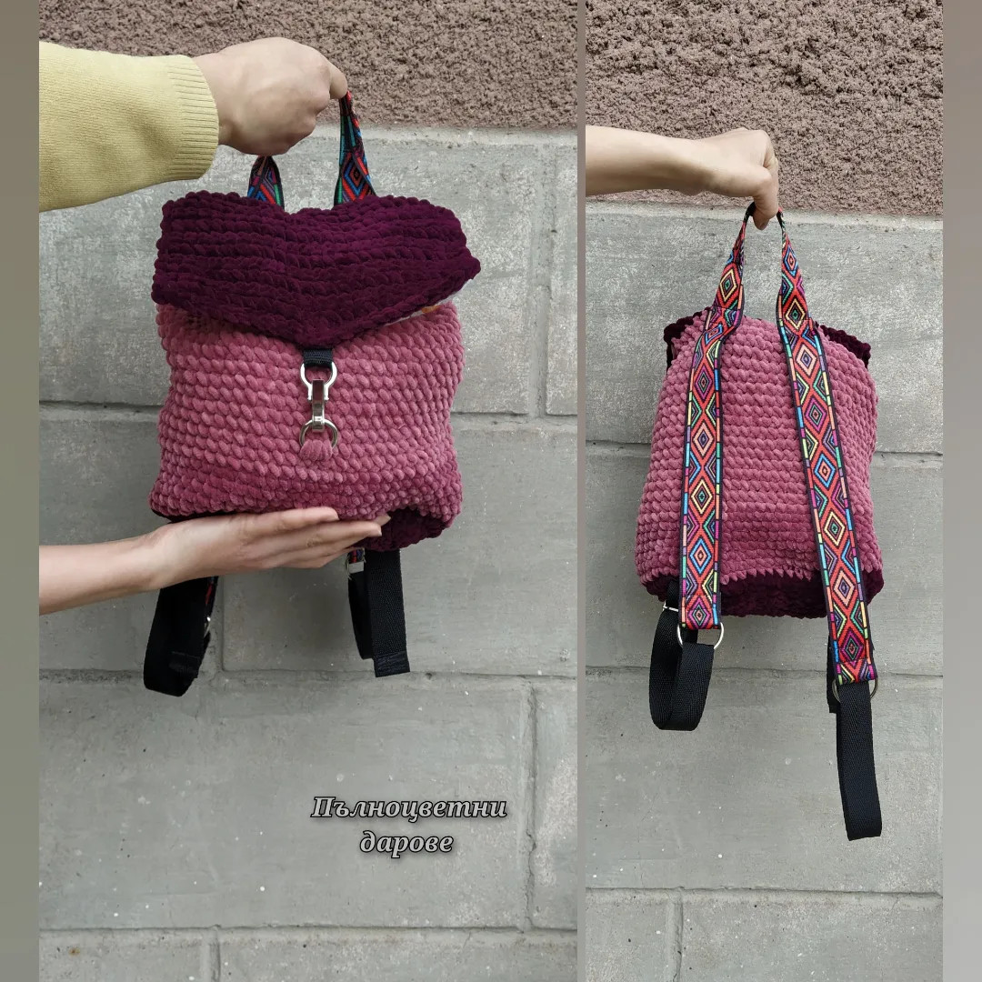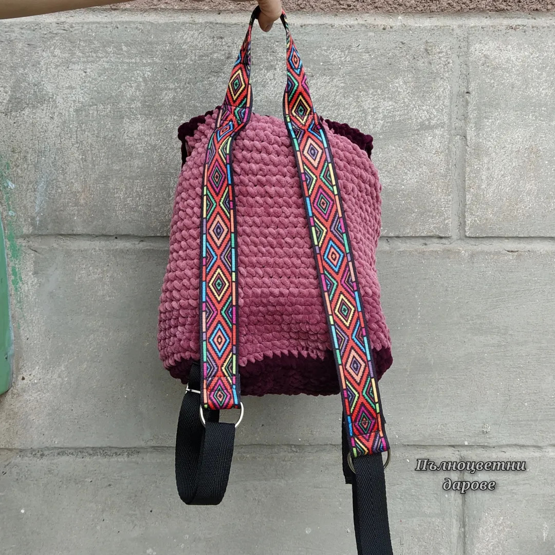 Плюшена раница с шарени тъкани дръжки, капак и подплата с вътрешен джоб. Мека, лека, гъвкава и красива. Подплата с два вътрешни джоба. Вътрешна височина 28 см. Обиколка 63 см. Дъно 25/10 см. Чудесен подарък за тинейджъри. ? По-големите деца ги харесват, защото са мекички и събират достатъчно. ? Чудесен и полезен подарък за рожден ден. ? В творенията ще откриете и други модели и цветове. ??⏩Понякога успяваме да ги изработим и по-бързо. Напишете ни съобщение. ? Пристигат опаковани в кутия с панделка, готови за подаряване. Възможно е да се добави и лично послание. Пратките се подготвят индивидуално, не се притеснявайте предварително да напишете съобщение. Поздрави! Пълноцветни дарове ?