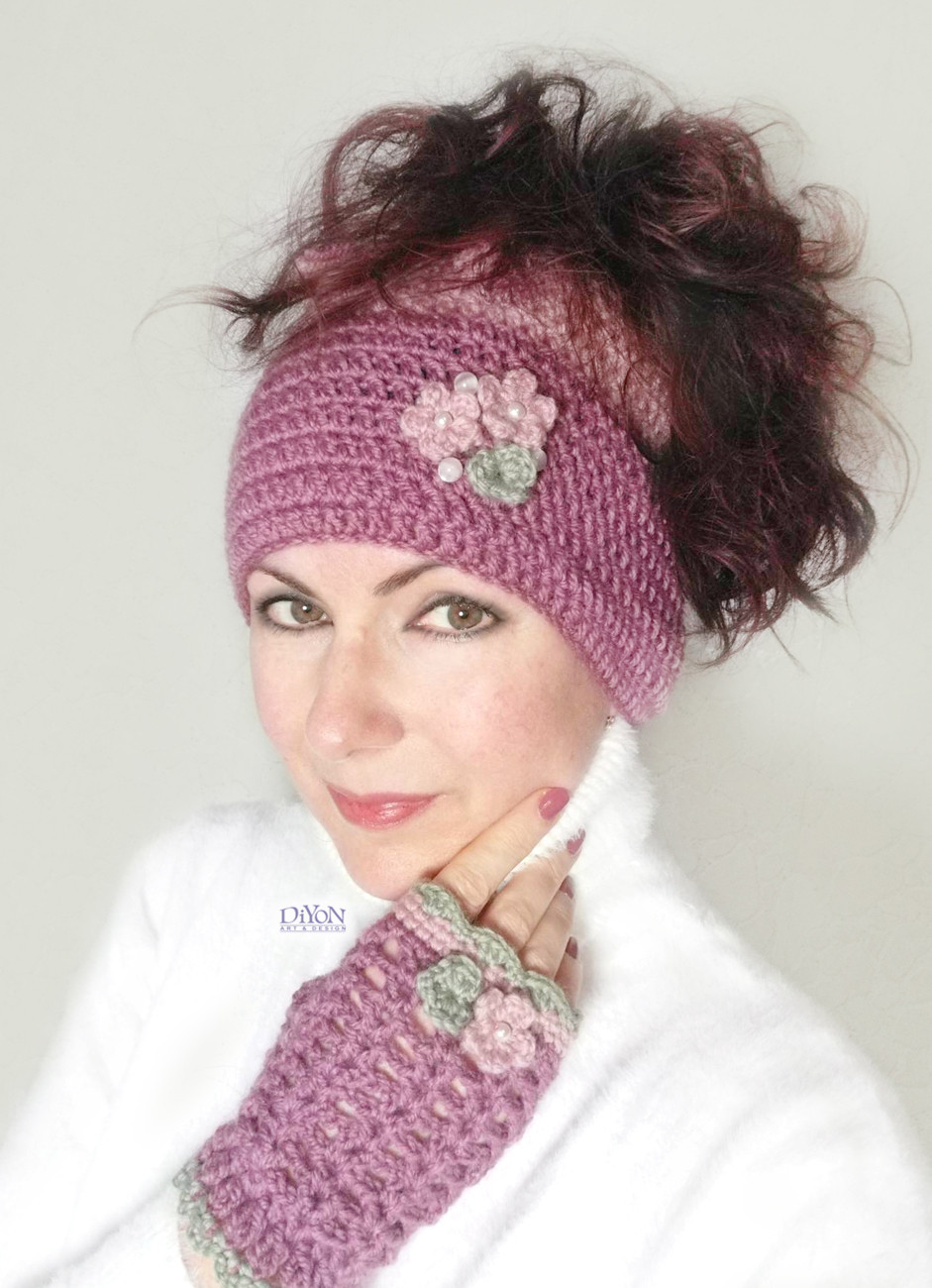 Романтични ажурни, но топли дамски ръкавици, плетени на една кука. В нежна розово - зелена гама и декорация от цветя, листа и мъниста от стъкло. С ластици на китките за удобство. С висок процент вълна.