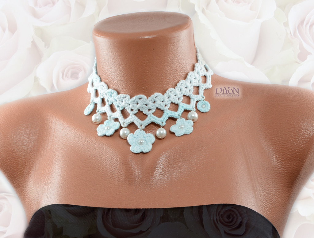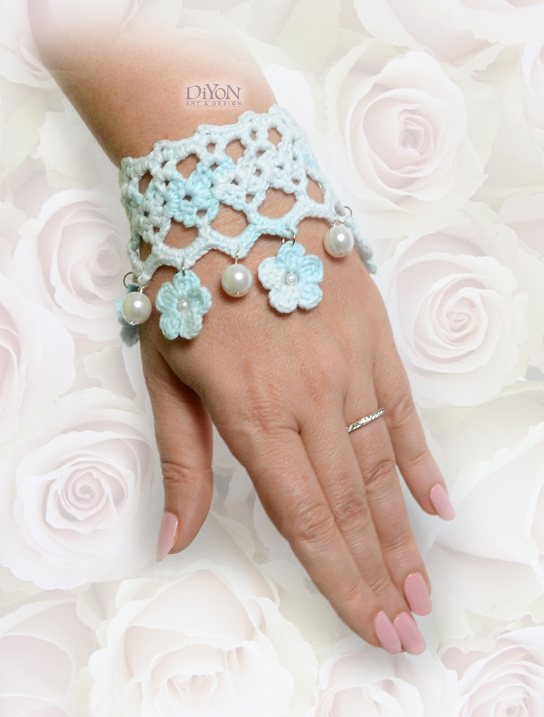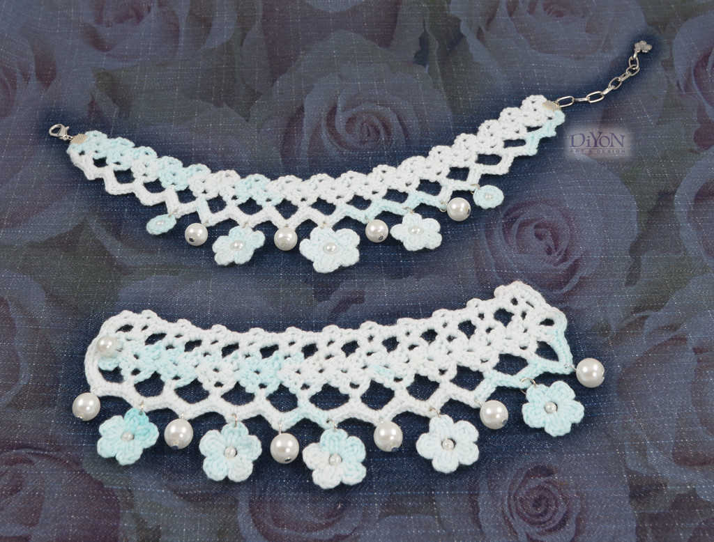Нежно плетиво от две части от дантела, изработена на една кука. Колие и гривна-маншет с украса от цветя и перли. Преждата е чист памук, а цветът бял, леко преливащ към светлосиньо. Подходящи и за ежедневна употреба, и за по-официални поводи.
