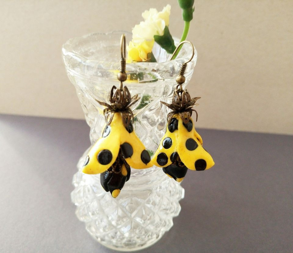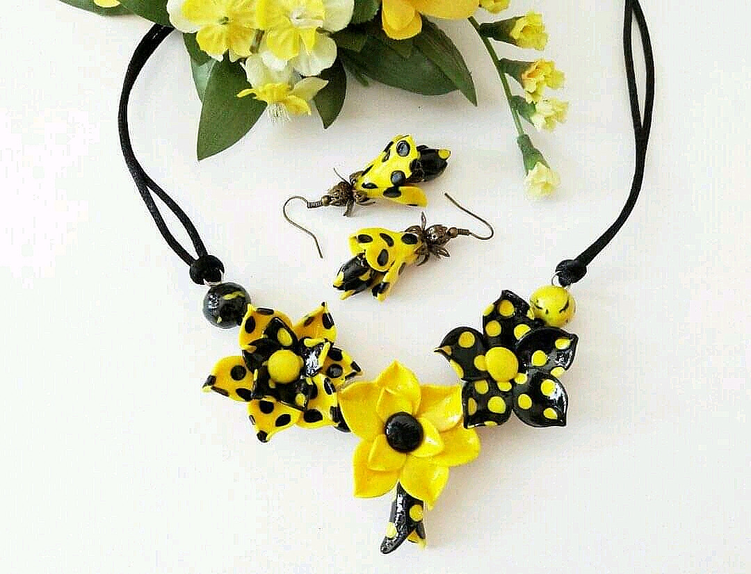 Ръчна изработка от полимерна глина. Дължина на колието 45см, размери на цветната част 8 / 4 см, на обеците - 3,5 / 2см. Глината е пластична след изпичане и все пак препоръчвам да се пази от удар и огъване!