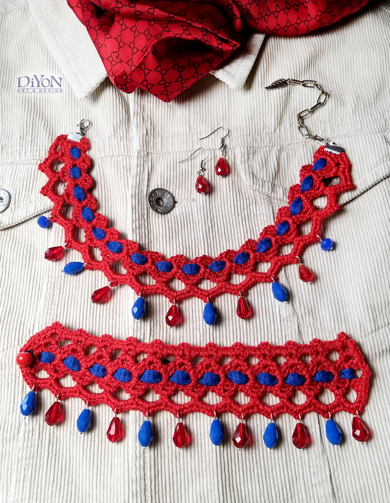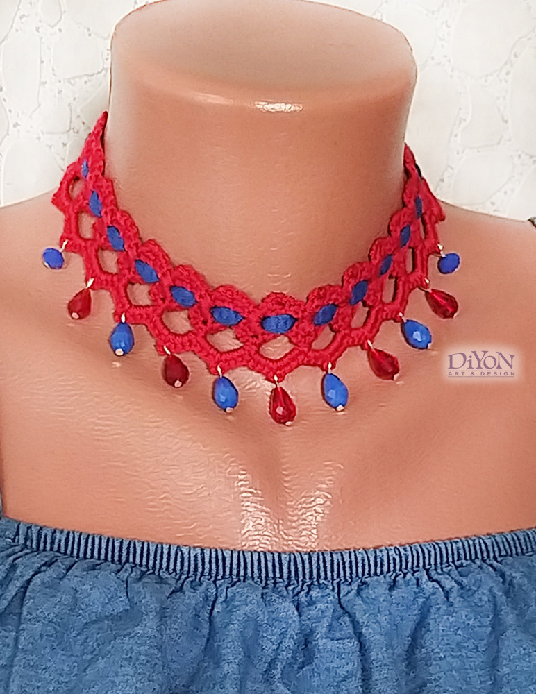 Атрактивно ръчно изплетено на една кука бижу в два ярки цвята, за смели дами. Преждата е от чист памук. Кристални капки по фасети украсяват долния края на колието. Те също се редуват в двата цвята - червен и син. Закопчалката е лесна за работа. Тя е от метал и позволява коригиране на дължината в достатъчно големи граници.