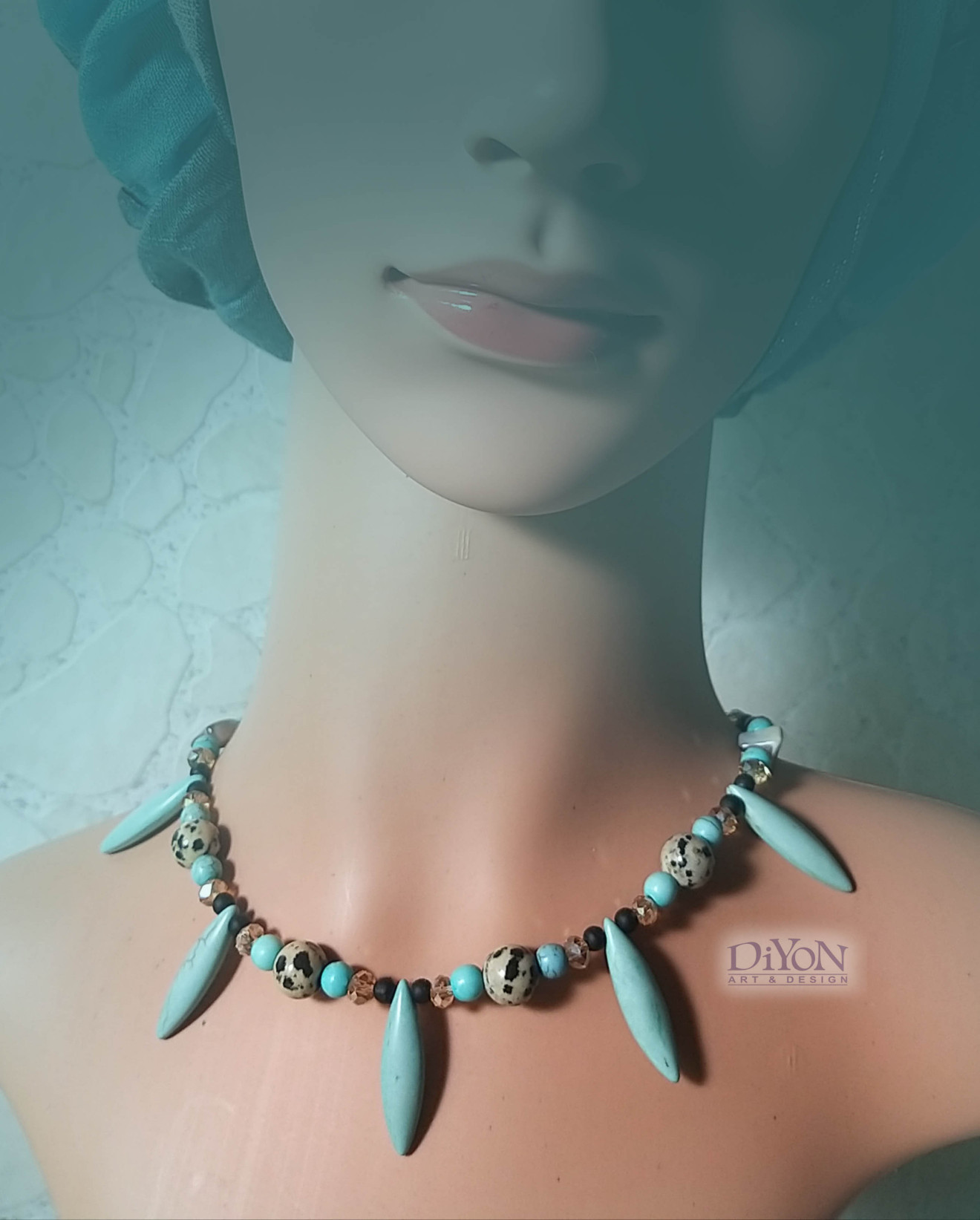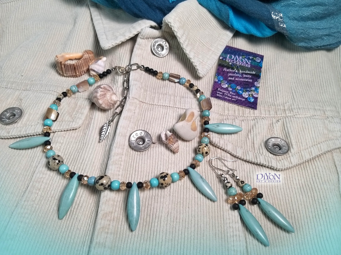 Ефектен комплект дамски бижута от полускъпоценни камъни - тюркоаз, леопардов яспис, седеф и кристали. Колието е с удобна закопчалка от метал. Обеците са дълги, висящи. Отличен избор за топлите дни и морето, но подходящ и за другите сезони.