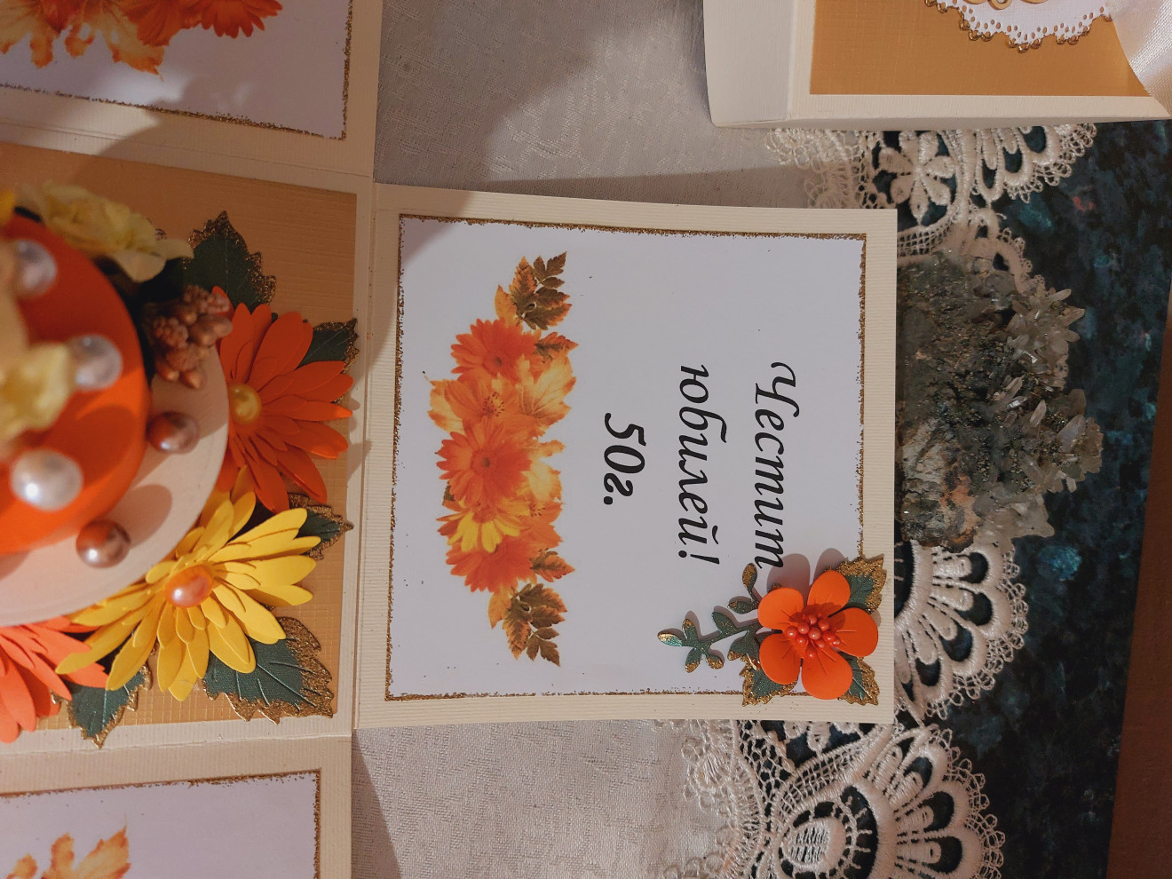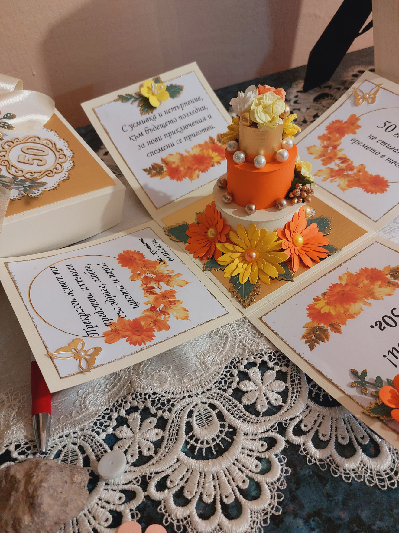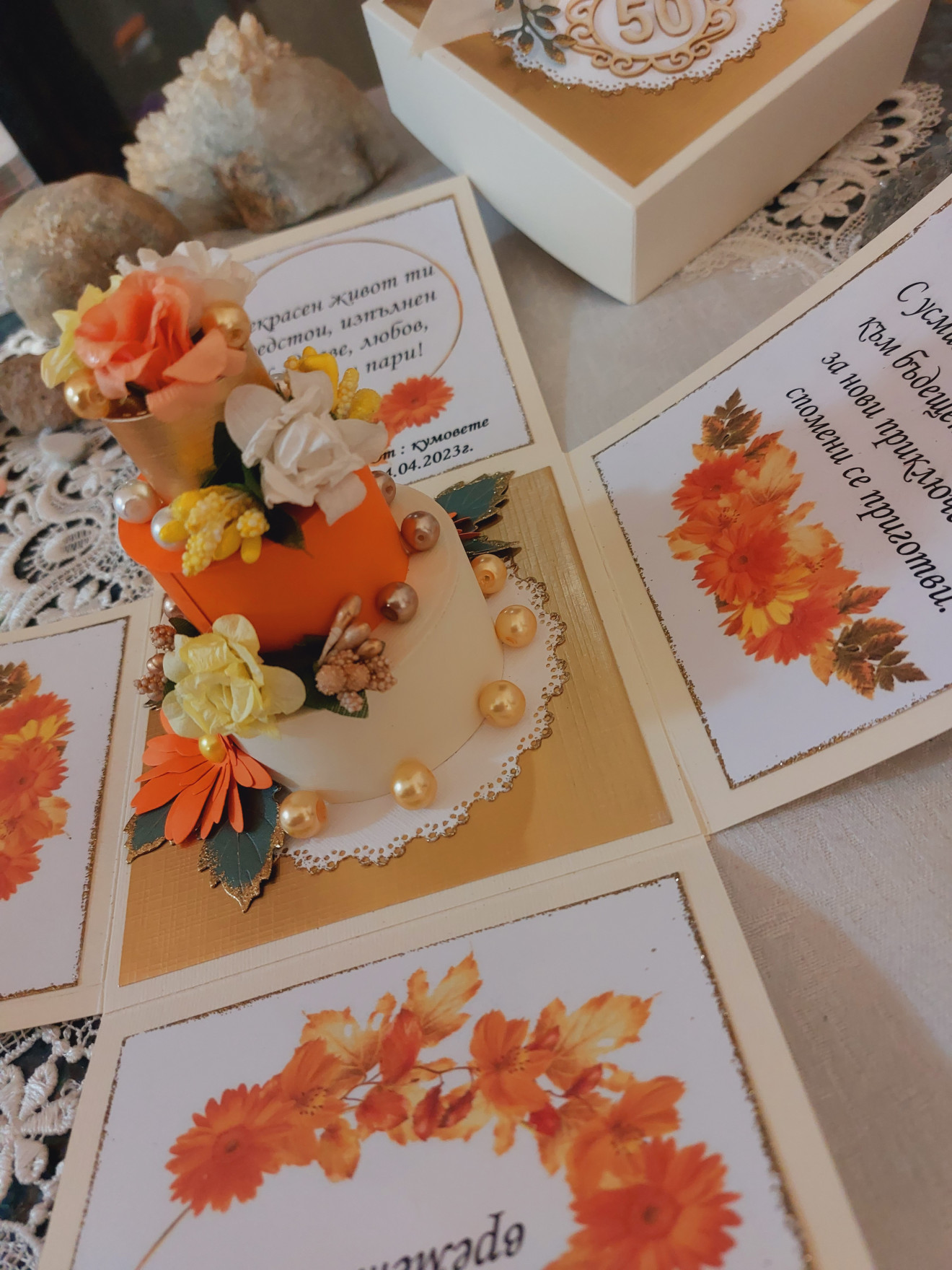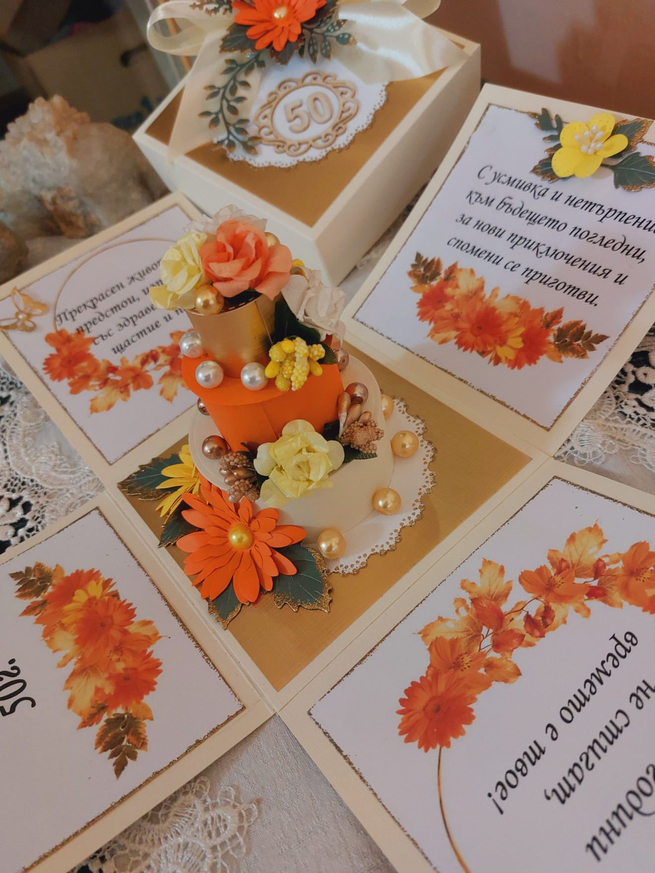 Експлодираща кутия подходяща за оригинален подарък. Кутията може да се изработи с пожелание , снимки и различни цветове и декорации съобразени с повода и вашето желание. Може да се сложи вътре подарък или да се направи място за паричен подарък.