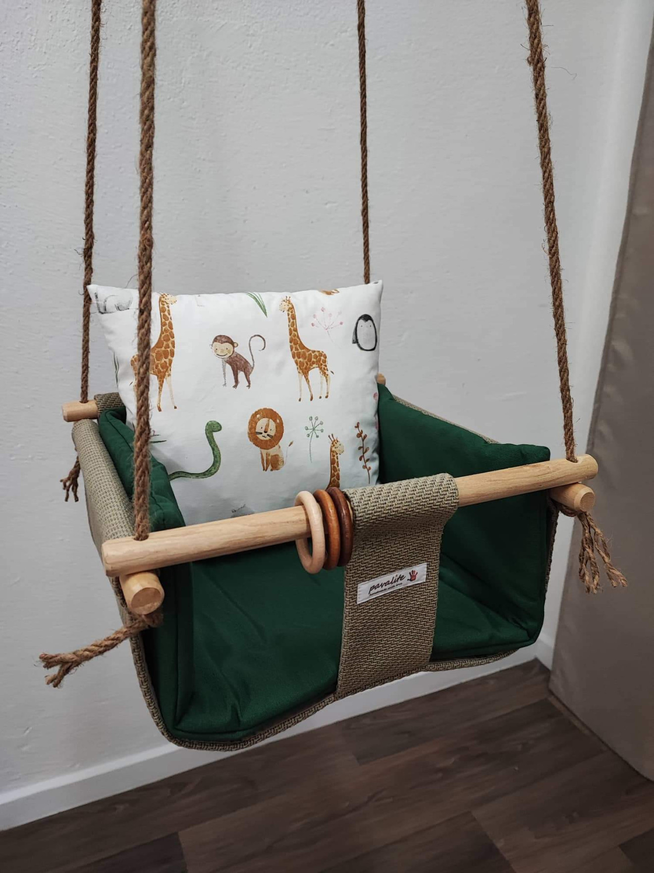Бебешка, детска люлка, подходяща за деца от 6-тия месец до 20 кг. Комплекта включва - люлка, 2бр възглавнички ( в десен по избор), въже, карабинери за захващане и 3бр. халки за игра