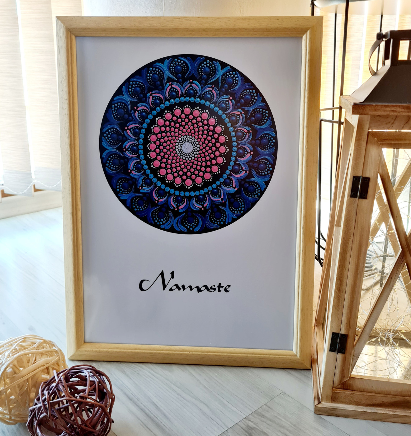 Принт/постер на авторска картина, 32/42см рамкирана с антирефлексно стъкло. Принтове има само на мандалите които рисувам постоянно. ? Розовият цвят символизира любовта, но онази, висшата, Божетсвената, кармичната. Тази, която заслужаваме да ни се даде. Розовото ще ви избави от стреса и ще ви донесе любов. Може да отключи талантите ви.Вярата в чудесата и вълшебствата- това е розовото. ? Синият цвят в мандалата е духовността. В зависимост от нюансите си, той може да въздейства по различен начин. Може да е както жертвоготовността, така и връзката с Божетсвеното. Свързва се с интуицията, с края и възраждането. В тъмните си тонове, той носи сила и воля и засилва издръжливостта ви. Действа добре на нервната система. Ако сте егоцентрик, тъмносиньото не трябва да е преобладаващ в мандалата ви. В светлите си нюанси е символ на живота и на чистотата. Засилва умението ви да се справяте с трудностите сами. ? Бяло…мир, сняг, чистота и свобода. В мандалата ще ви помогне да премахнете препятствията, но и ще ви покаже, че сте си самодостатъчни. Ще ви донесе вяра в собствените сили. Означава, че вие сте готови за ново начало и го започвате. Обновява енергията ви и оздравява организма. Бялото изчиства ума ви и ви подготвя за духовно развитие. Това е цвета на магията и на тайните учения. Изображенията са със запазени авторски права ! Работя с ЕКОНТ ! Мога да издам фактура !