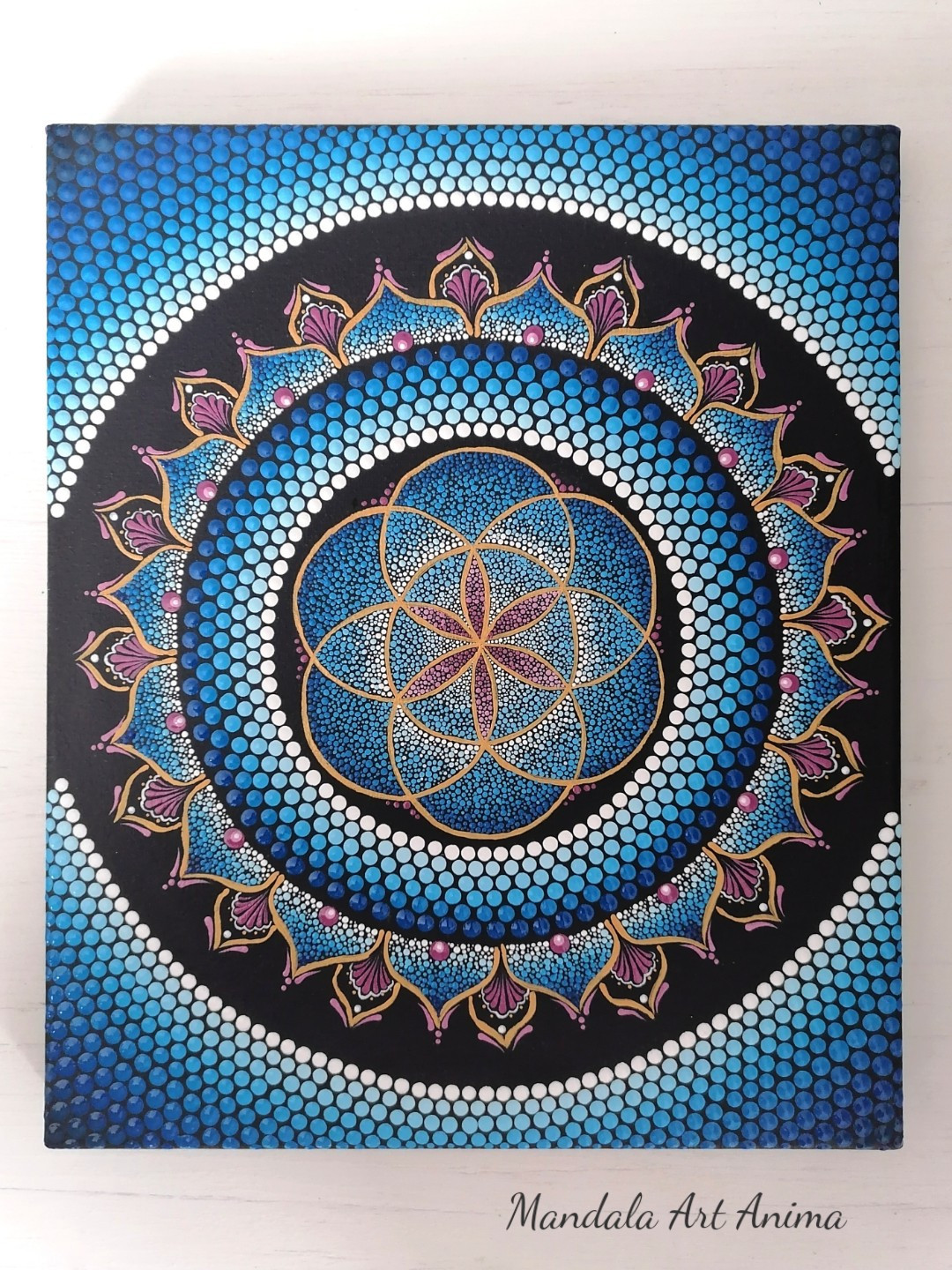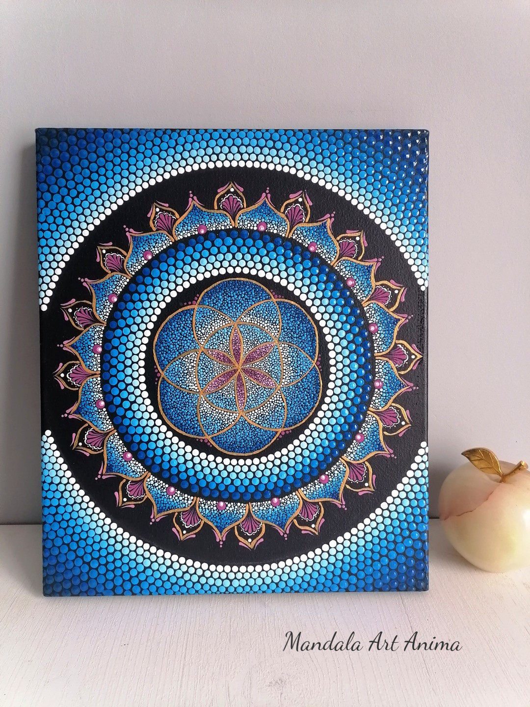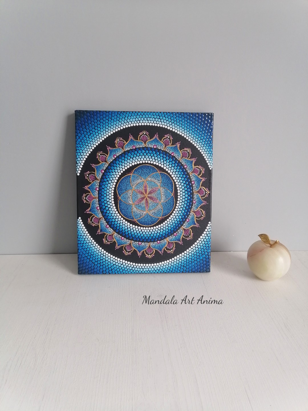 Платното е памучно, с размер 25/30см. Опънато е върху подрамка. Рисунката е изцяло направена на ръка,точка по точка, и чертичка по чертичка. ? Изрисувана е с акрилни бои, и краен защитен лак. ??️ В центъра на Мандалата е Семето на живота.Това е един от най-разпространените символи от сакралната геометрия.⚛️ Символизира сътворението - на Вселената, на материалния свят, на всеки един от нас... Структурата на този символ е идентична с клетъчната структура и делението / сътворението на човешкия ембрион. Мога да изрисувам подобно в цветове, според Вашите желания и нужди, и в размер, който би ви удовлетворил. :) Цената варира според размера. ?