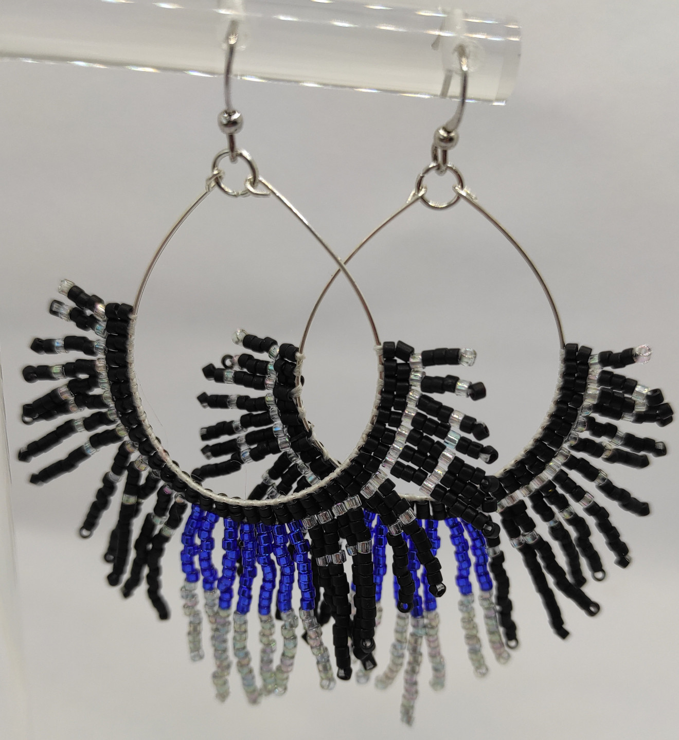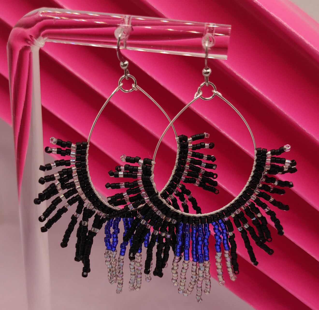 Разкошни бохо обици - японски стъклени мъниста Миюки върху сребърна бижутерска тел проба 925. Дълги 8 см, широки 5,5 см в най-широката им част.