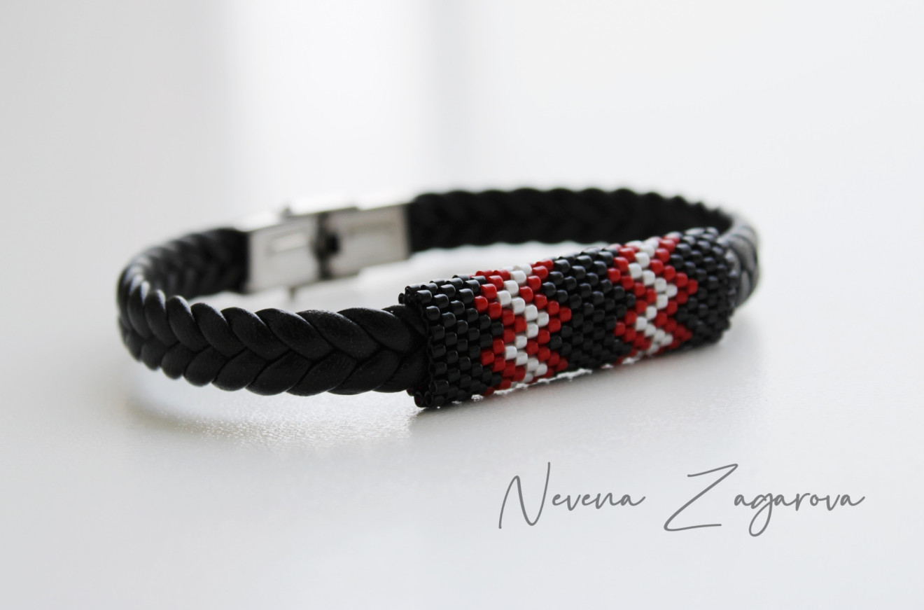 Мъжка кожена гривна израбовтена от естествена кожа, мъниста и закопчалка от медицинска стомана. Красив и стилен аксесоар, подходящ подарък за мъж или младеж. Дължина: 19 - 20 см. Подаръчно опаковано в луксозна бижутерска кутийка.