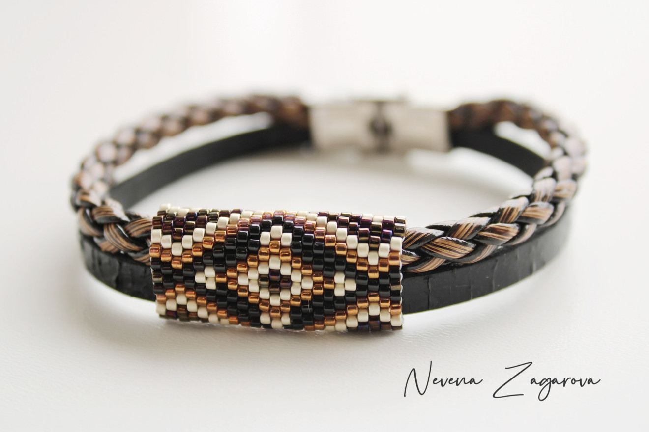 Ръчно изработена мъжка гривна от естествена кожа, закопчалка от медицинска стомана и мъниста. Подарък за мъж подходящ за всеки повод. Дължина: 19-20 см.