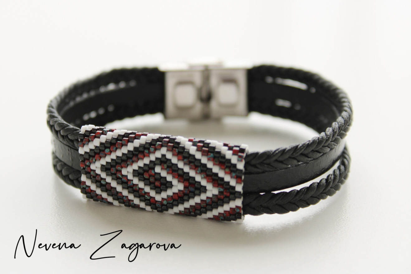 Ръчно изработена мъжка гривна от естествена кожа, мъниста и закопчалка от медицинска стомана.