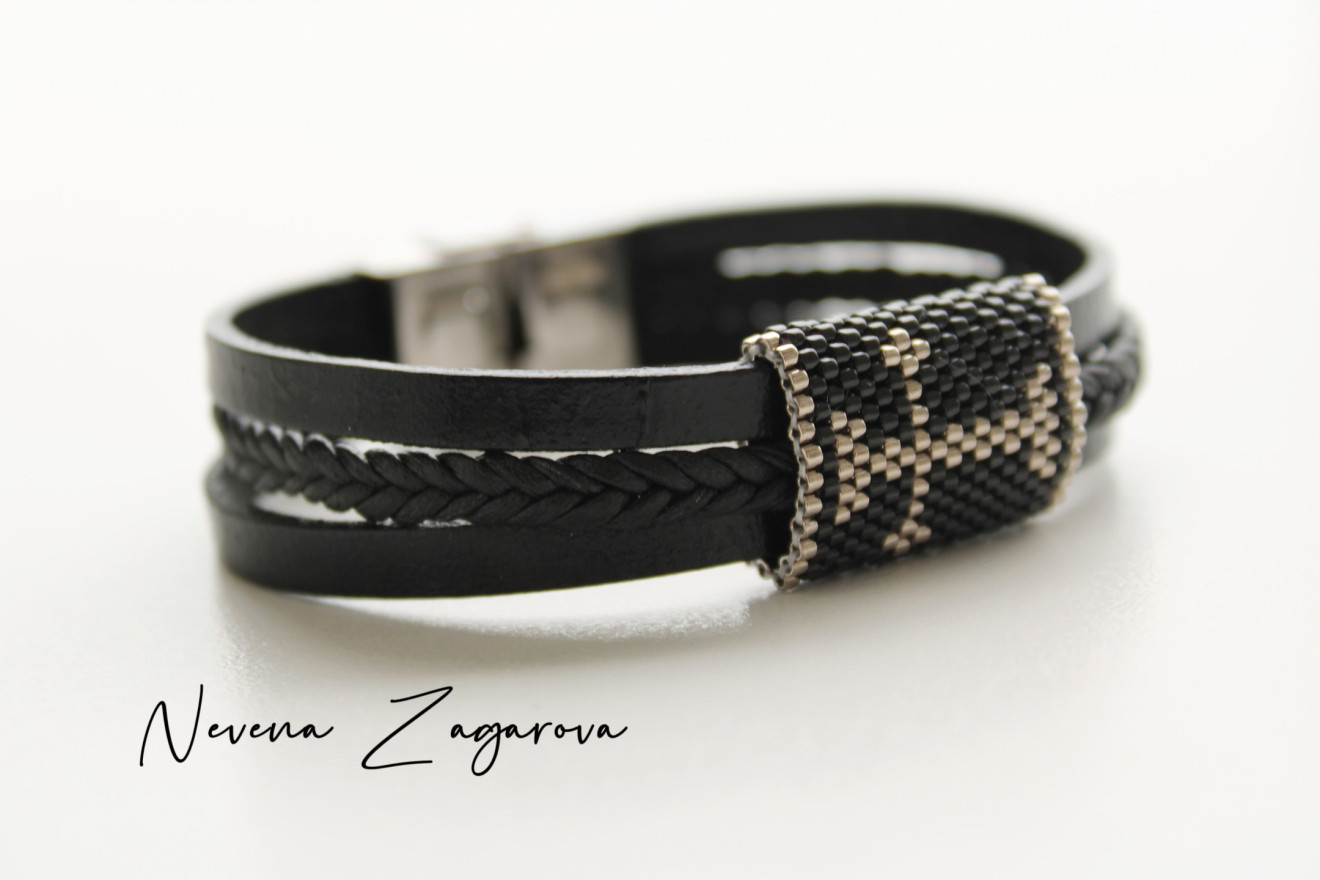 Ръчно изработена мъжка гривна от естествена кожа, мъниста и закопчалка от медицинска стомана. Подходящ подарък за мъж по всеки повод. Дължина: 19- 20 см.