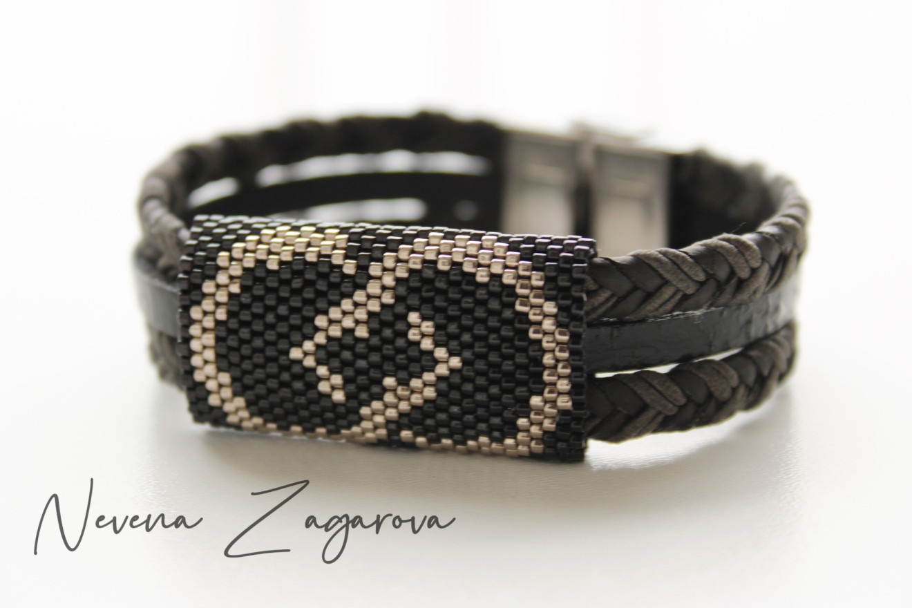 Ръчно изработена мъжка гривна от естествена кожа, мъниста и закопчалка от медицинска стомана.