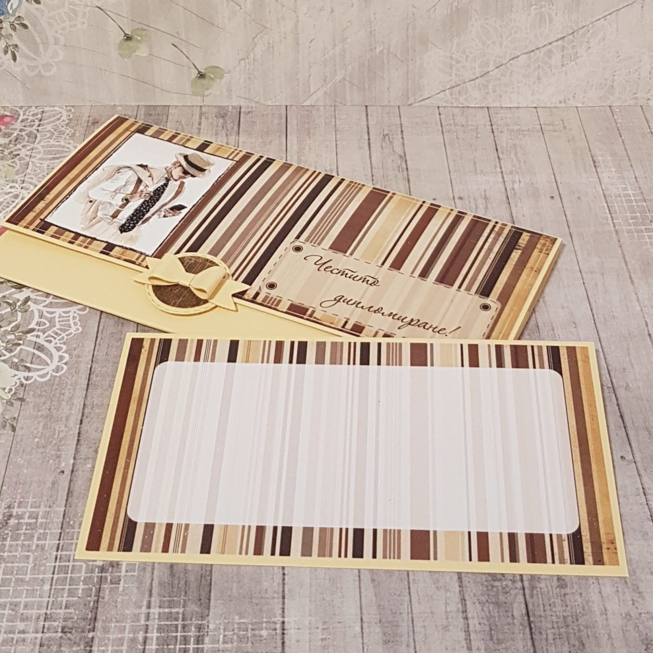 • Мъжка картичка-плик за абитуриентски бал в кафяво и екрю., с надпис "Честито дипломиране!" • От вътрешната страна има джобче за банкнота и цветно картонче с място за пожелание. • Може да се персонализира. • Затваря се с магнит. • Размер: 10х19см. • Срок за изработка: 2-3 дни. • Автор: ФлориАртс бутик