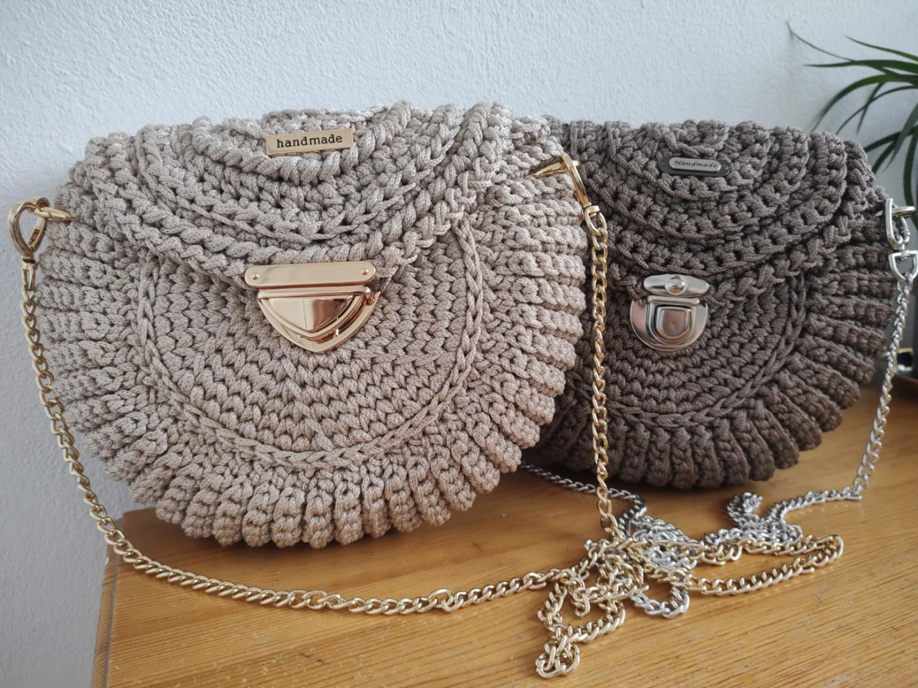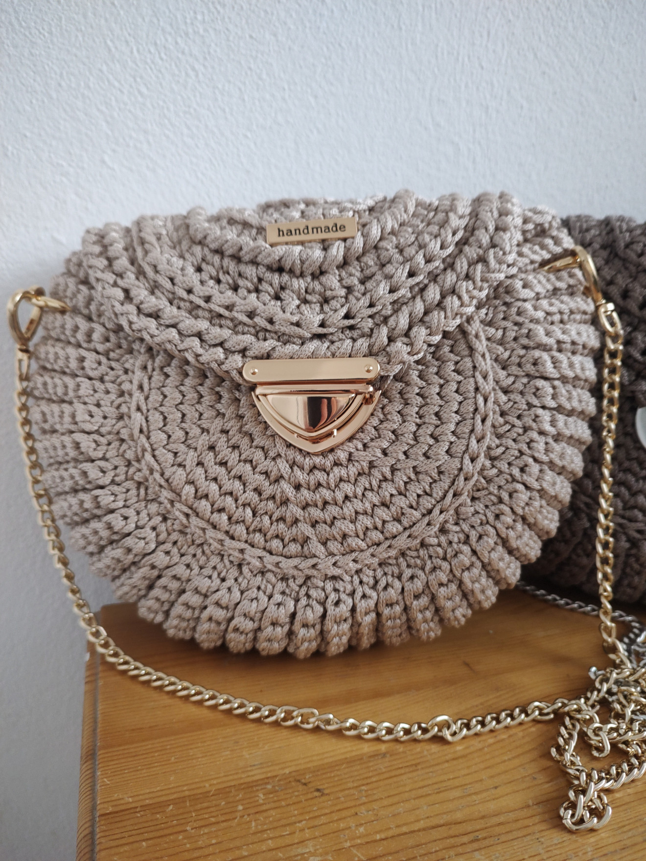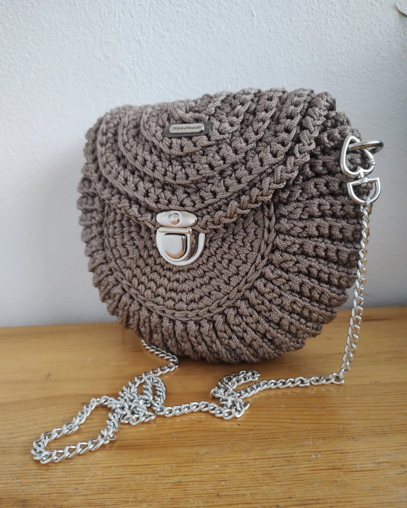 Изплетена на една кука в страхотен тъмно бежово в комбинация с сребристи метални елементи. Лека, удобна и много ефектна . Може да се изработи в желан цвят . Има наличен един брой има я и в екрю със златни елементи