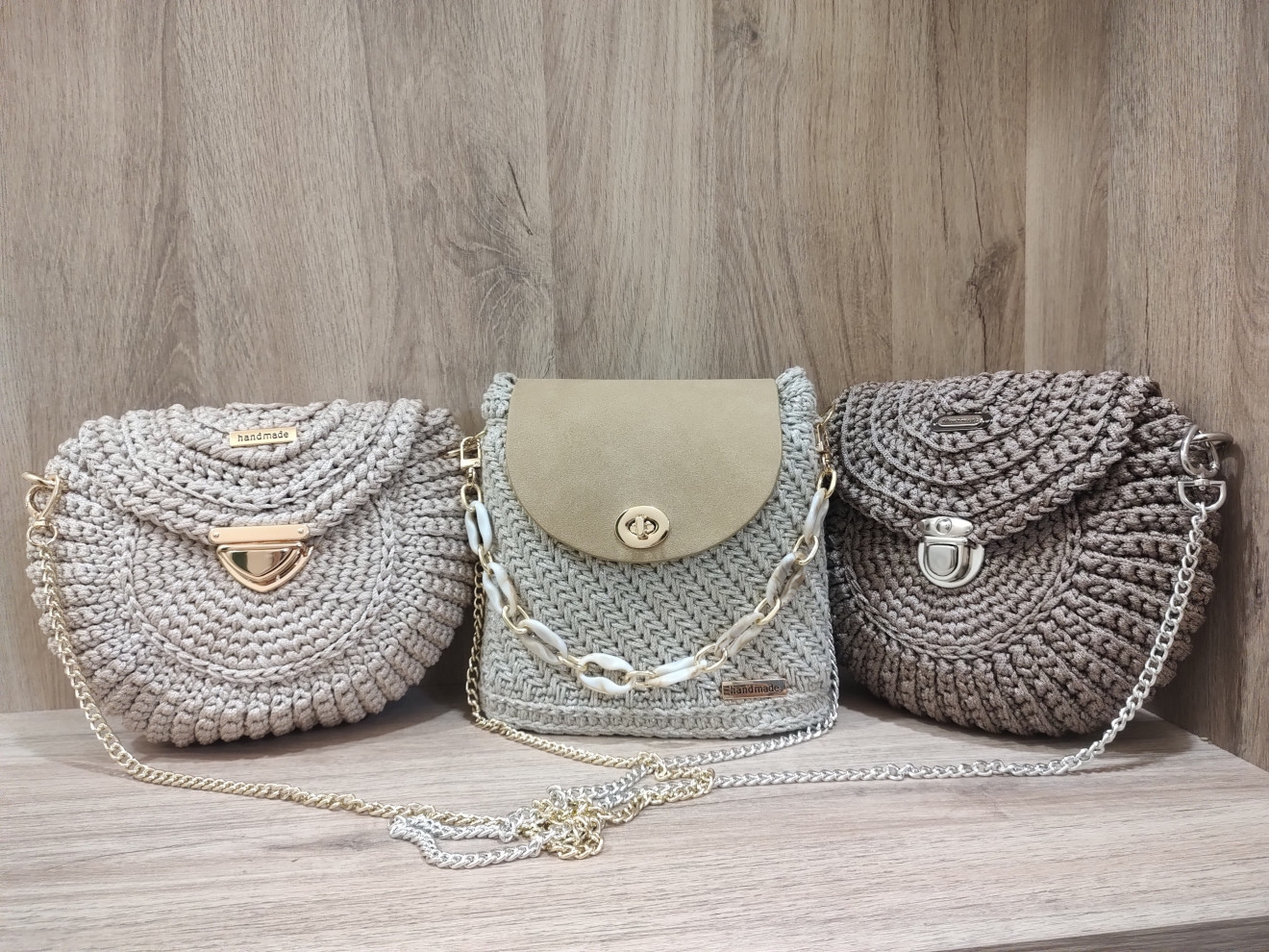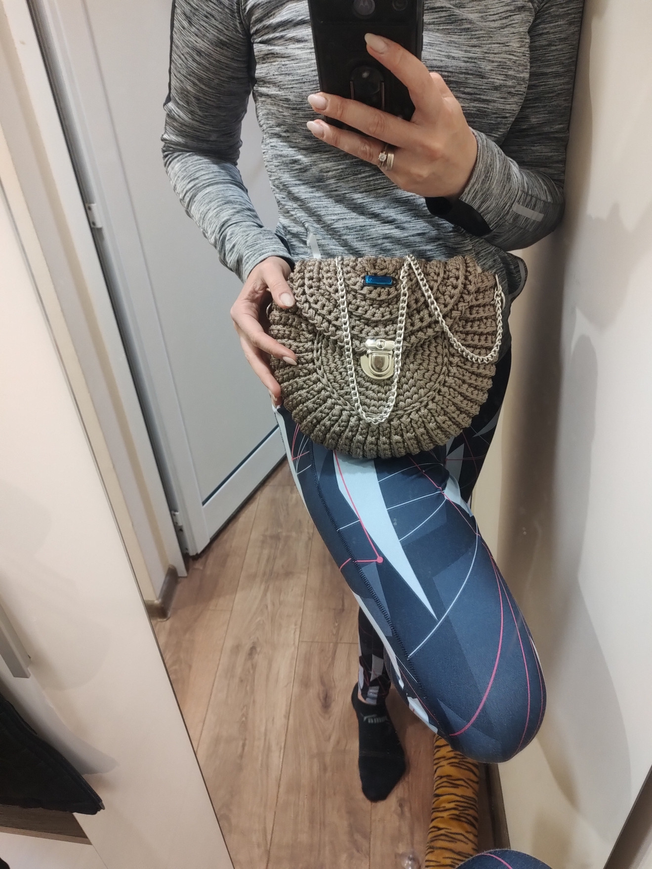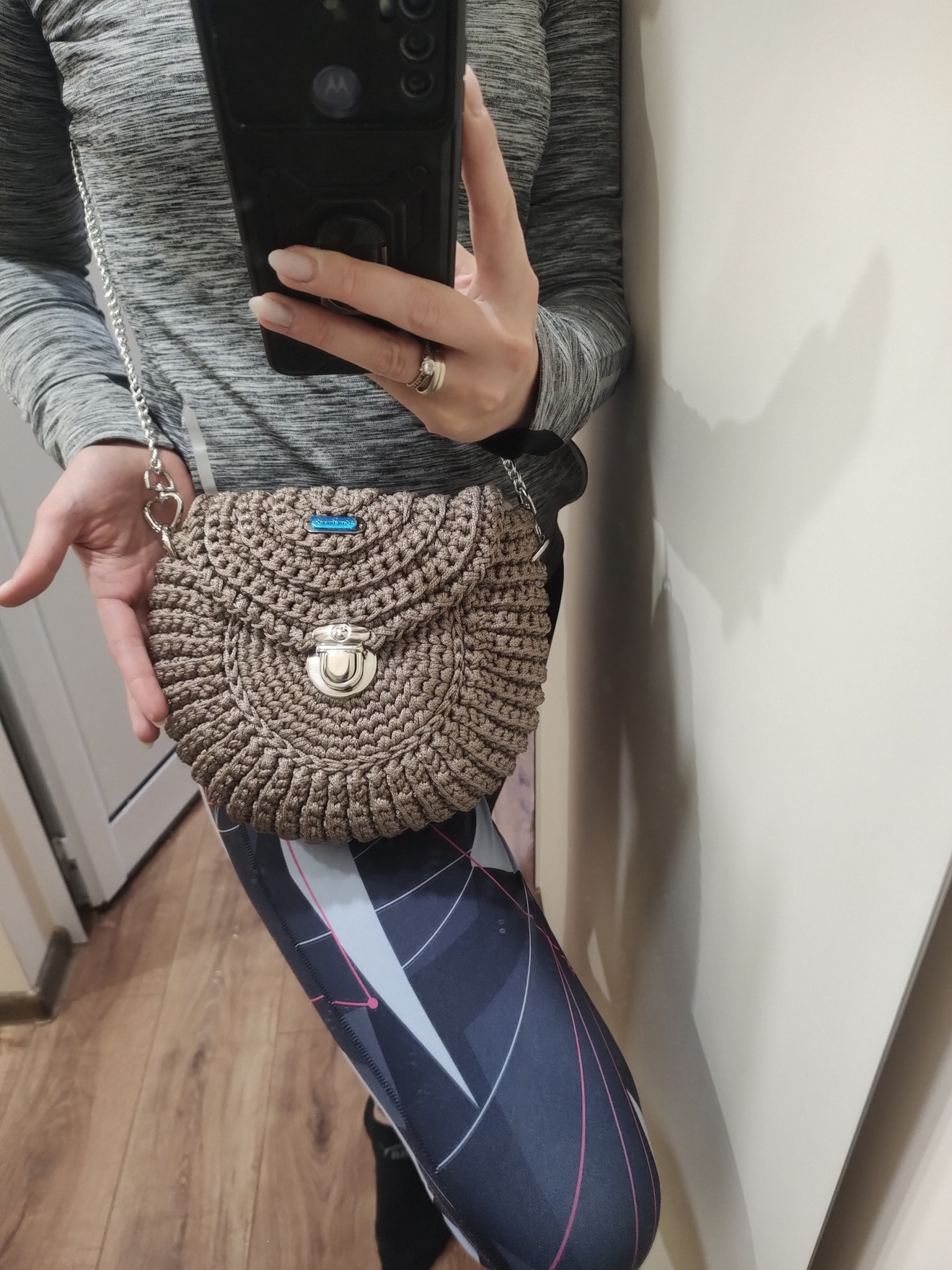 Изплетена на една кука в страхотен тъмно бежово в комбинация с сребристи метални елементи. Лека, удобна и много ефектна . Може да се изработи в желан цвят . Има наличен един брой има я и в екрю със златни елементи