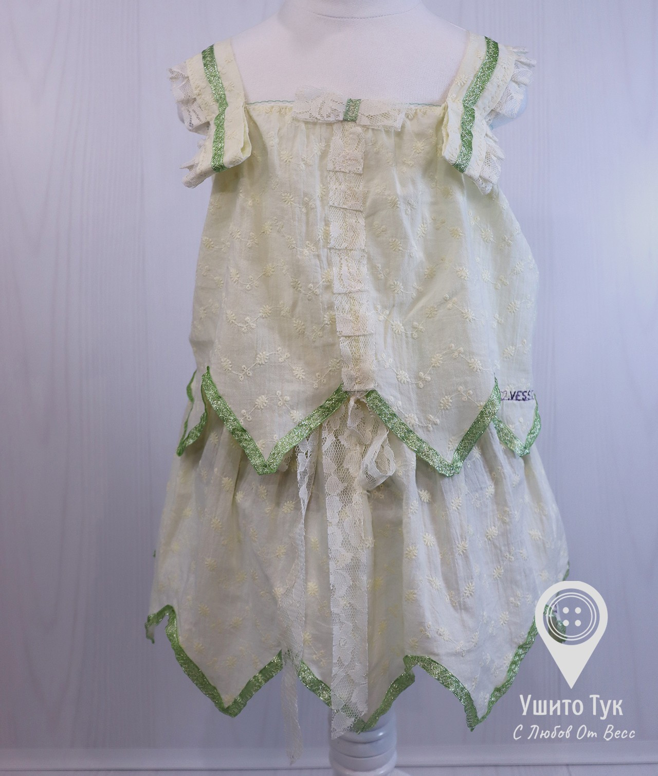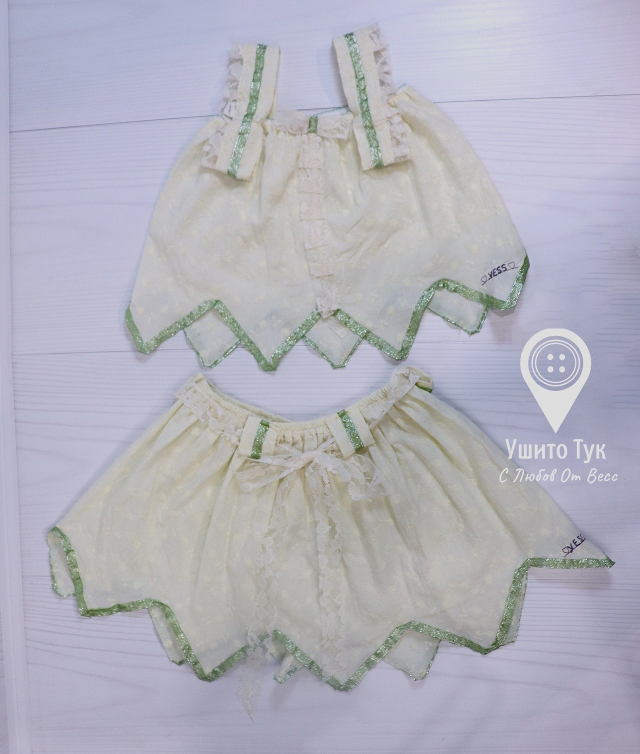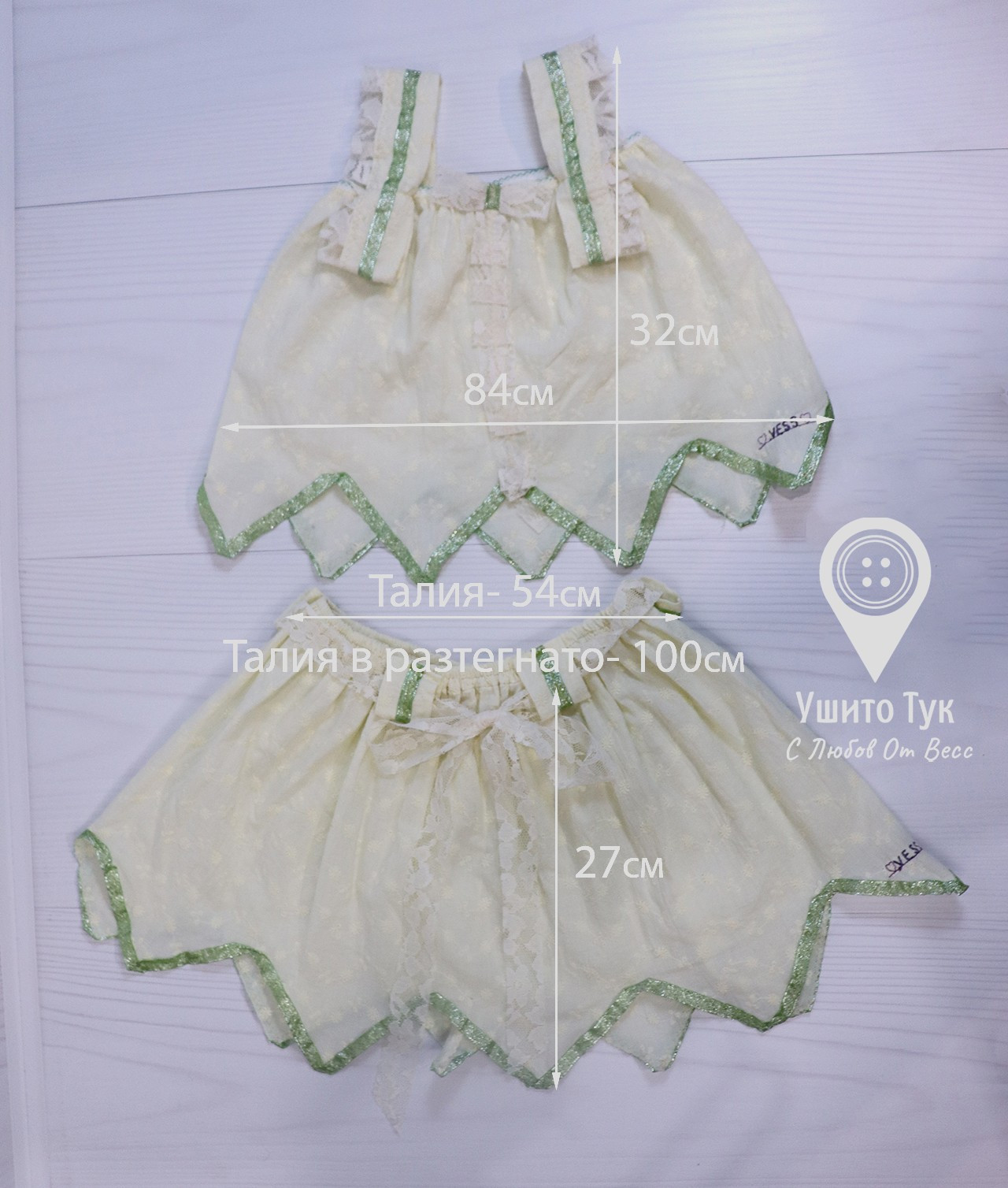 Нежно лятно костюмче от фин памучен плат с рязана бродерия. Състои се от две части- интересна поличка завършваща с триъгълници с бляскав ширит, а талията е ластична и за допълнителна украса има дантелено коланче и потниче завършващо както поличката, което може да се носи и като туника. Малкото ви слънчице ще се чувства приятно и комфортно в топлите летни дни с него. Продукта е бутиков и е единична бройка. Размерите са означени на снимка в описанието! Препоръчва се пране на ръка или на деликатна програма и гладене при необходимост със слаба ютия. Възможно е цветовете на снимките да изглеждат различно, спрямо устройството което използвате!