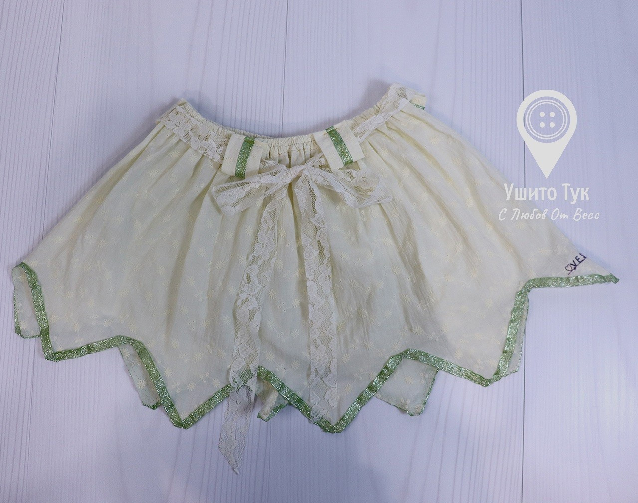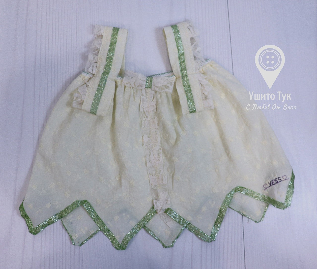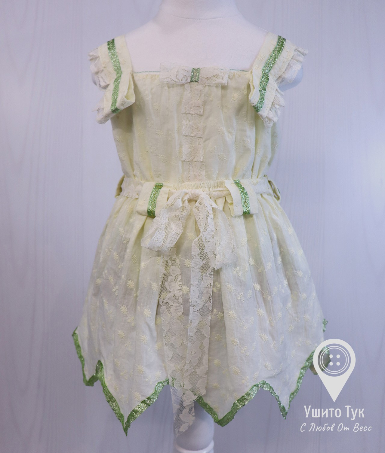 Нежно лятно костюмче от фин памучен плат с рязана бродерия. Състои се от две части- интересна поличка завършваща с триъгълници с бляскав ширит, а талията е ластична и за допълнителна украса има дантелено коланче и потниче завършващо както поличката, което може да се носи и като туника. Малкото ви слънчице ще се чувства приятно и комфортно в топлите летни дни с него. Продукта е бутиков и е единична бройка. Размерите са означени на снимка в описанието! Препоръчва се пране на ръка или на деликатна програма и гладене при необходимост със слаба ютия. Възможно е цветовете на снимките да изглеждат различно, спрямо устройството което използвате!