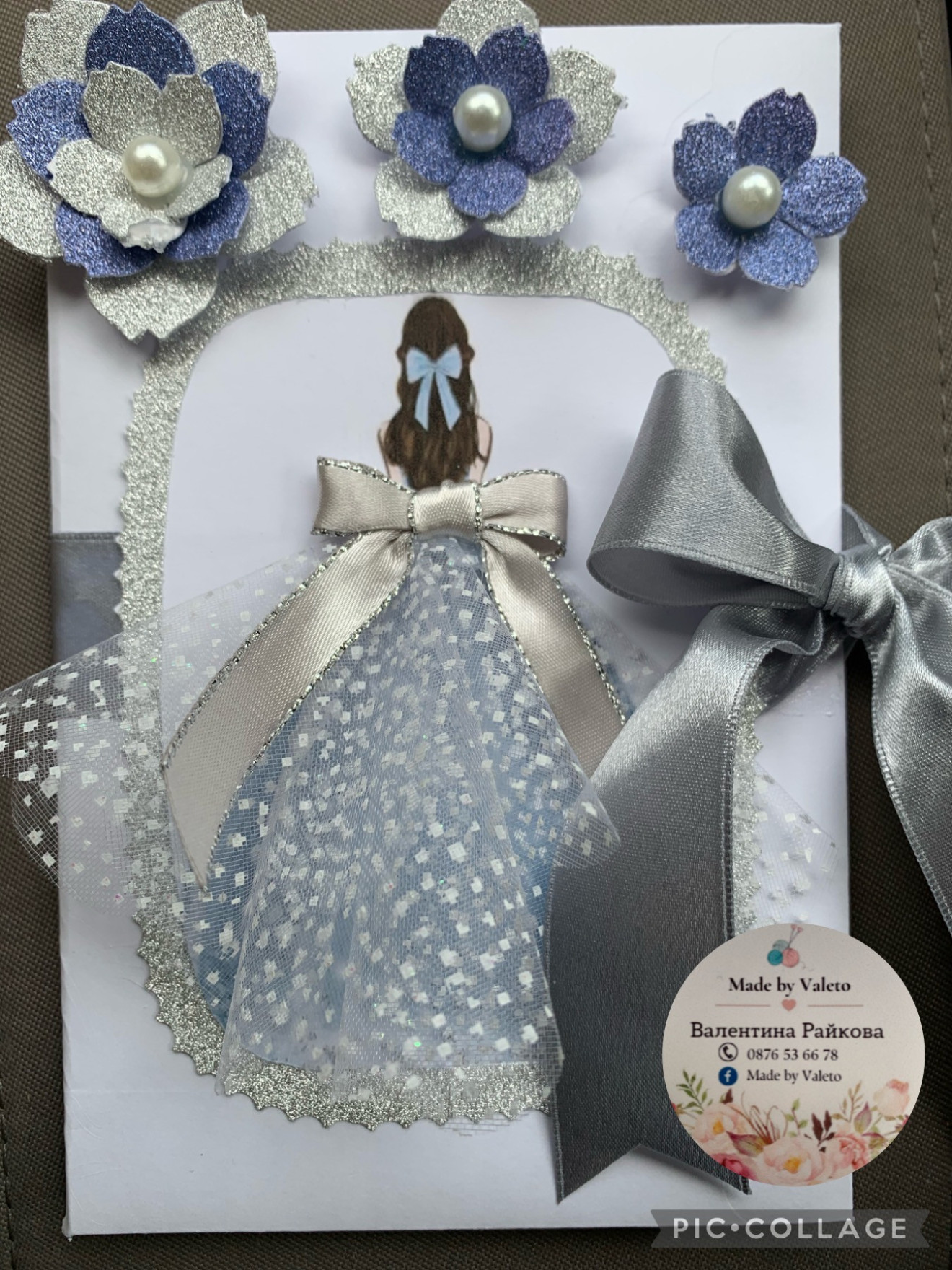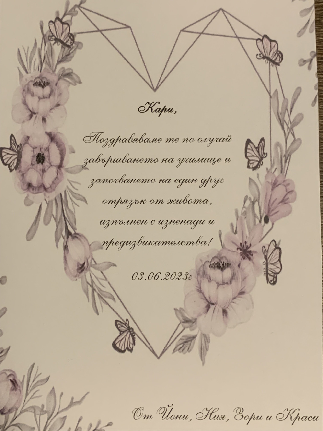 Картичка-плик с пожелание. Може да бъде изработена в цвят и пожелание по избор. Цената и времето за изработка се определят в зависимост от поръчката.